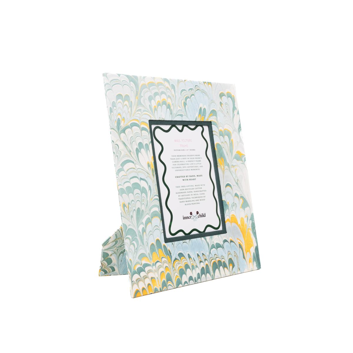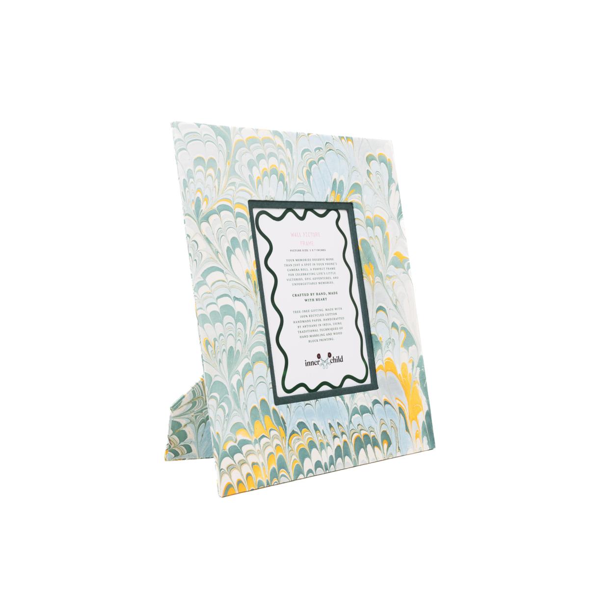 Your memories deserve more than just a spot in your phone’s camera roll. A perfect frame for celebrating life’s little victories, epic adventures, and unforgettable memories. Tree-free gifting. Made with 100% recycled cotton handmade paper. Handcrafted by artisans in India, using traditional techniques of hand marbling. There is a wall hanging attachment on the back of this frame for dual use.