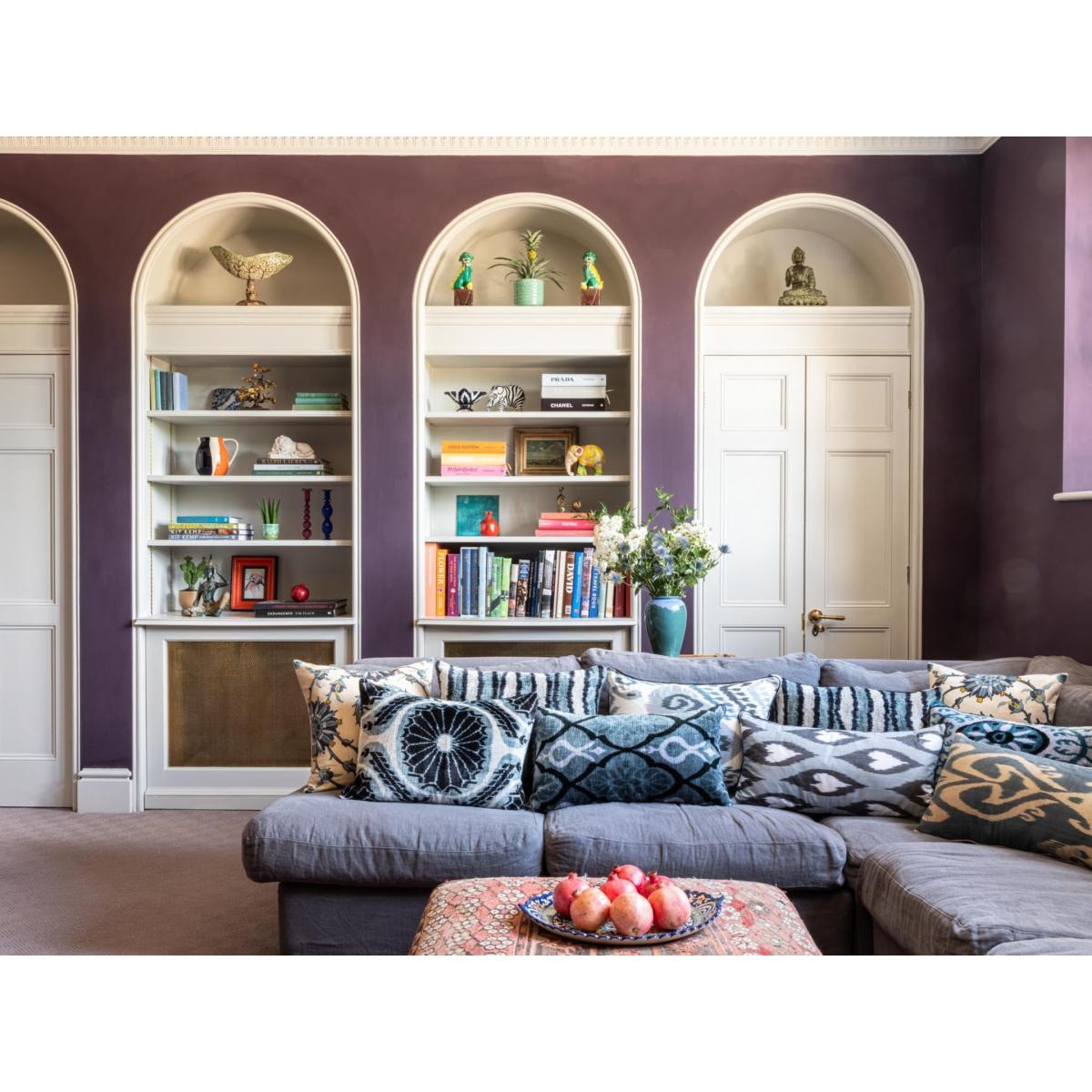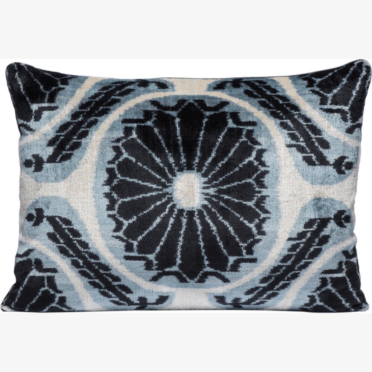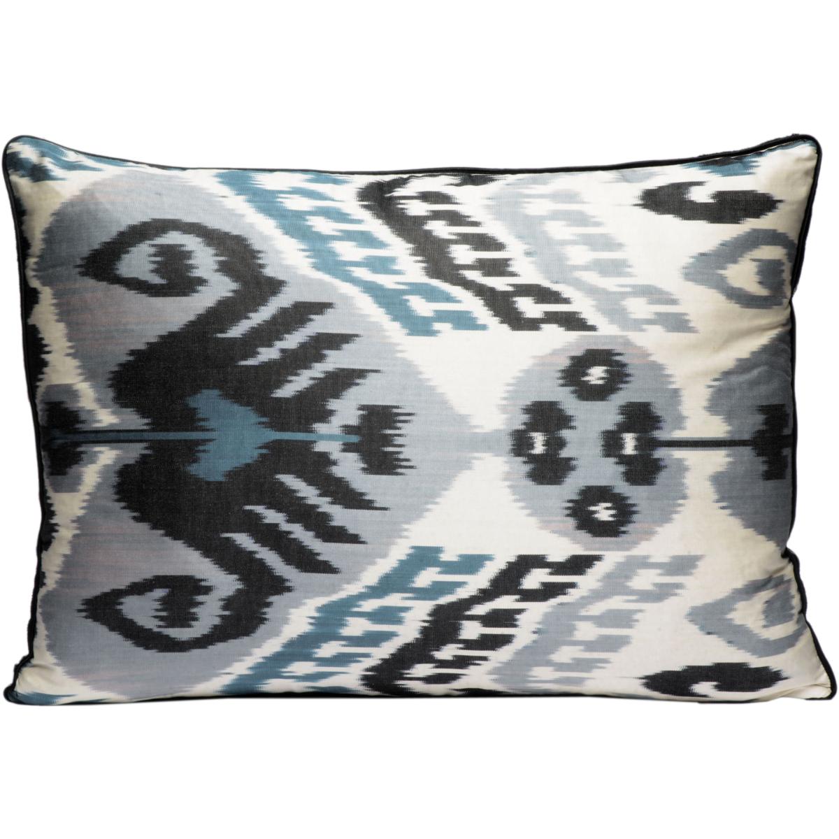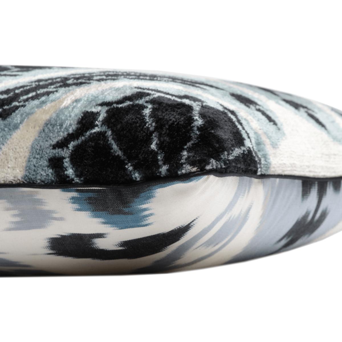 Theses stunning hand-woven reversible Water Mill Ikat cushions are made from hand-woven and hand-dyed silk velvet fabric, known in Uzbekistan as Bakhmal. It is a velvet fabric with a silk pile, based on a silk and cotton background. The Ikat technique which is used to create this beautiful fabric produces a distinctive vibrancy of colour and design evident in these cushions. Due to the hand-made techniques used in the creation of our fabrics, there may be slight variations in patterns and colours in the material, which all adds to the unique nature of our cushions. Double faced Silk Velvet Ikat cushion finished with a black piping. Front in hand-woven Silk Velvet, reverse hand-woven Silk Ikat.
