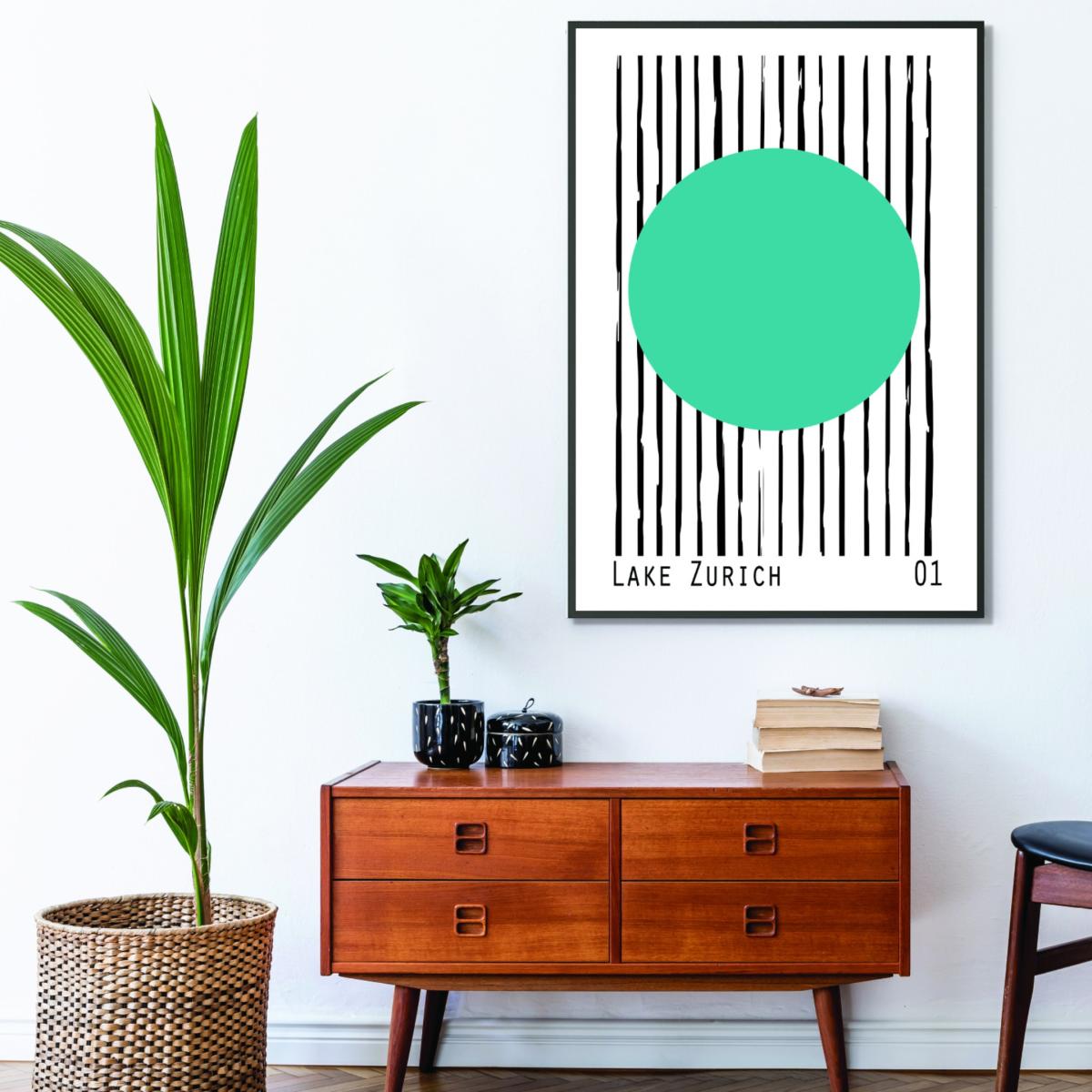 I love the Blue Lake Zurich print for its minimalist, modern aesthetic-its clean lines and bold colour make it a versatile piece. It works particularly well in contemporary interiors, whether set against neutral wall colours or within more eclectic spaces that embrace colour and pattern. Practical styling tips include pairing it with simple, understated frames to keep the focus on the design or positioning it above a sofa or console table to create a focal point. Its size makes it ideal for filling larger wall spaces or creating an impactful gallery wall when combined with other prints. Overall, it's a clever piece that adds a splash of colour while maintaining a sleek, uncluttered look.