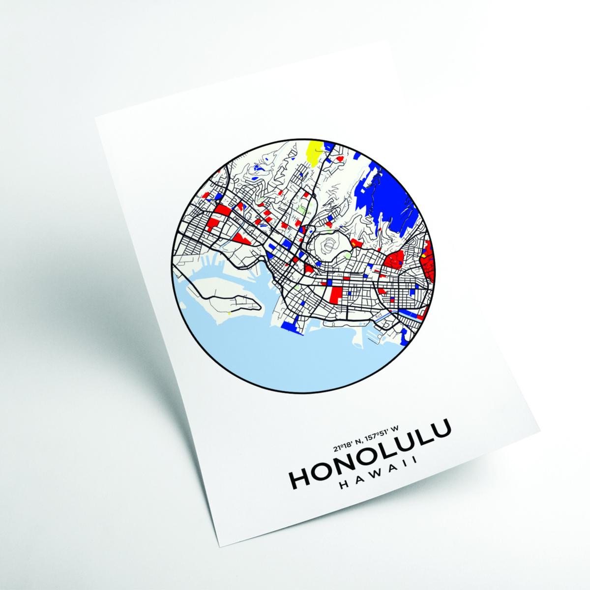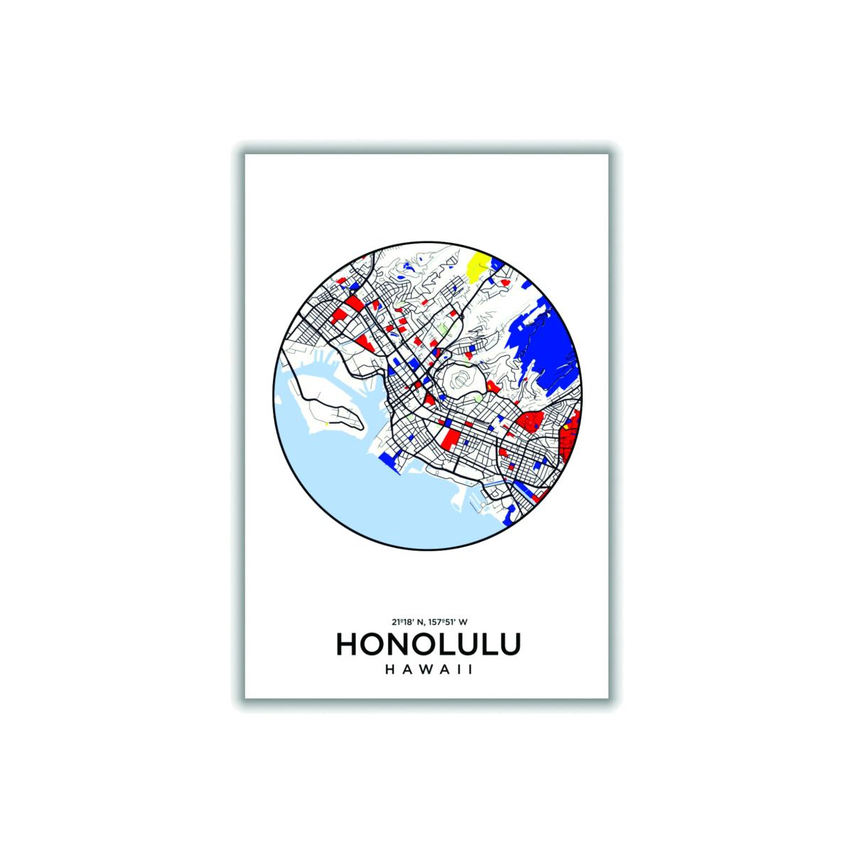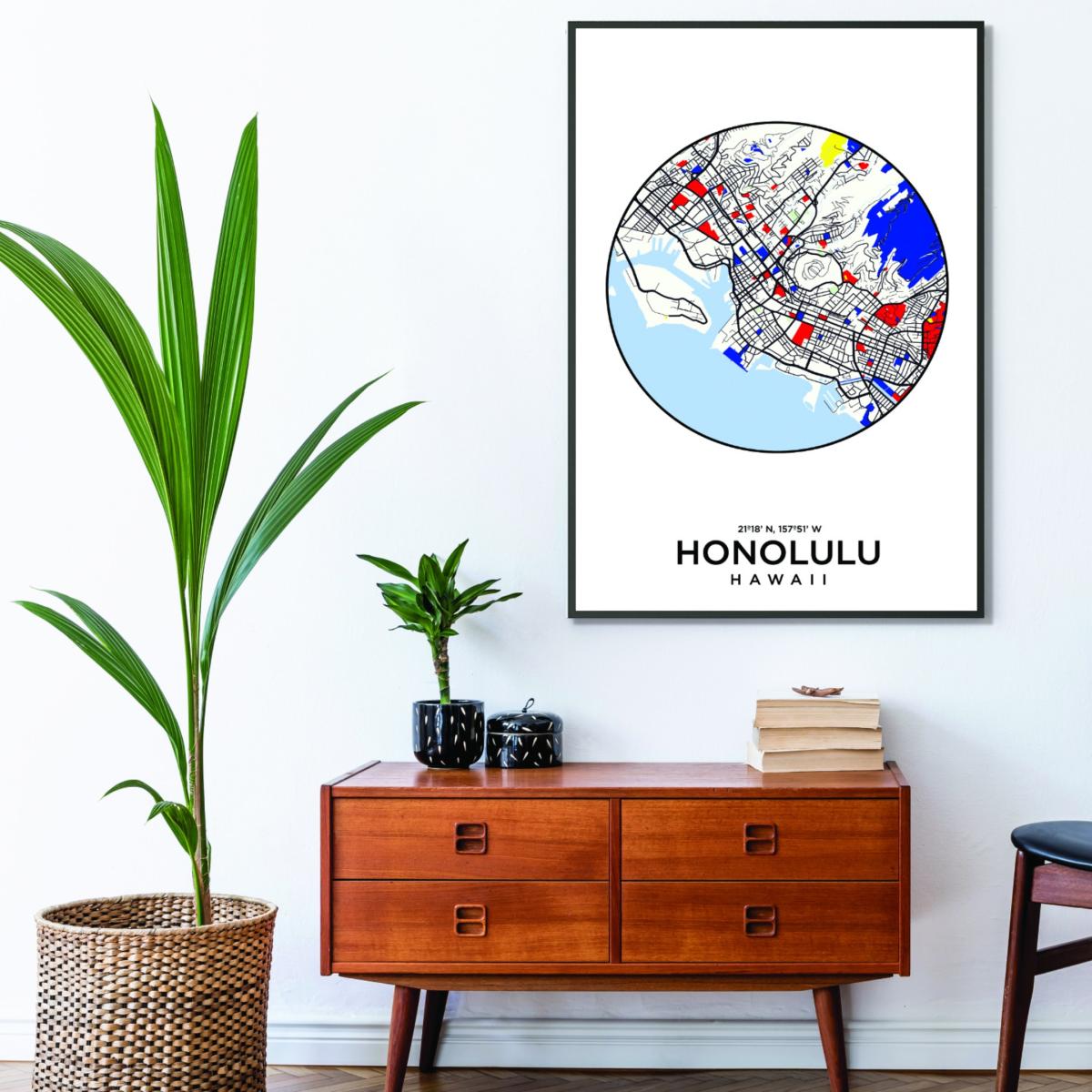 The blue map of Honolulu is a versatile piece that works well in both modern and eclectic interiors thanks to its vibrant colour palette and graphic appeal. I love how it adds a sense of place and personality to a space, making it perfect for living rooms or home offices where a bit of visual interest is desired. Pair it with minimalist furniture and neutral hues to allow the colours stand out, or let it anchor a gallery wall with other abstract or travel-inspired artworks. For practical styling, consider framing it with a slim profile in white or black to keep the focus on the print, and hang it at eye level for maximum impact. It’s a great way to bring a touch of island charm into any space.