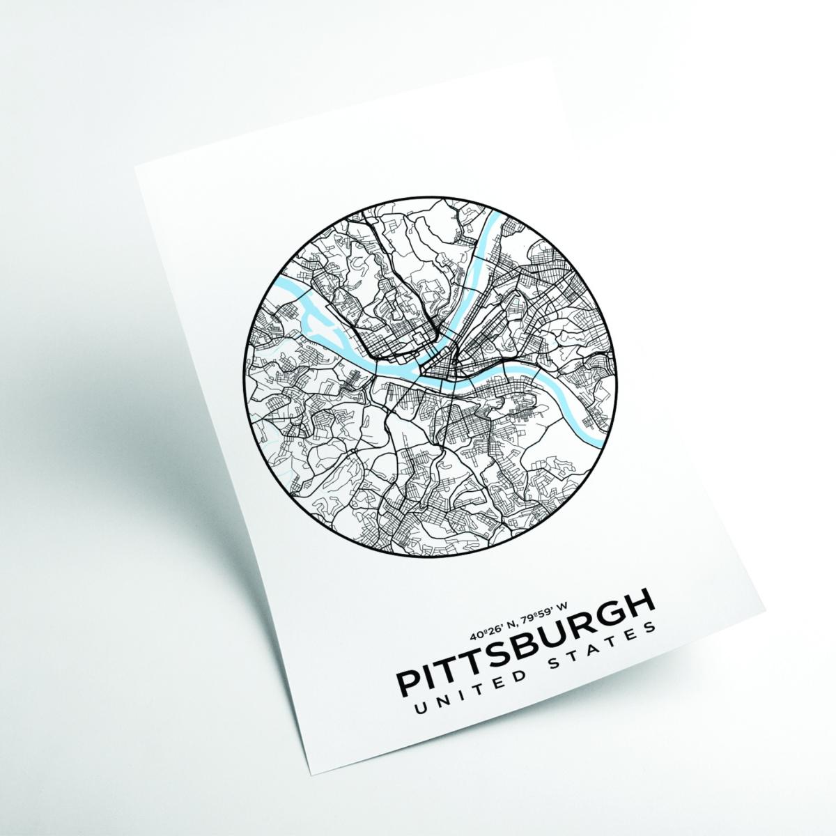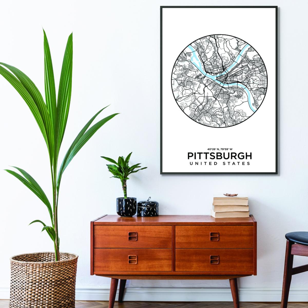 This blue map of Pittsburgh makes a striking, modern piece for an interior, especially in spaces that champion minimalism or contemporary styles. I love how it combines functional cartography with visual appeal, making it ideal for offices, living rooms, or hallways. To style it effectively, consider pairing it with other monochrome or metallic accessories to enhance its cool tones. It works especially well when framed behind glass or in a sleek frame to keep a clean, streamlined look. For added contrast, position it against neutral or light-coloured walls, allowing the slight colour pop to do all the talking without overwhelming the space. Practical tip: group it with similar city or map artworks for a curated, personalised gallery wall.