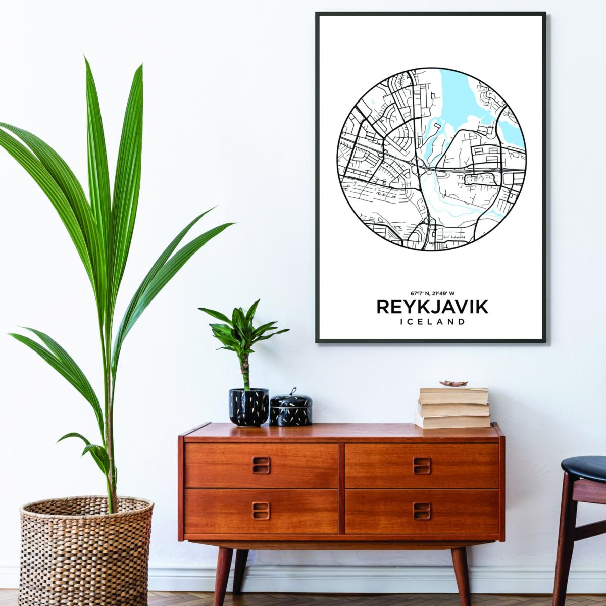 I love this map of Reykjavik for its clean, modern aesthetic that makes it versatile across various interiors. Its compact size and monochrome palette make it an excellent focal point in minimalist, Scandinavian, or contemporary schemes, especially when paired with natural woods or monochrome accessories. It works particularly well in home offices, living rooms, or even bedrooms, adding a touch of personal interest without overwhelming the space. For practical styling, consider framing it simply and placing it above a console table or sofa, or grouping it with other city maps or artwork to build a curated wall display. Its understated design ensures it can blend seamlessly into various interiors while still serving as a meaningful piece of art.