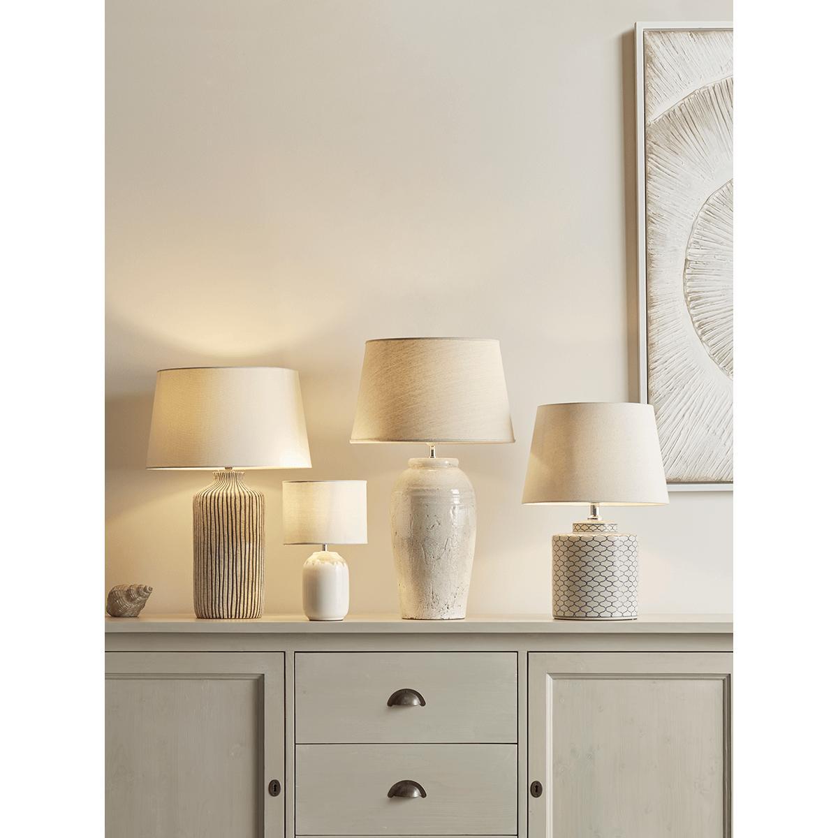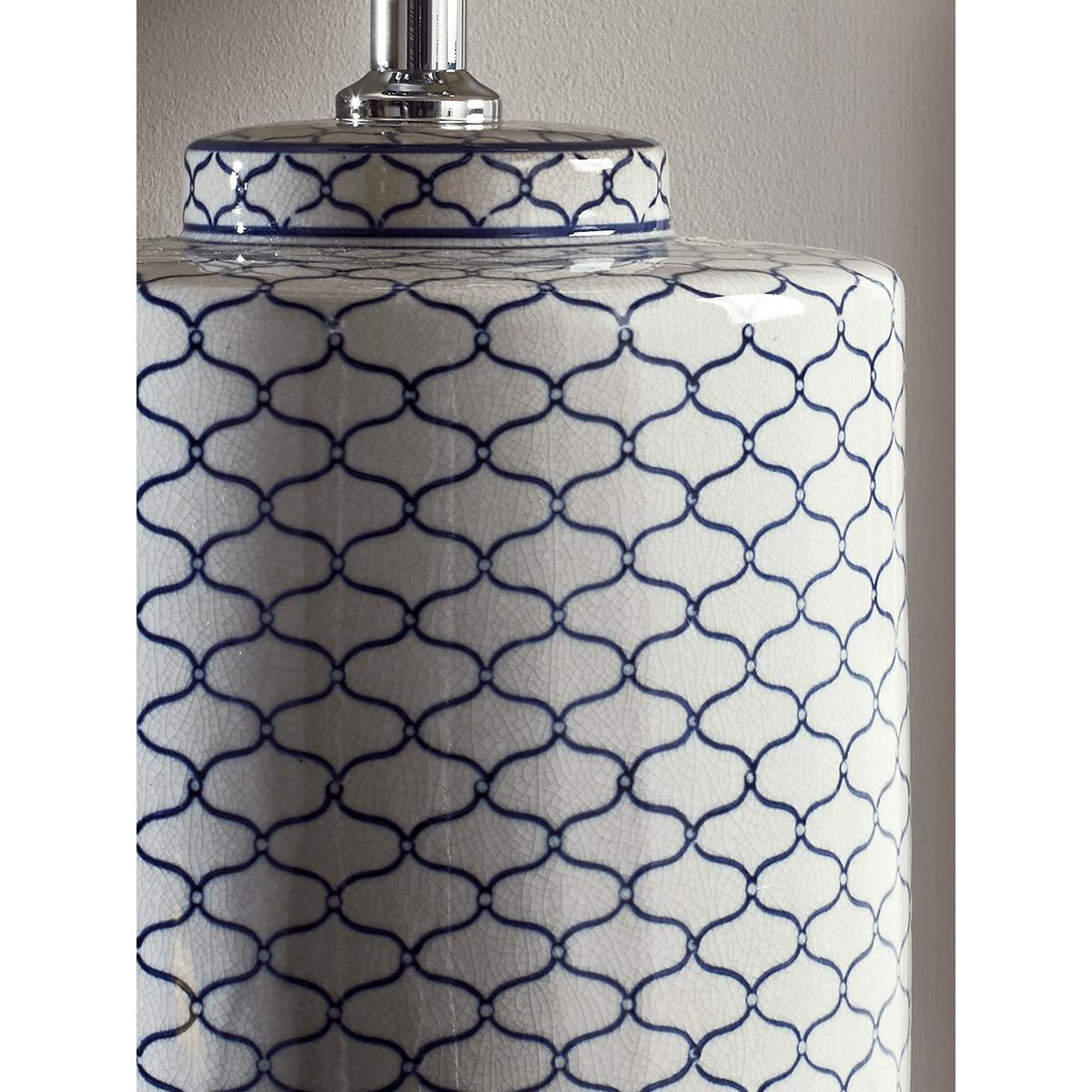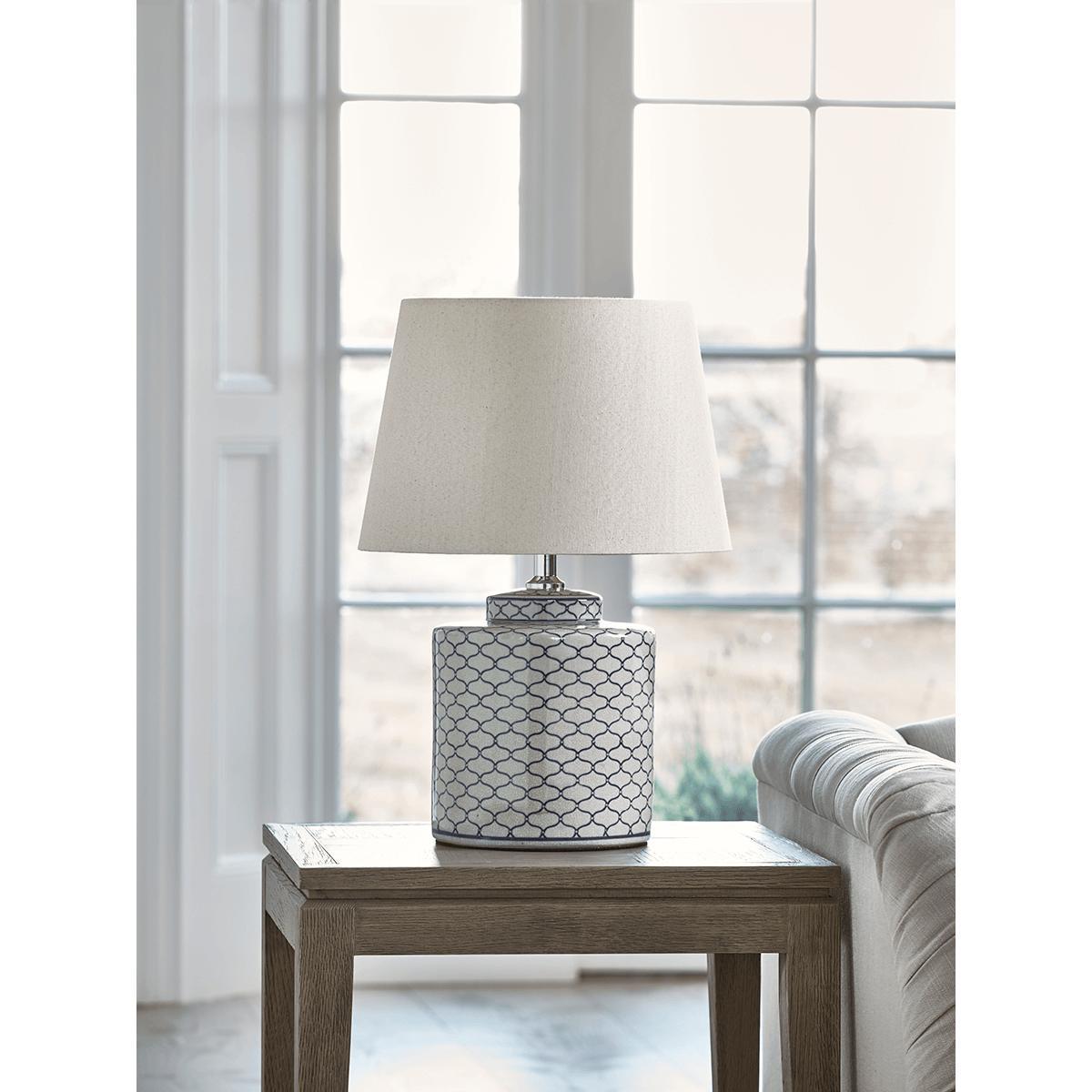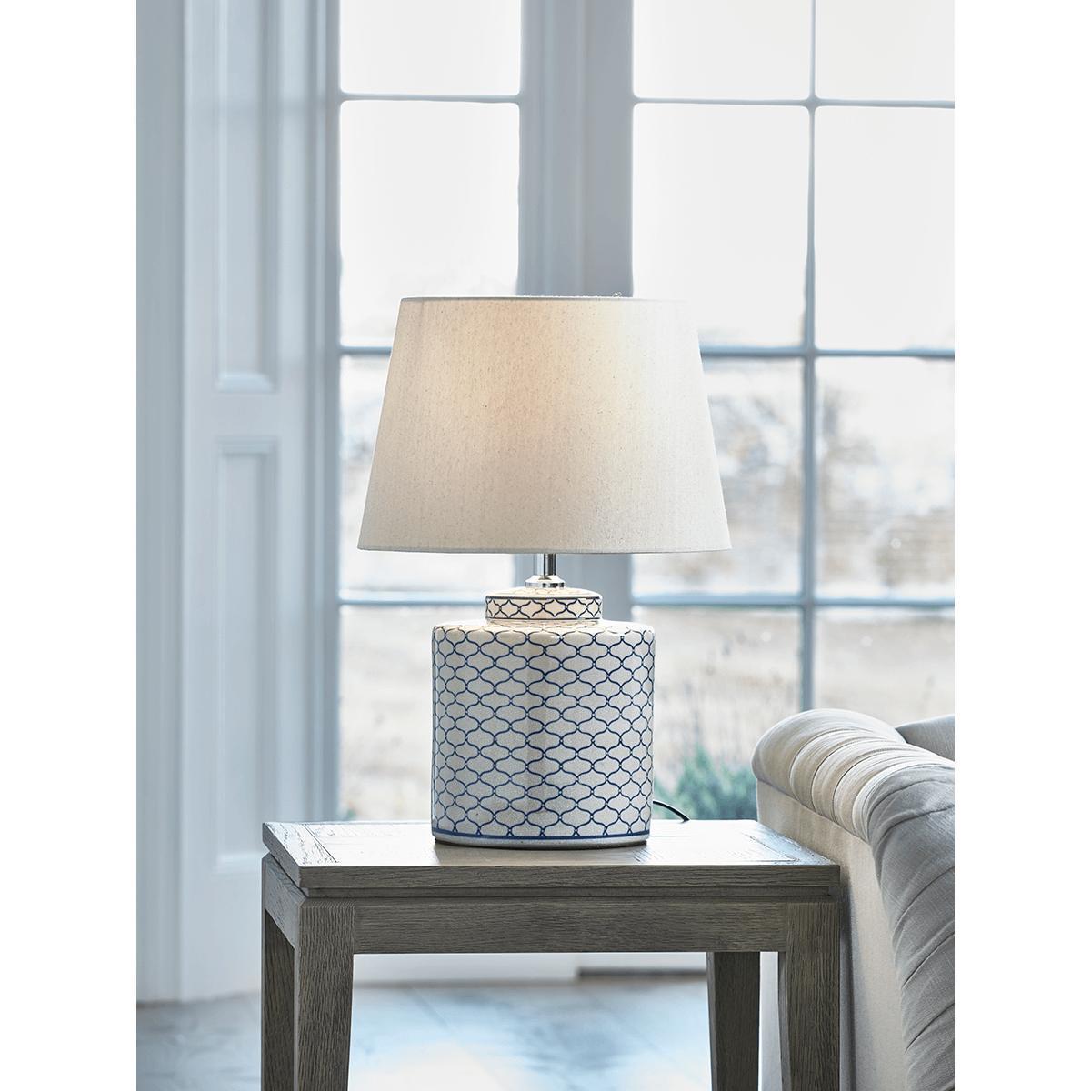 With all the timeless appeal of classic blue and white china, our Blue Maroq Table Lamp will be welcome in your home and heart for years to come. The substantial ceramic base is hand painted in a pleasing blue quatrafoil pattern inspired by Moroccan designs. Finished with a neutral cotton shade, this lamp will bring a fresh look to a bedside, console or occasional table.