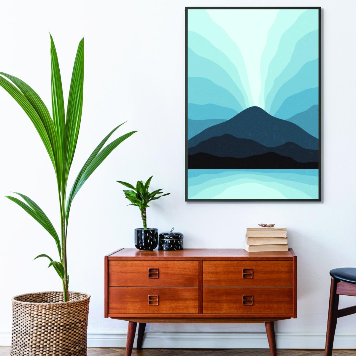 Blue Mountain Vibes #1 makes a striking statement piece, especially suited to modern or minimalist interiors. Its calming shades of blue and layered mountain imagery can bring a sense of serenity and depth to a space. This print works beautifully in living rooms, bedrooms, or even bathrooms where tranquillity is desired. To style it effectively, consider pairing with neutral tones or cool colour palettes to let the artwork stand out. Framing it simply in white or black can keep the look fresh and contemporary, while layering with other textural elements like soft throws or geometric accessories can add visual interest without overwhelming the space. It’s a versatile piece that can anchor an interior while also adding colour without being overpowering.