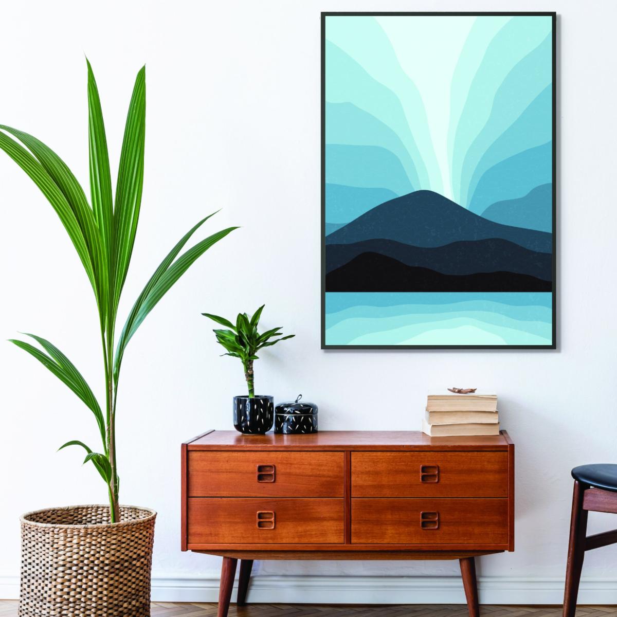 I love this big blue mountain print because of its bold yet calming colour palette, making it a versatile addition to many contemporary interiors. It works particularly well in modern living spaces or bedrooms where a statement piece is needed without overwhelming the room. For styling, consider pairing it with neutral-toned furnishings to let the artwork stand out, or add a splash of the same blue shades in cushions or accessories to create a cohesive look. For practical tips, hang it at eye level above a sofa or bed, and keep surrounding decor minimal to highlight the artwork’s striking design. Its large size makes it a focal point, so it’s perfect for creating a serene and sophisticated atmosphere.