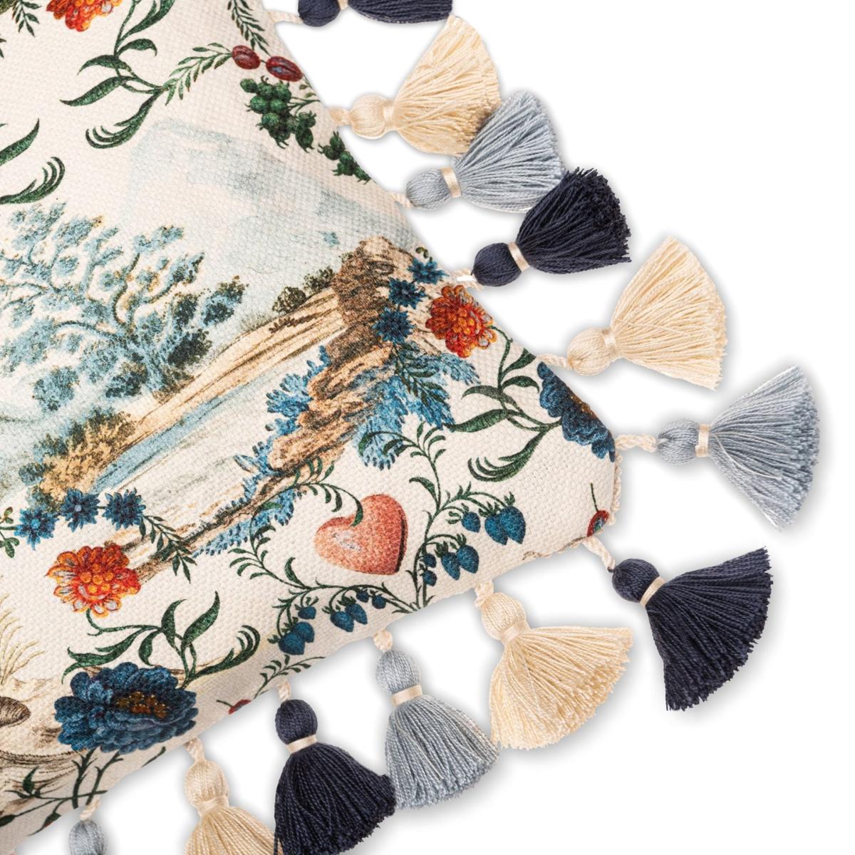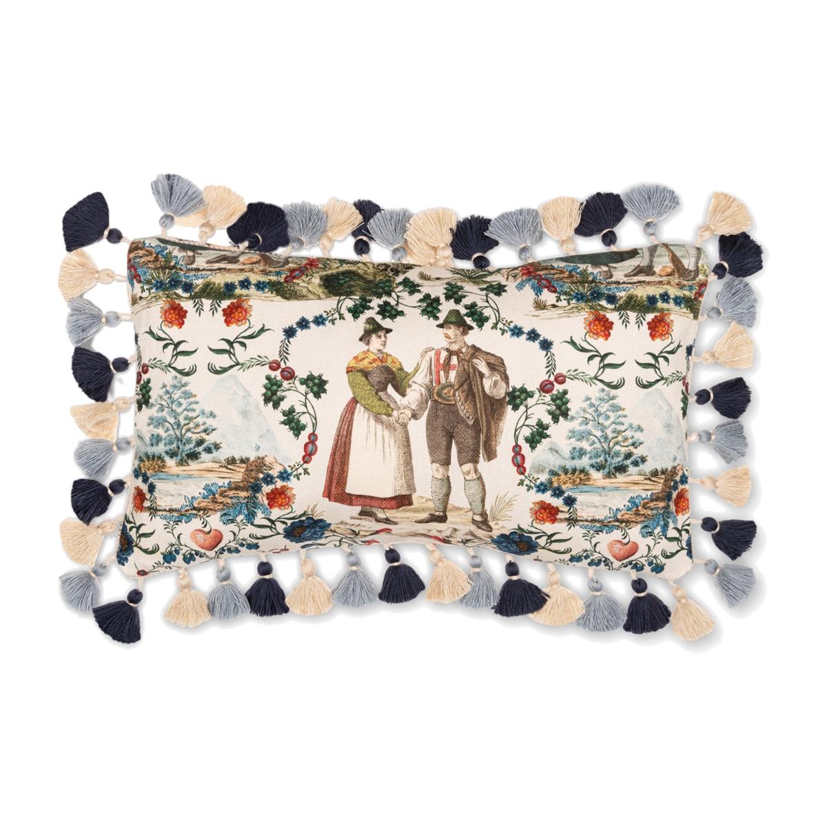 Proud in their colourful attire, LANDHAUSMODE features a traditional couple dressed in quintessential Tyrolean costume. Inspired by a vintage folk illustration, this charming design cushion is edged in silky blue and beige tassels and comes in square and rectangular formats.