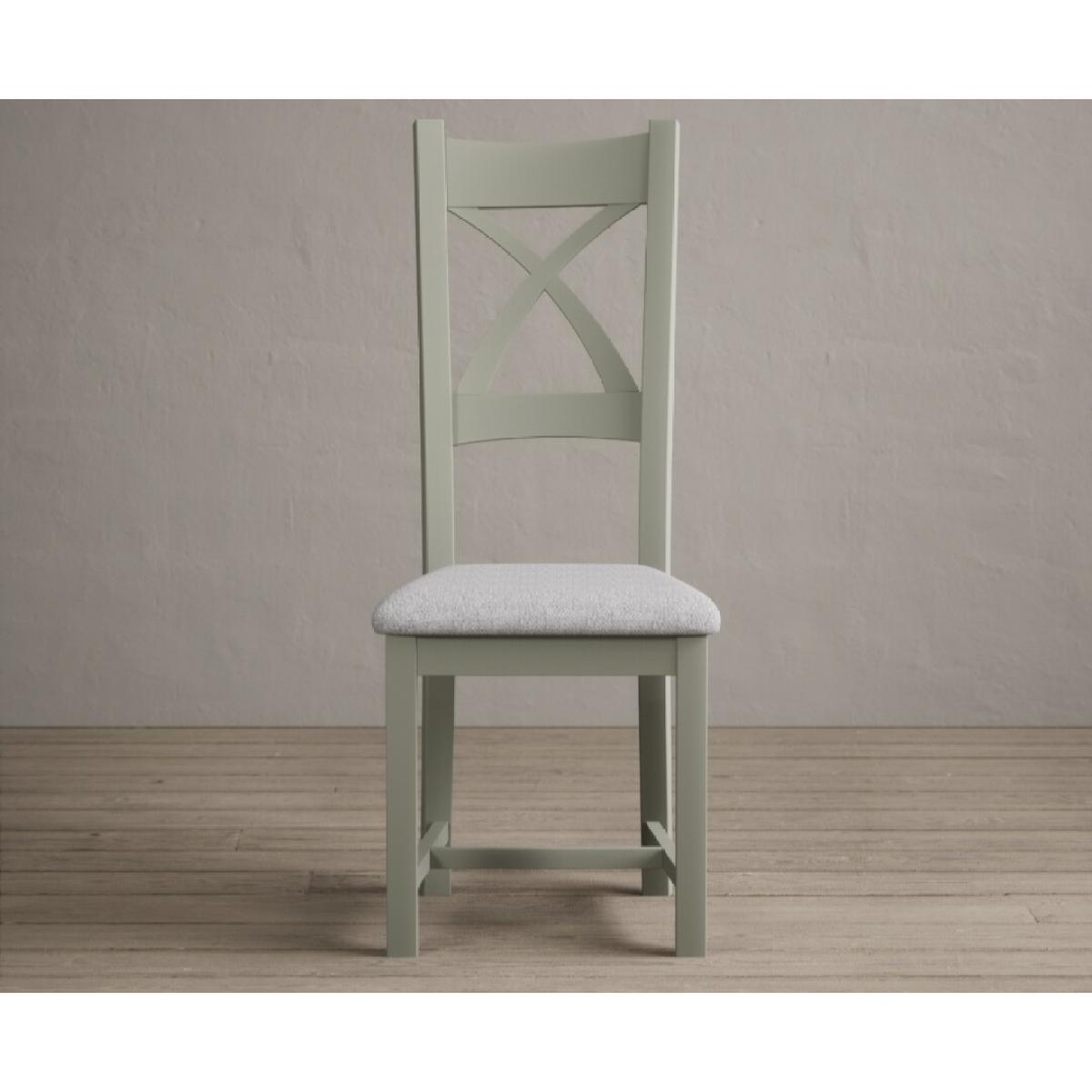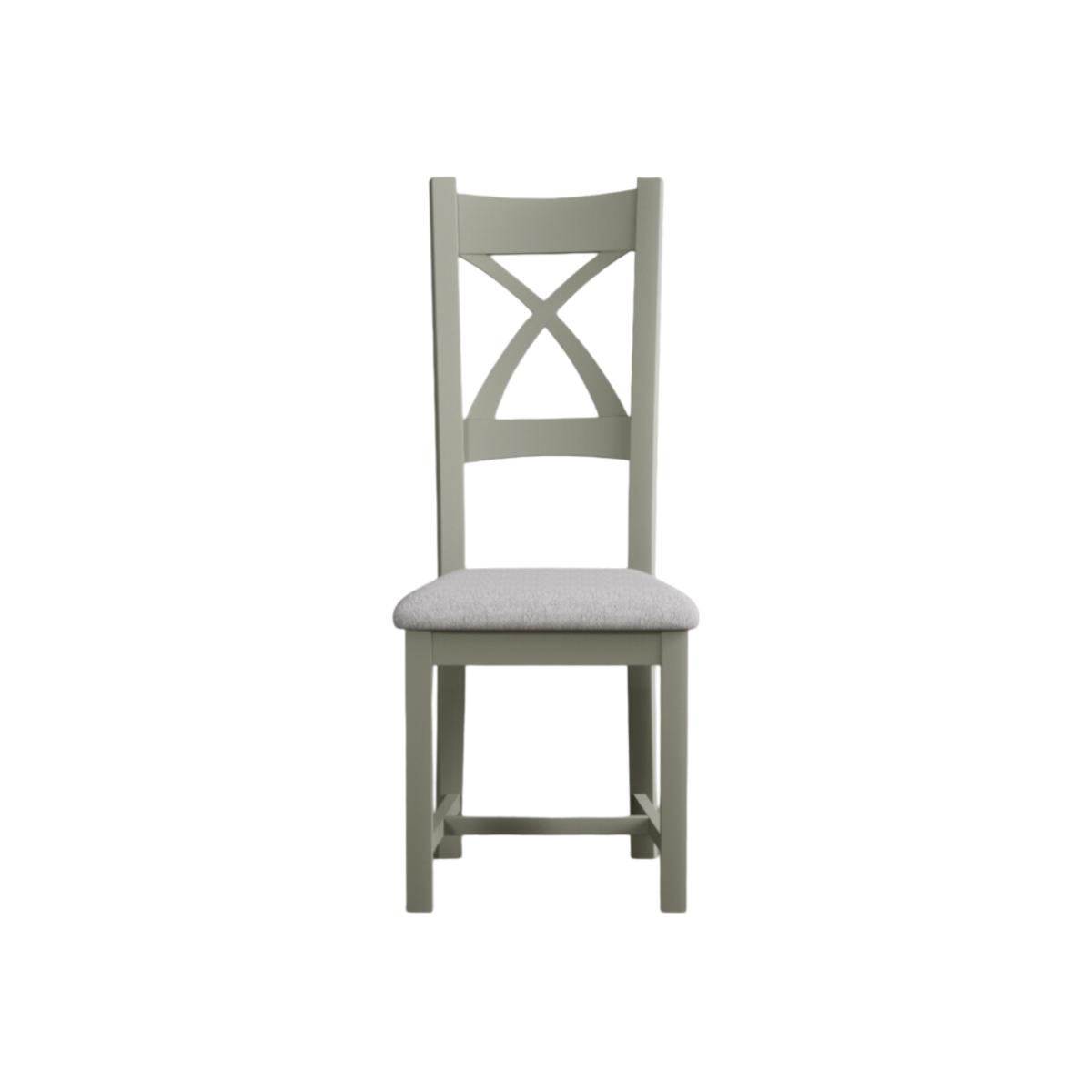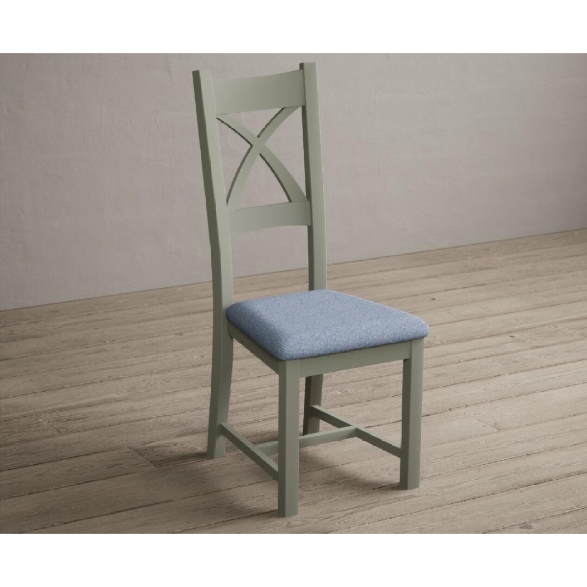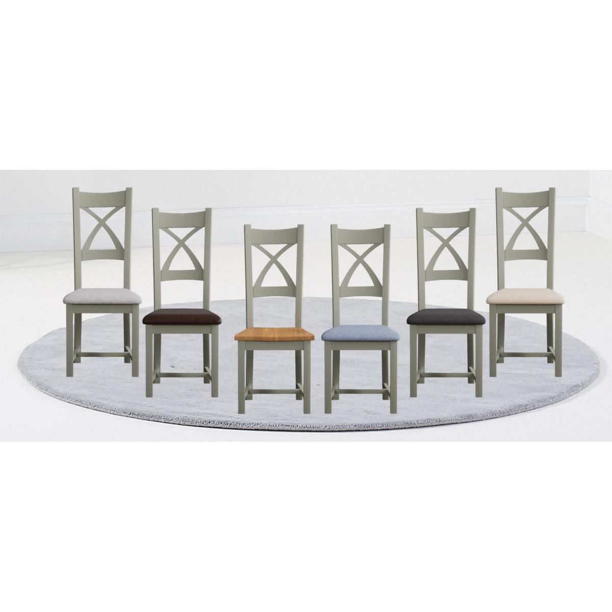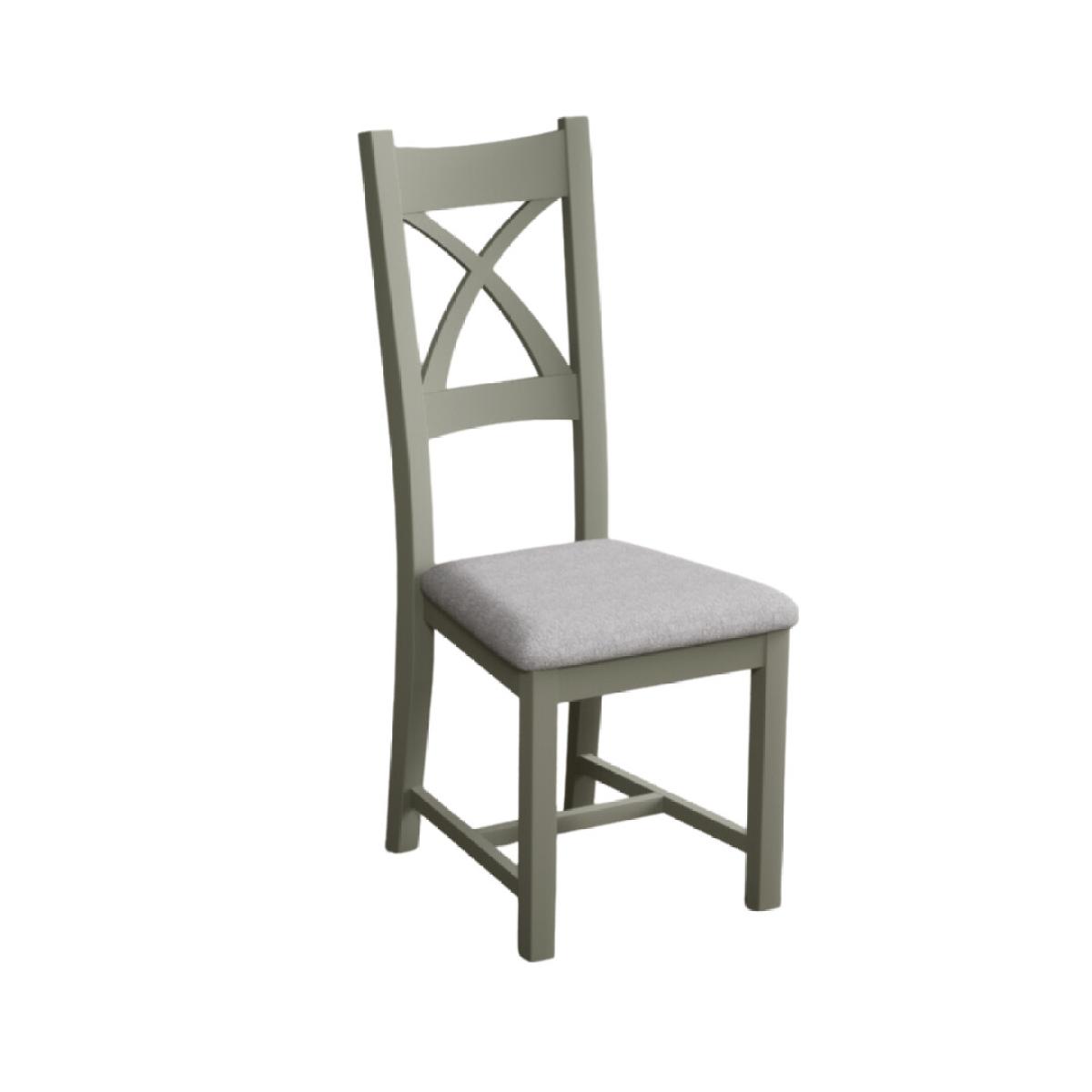 The Painted Soft Green X Back Dining Chairs with Light Grey Fabric Seat Pad feature a soft green painted solid hardwood frame and comfortable light grey fabric seat.