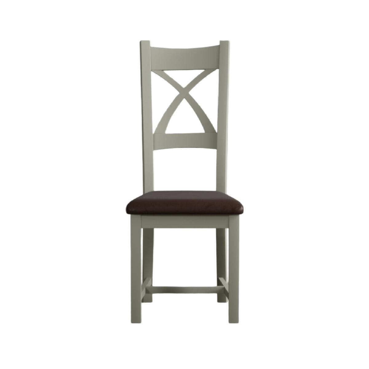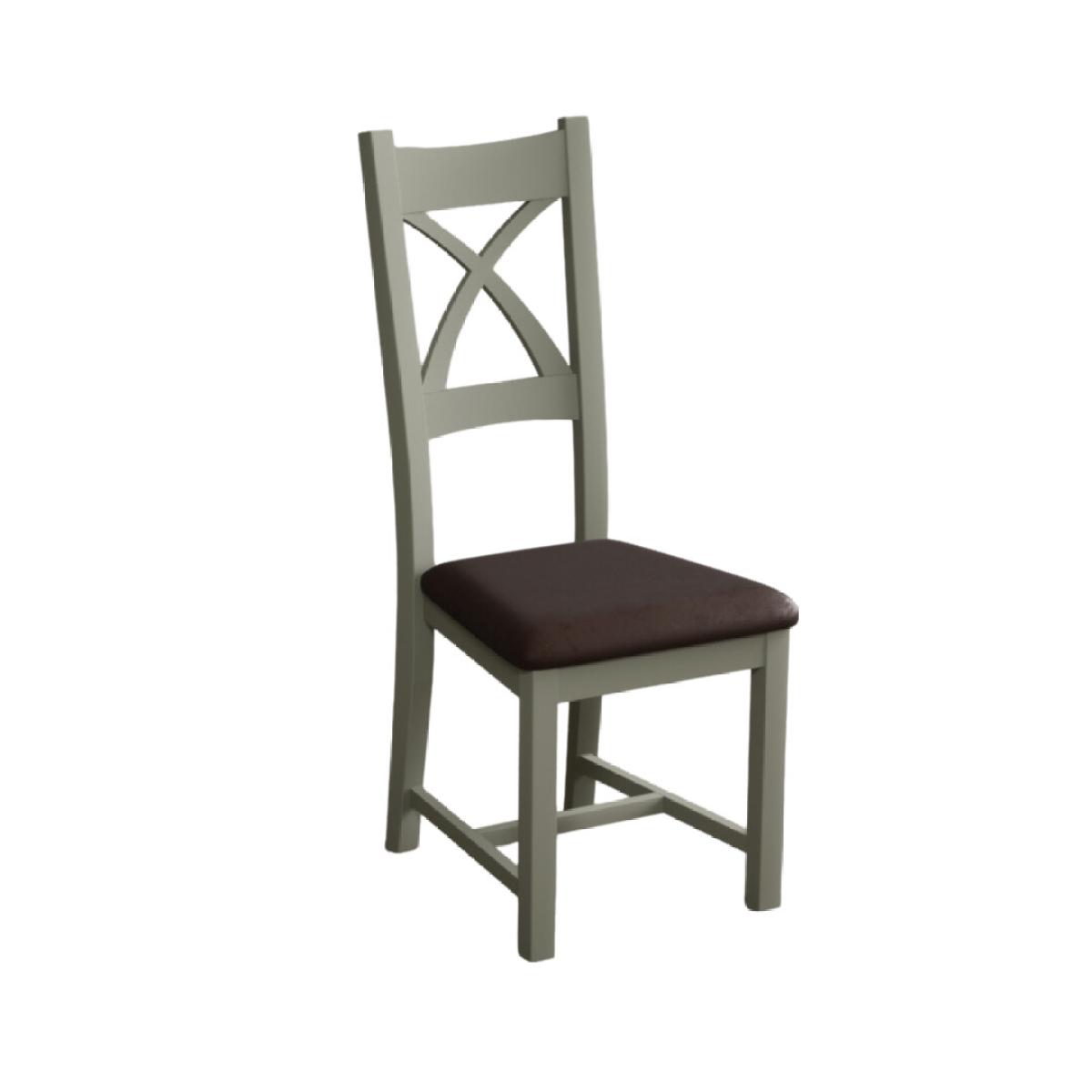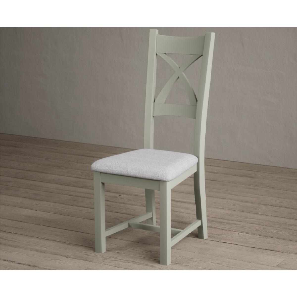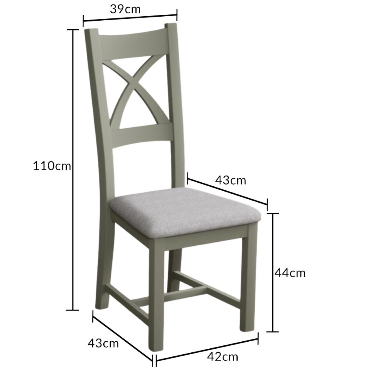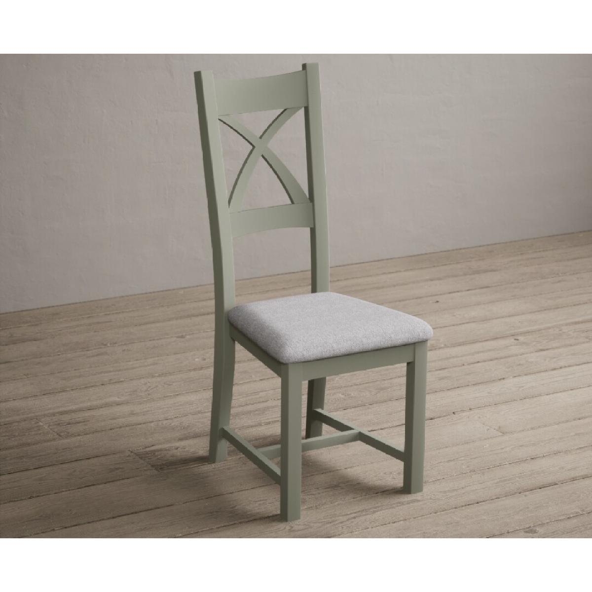 The Painted Soft Green X Back Dining Chairs with Light Grey Fabric Seat Pad feature a soft green painted solid hardwood frame and comfortable light grey fabric seat.