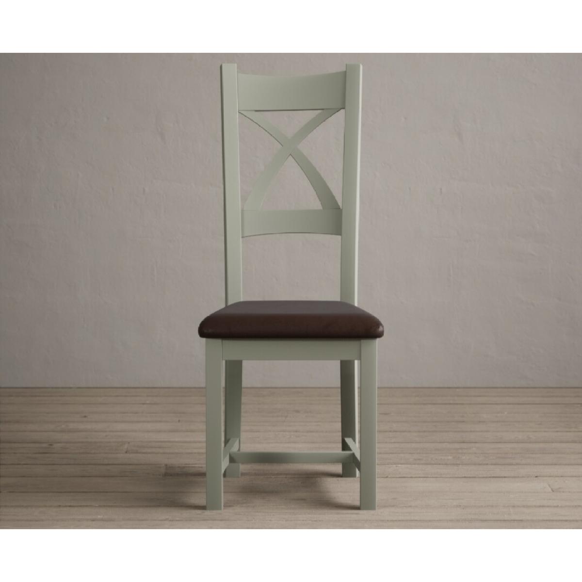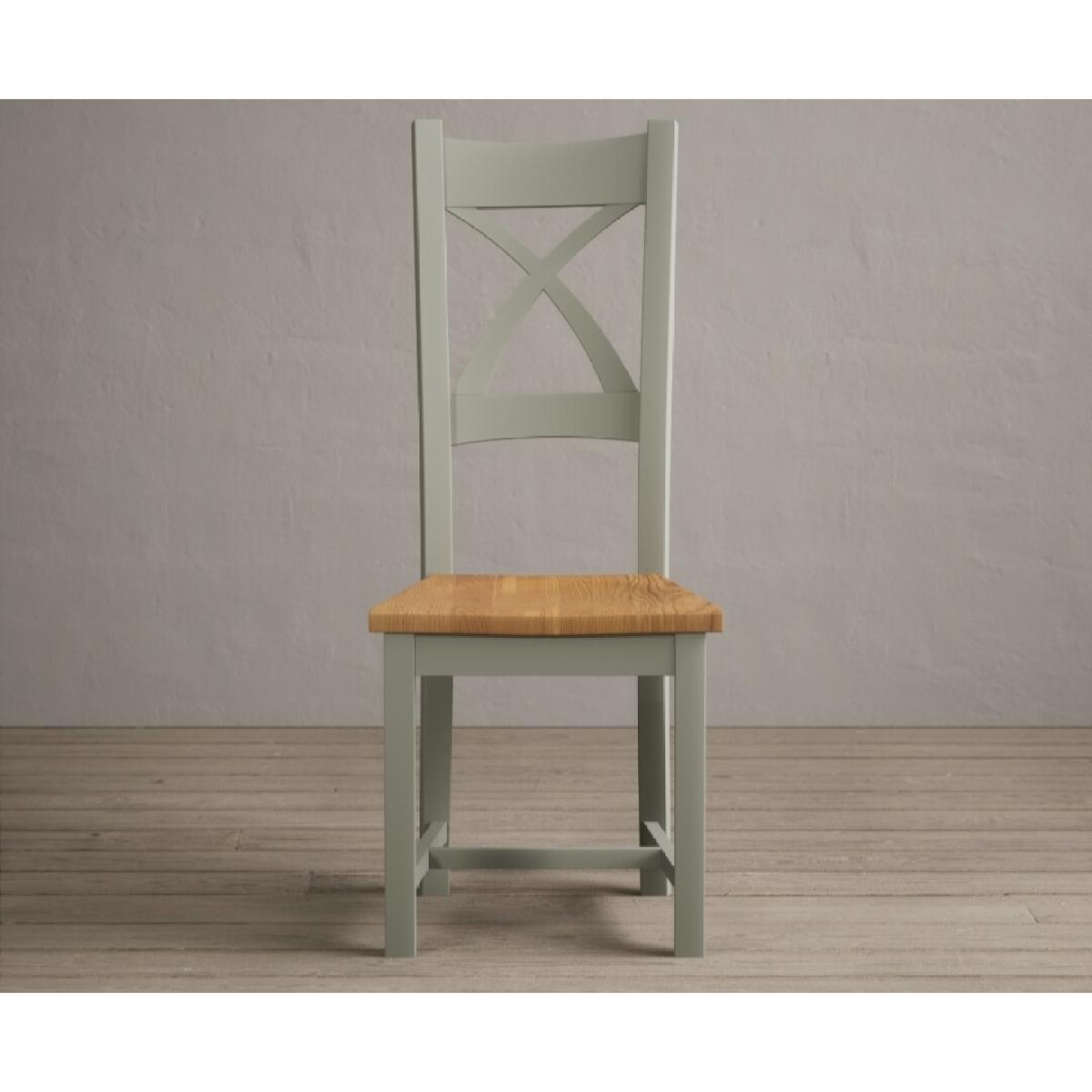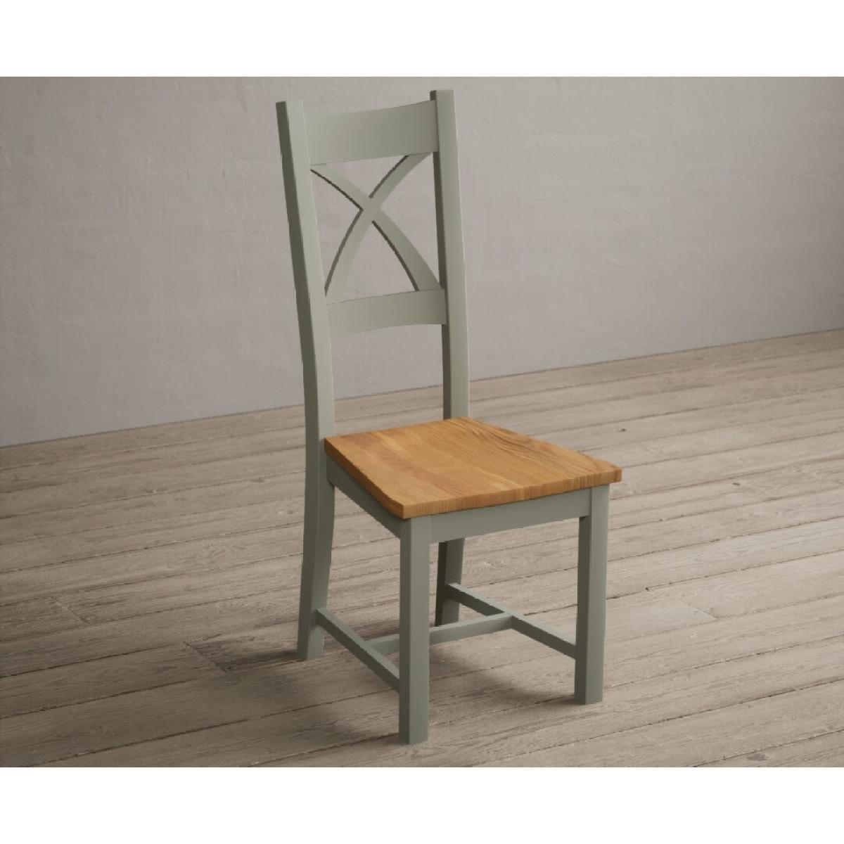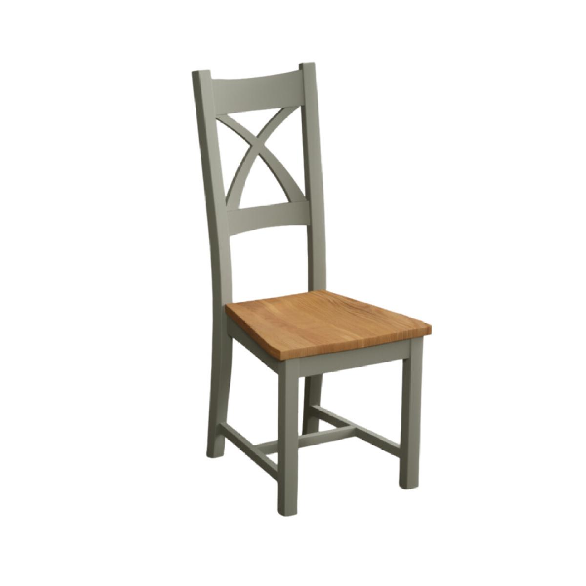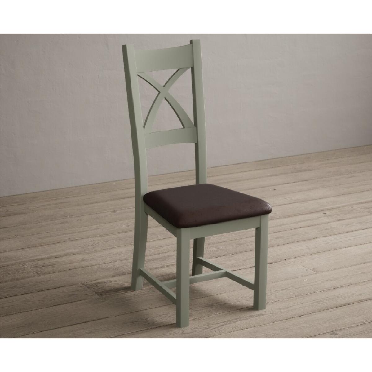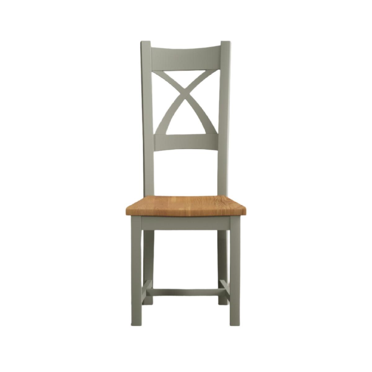 The Painted Soft Green X Back Dining Chairs with Light Grey Fabric Seat Pad feature a soft green painted solid hardwood frame and comfortable light grey fabric seat.