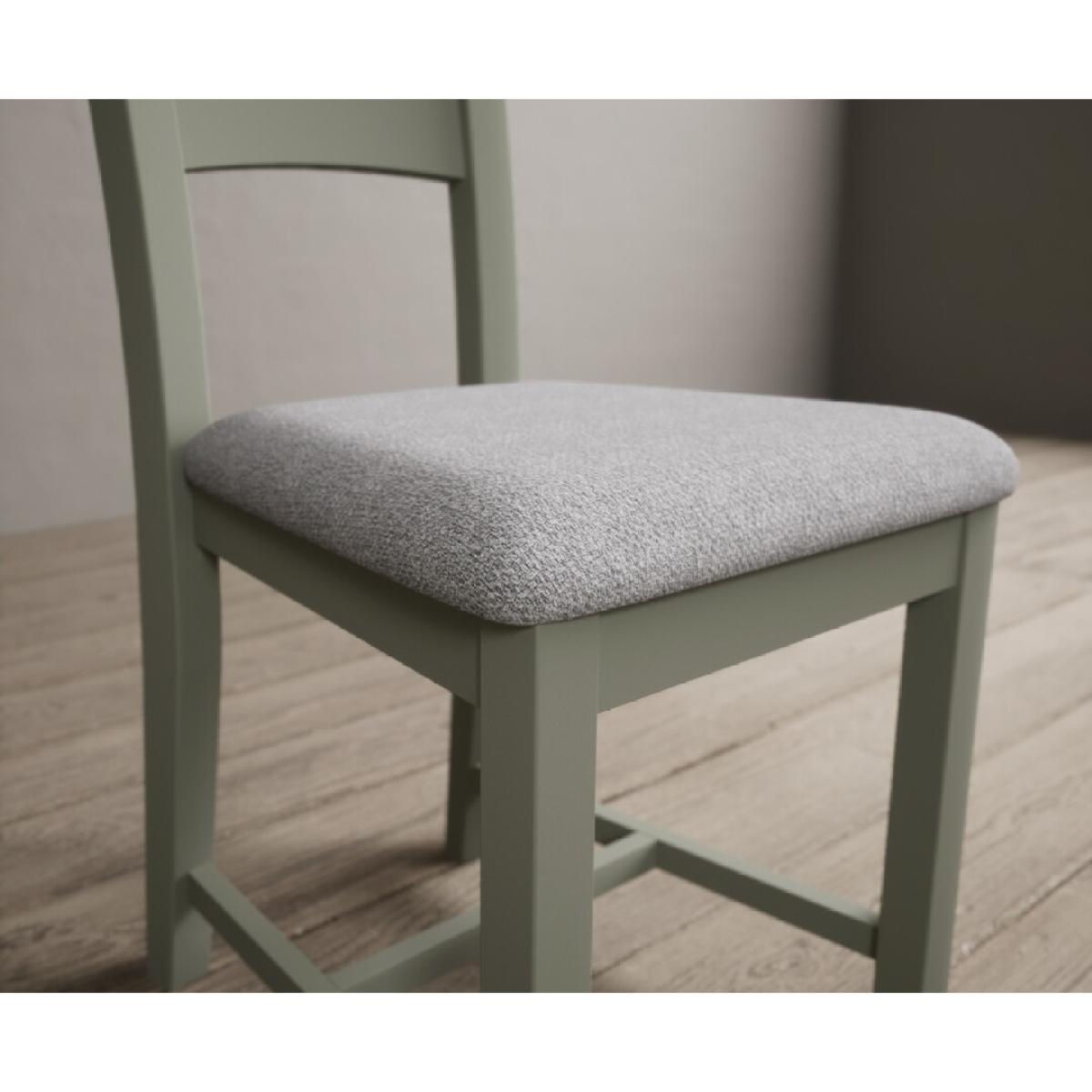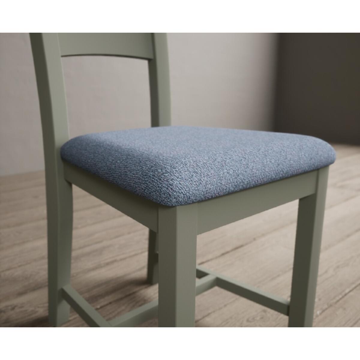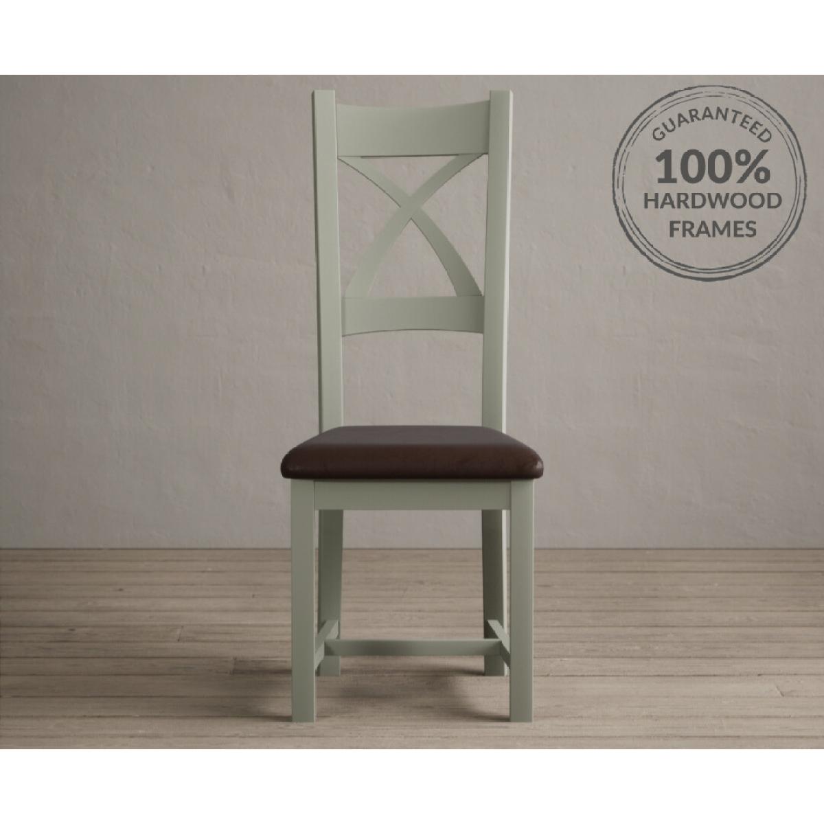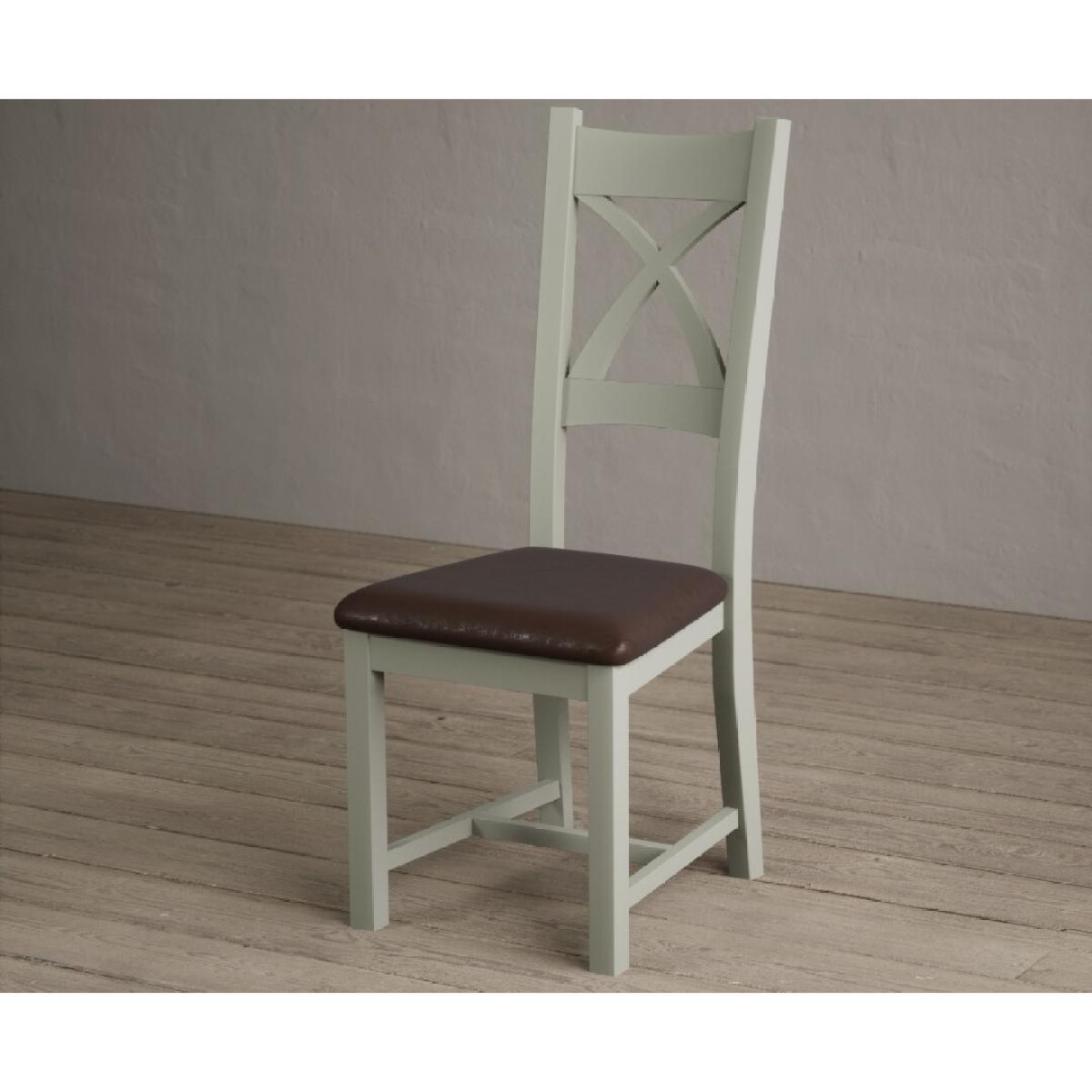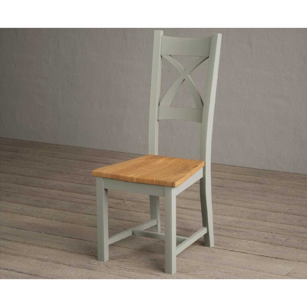 The Painted Soft Green X Back Dining Chairs with Light Grey Fabric Seat Pad feature a soft green painted solid hardwood frame and comfortable light grey fabric seat.