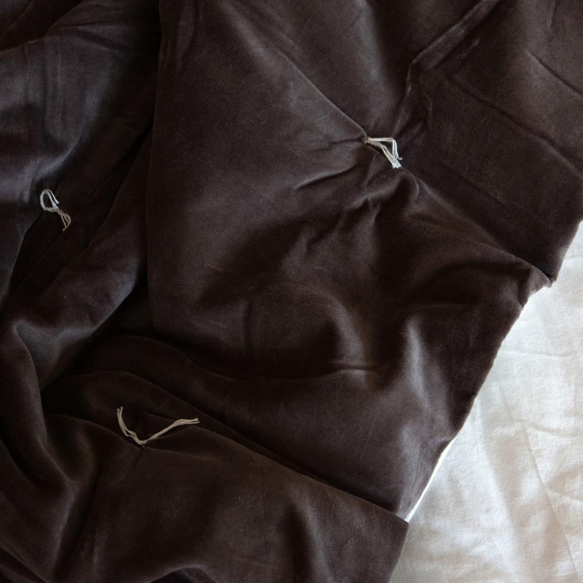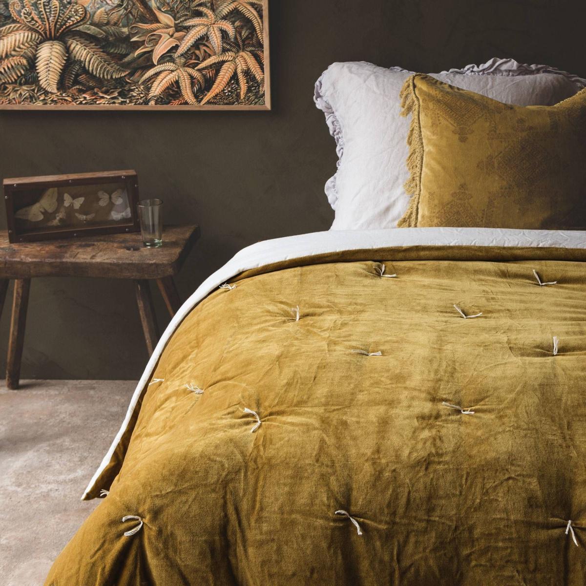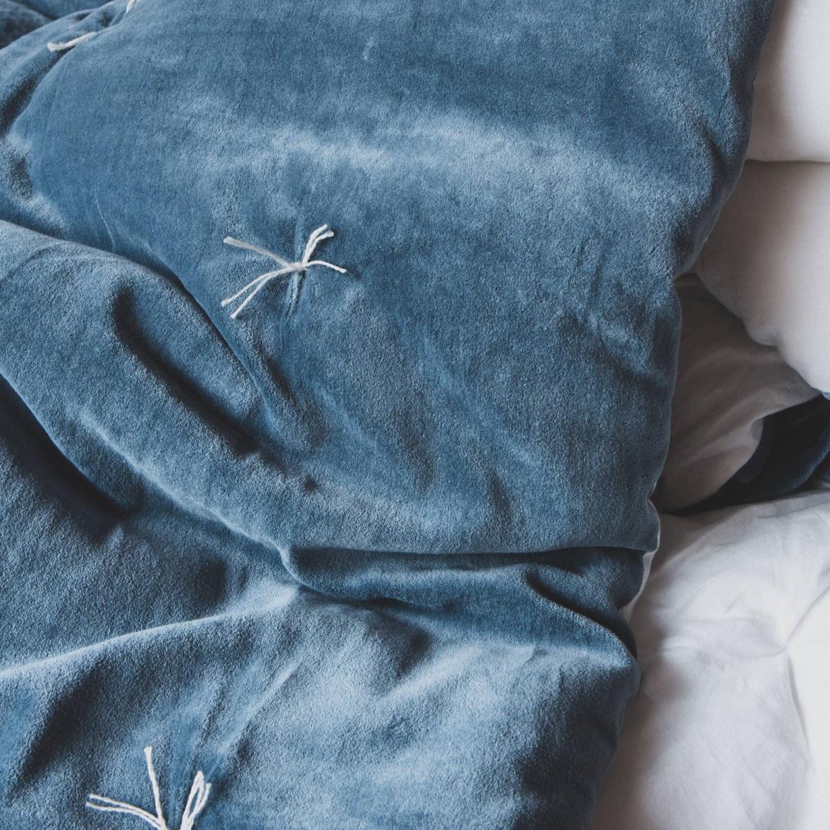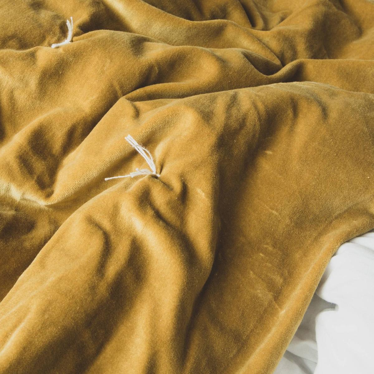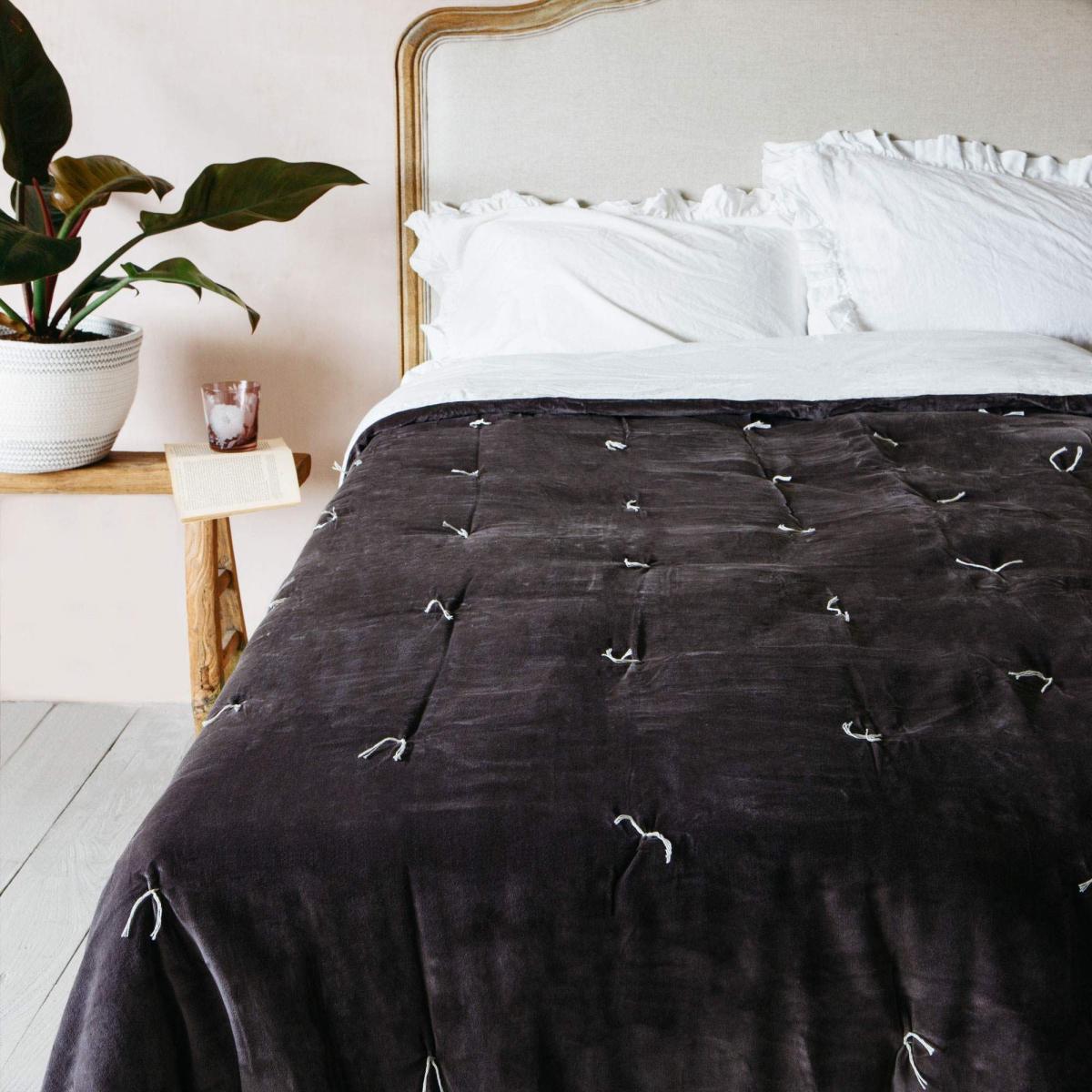 Sleep soundly under our beautifully soft Pebble velvet quilts. Available in rose, pale sage, smoke blue and mustard, each quilt is fronted in luxuriously soft cotton velvet with hand-knotted tassel detailing and backed with ivory cotton voile, for envious bedroom soft furnishings. L240 x W220cm. King size. Cotton velvet. Natural cotton reverse. 100% polyester filling. We recommend dry clean only. Due to the handmade nature of this product size, colour and pattern may vary. The appearance of velvet may differ slightly from the image when first unpacked due to creasing. Creases and shade variance should disappear within two days.