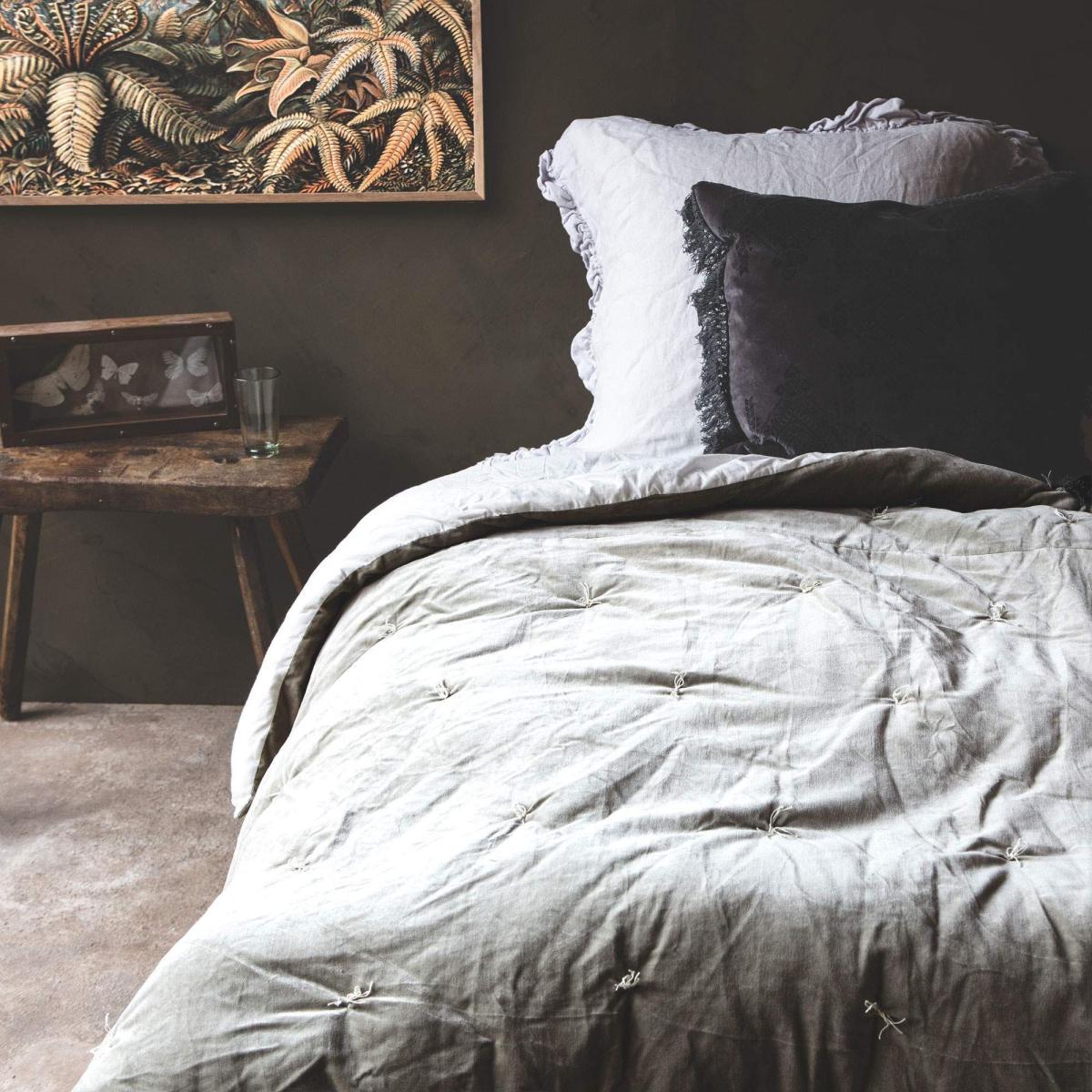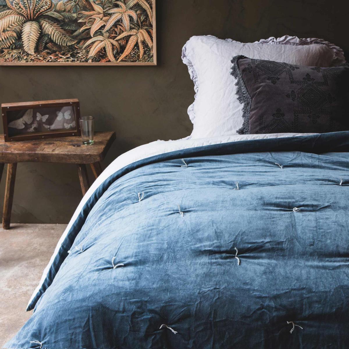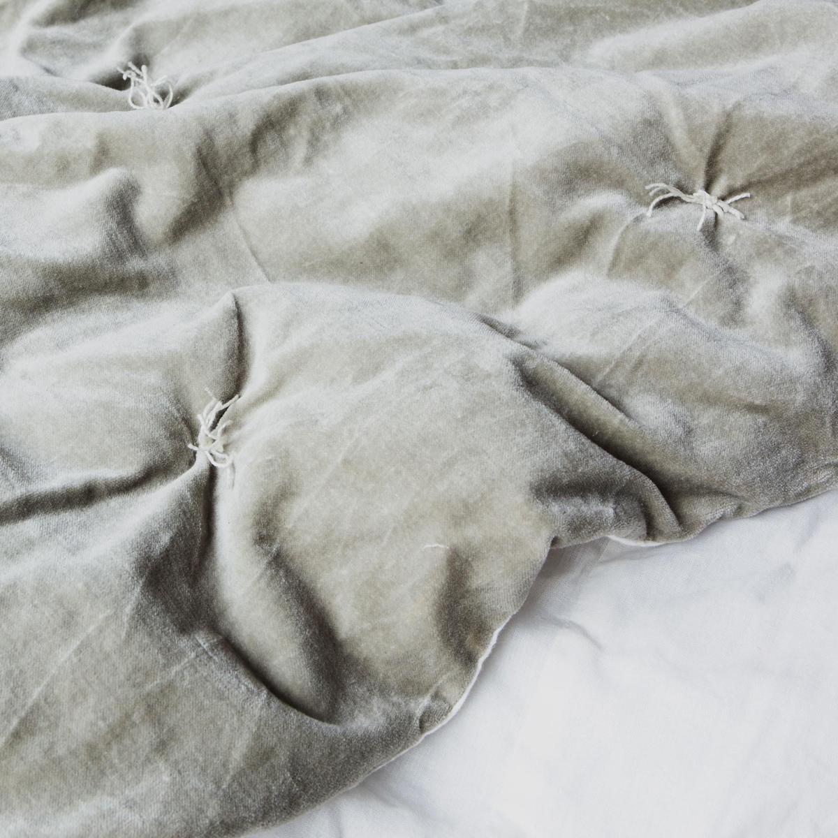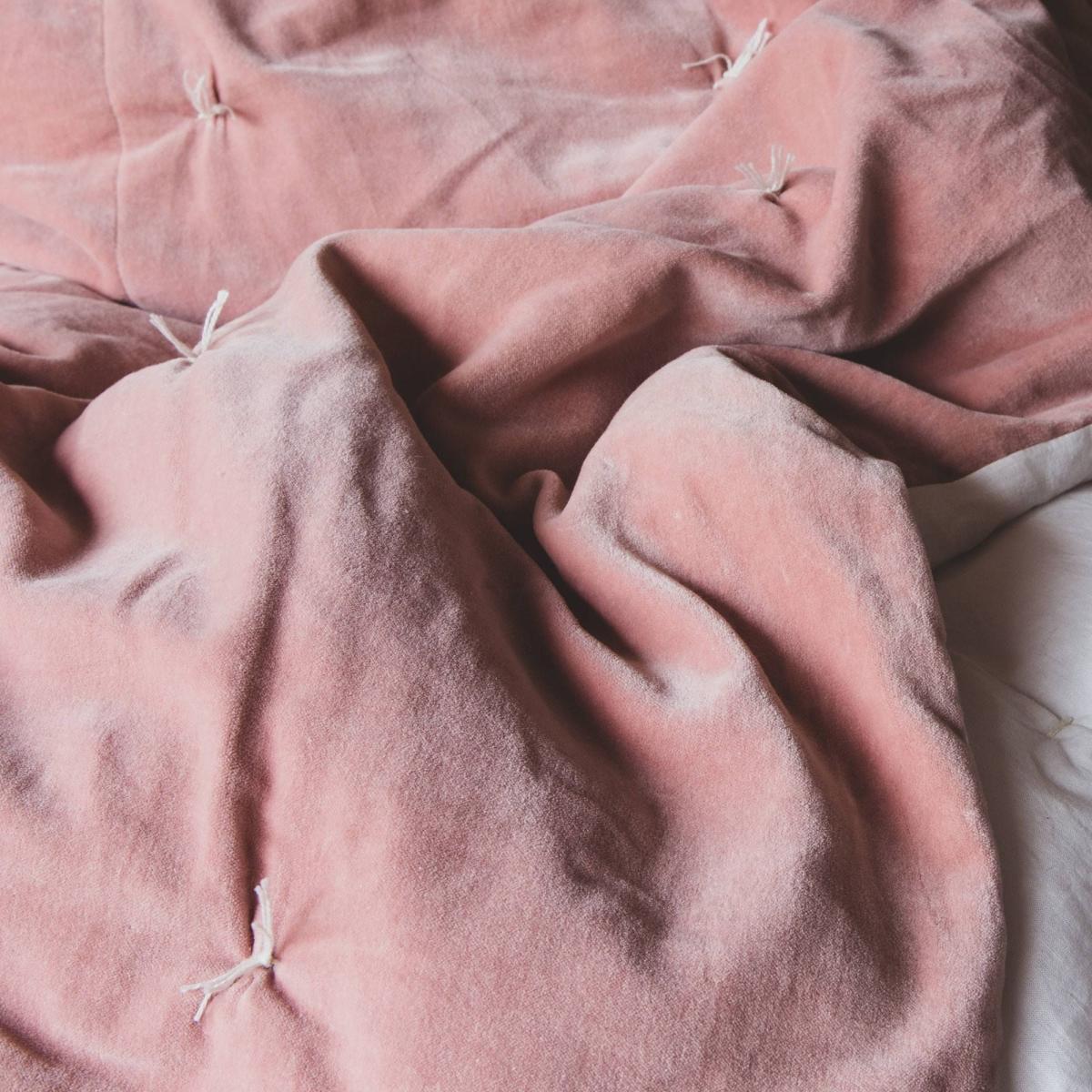 A super king size quilt handmade from luxurious cotton velvet with hand-knotted tassel detailing and an ivory cotton voile reverse. Available in rose, pale sage and smoke blue.