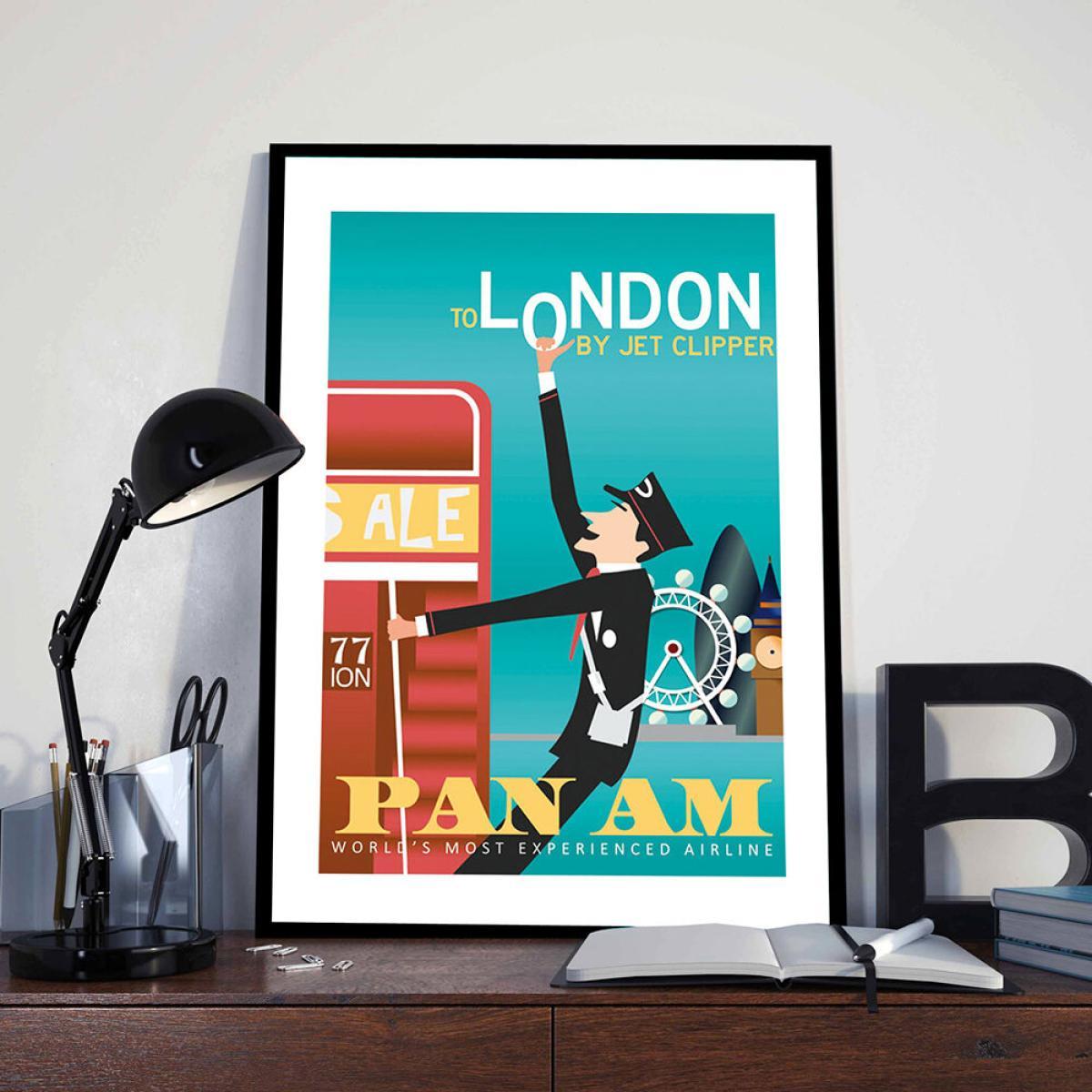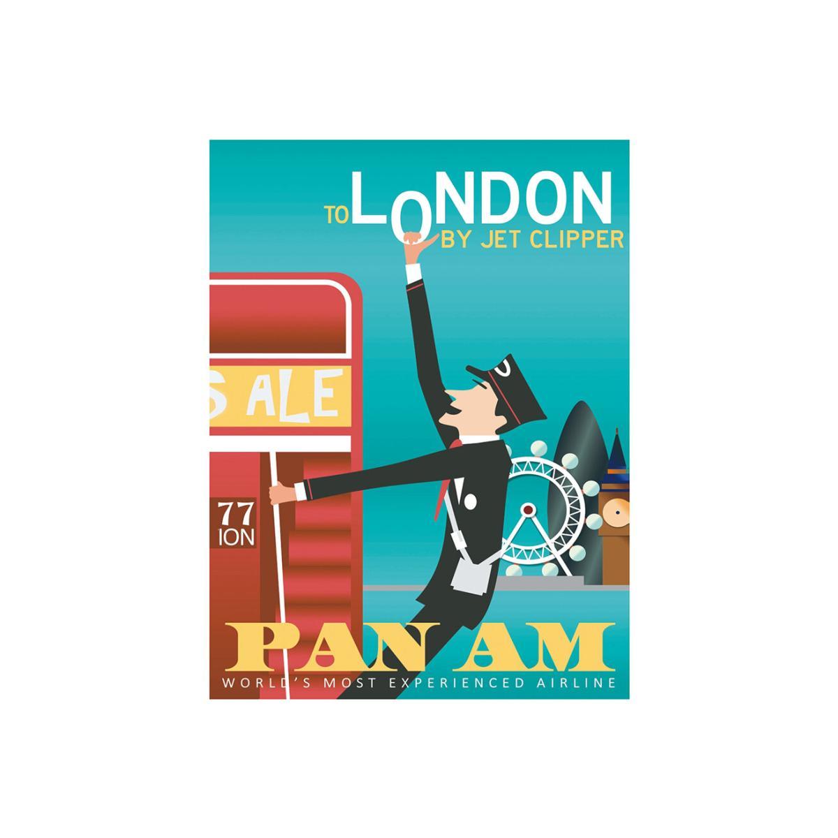 Banish boring walls with this London Pan Am print from Blue Shaker. Bold and graphic, this advert is for Pan American Airways and visiting London.