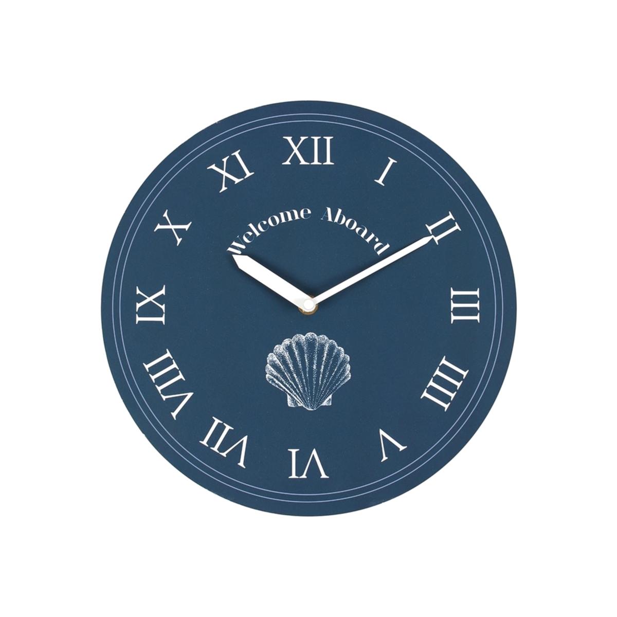Round wall clock. Nautical round wall clock with shell design in middle with roman numerals around the edge. Requires 1aa battery. Comes in a white window box.