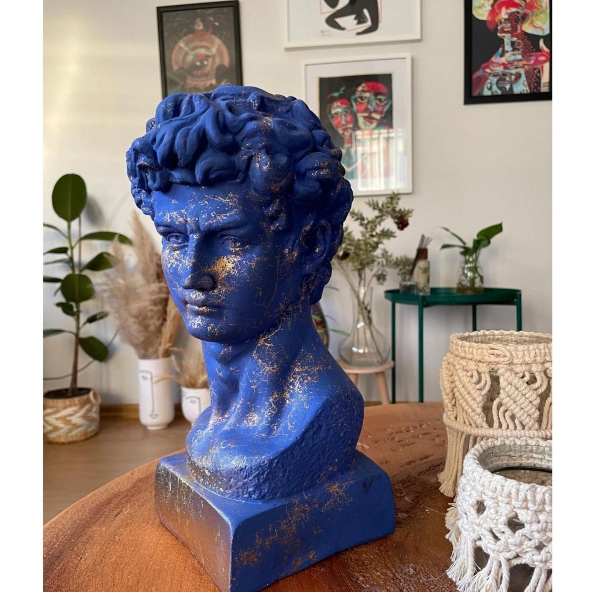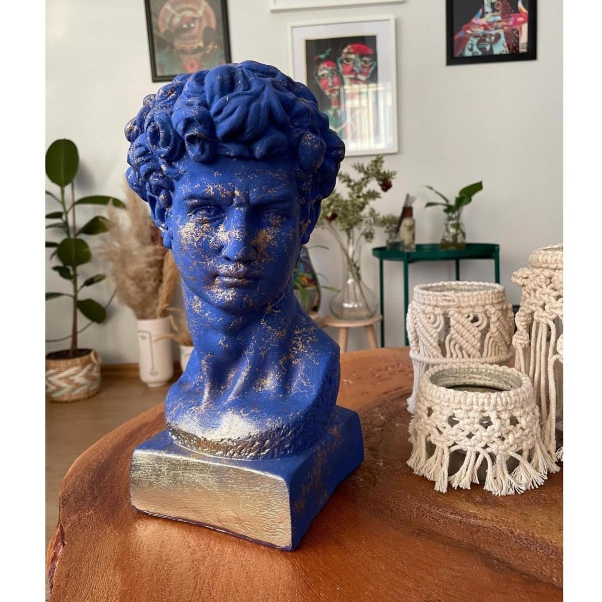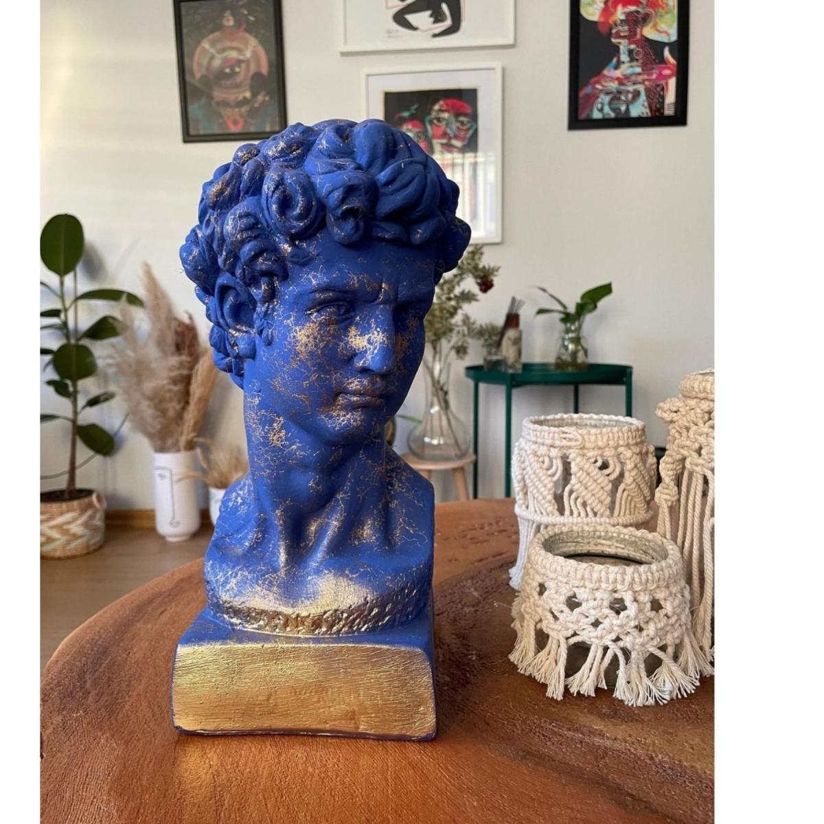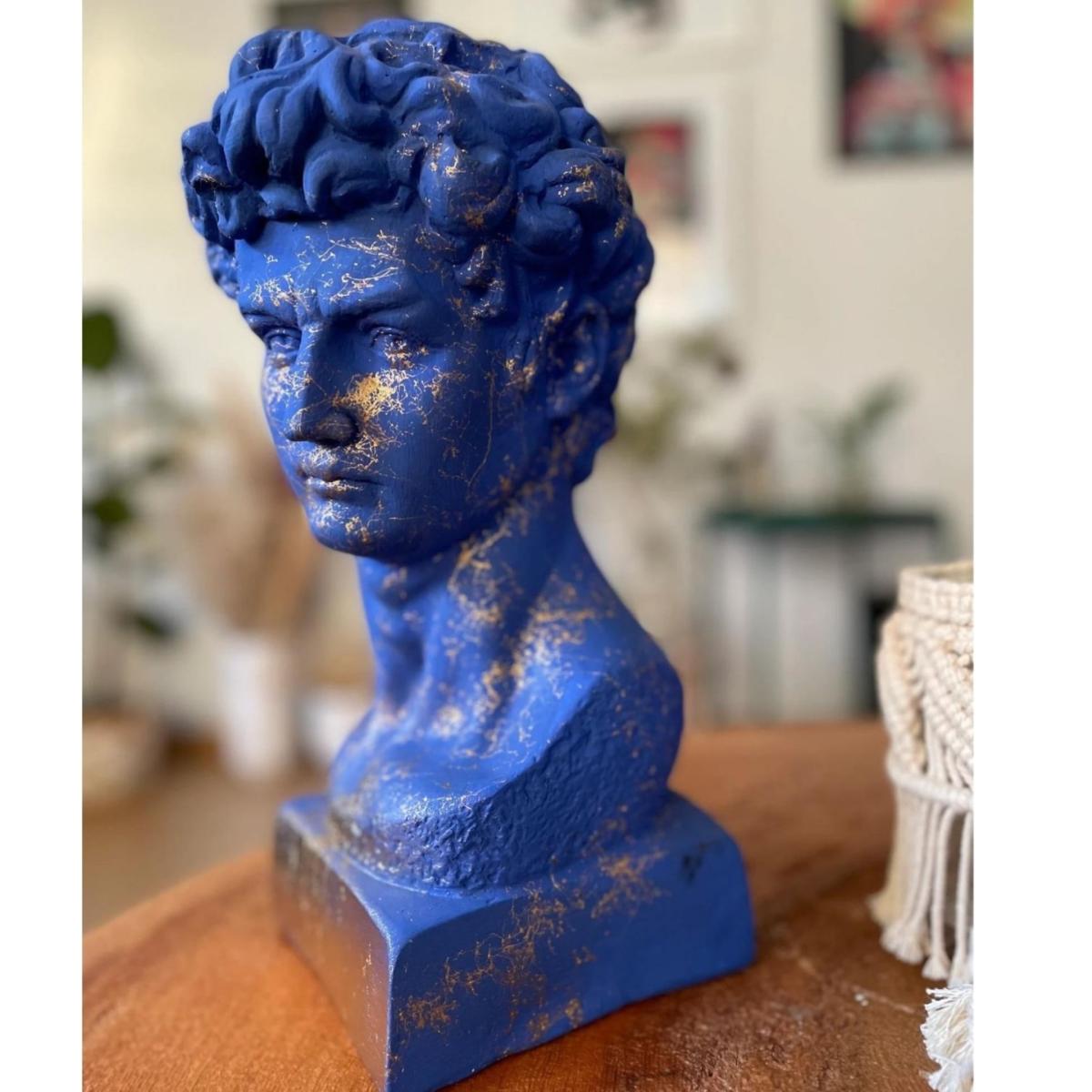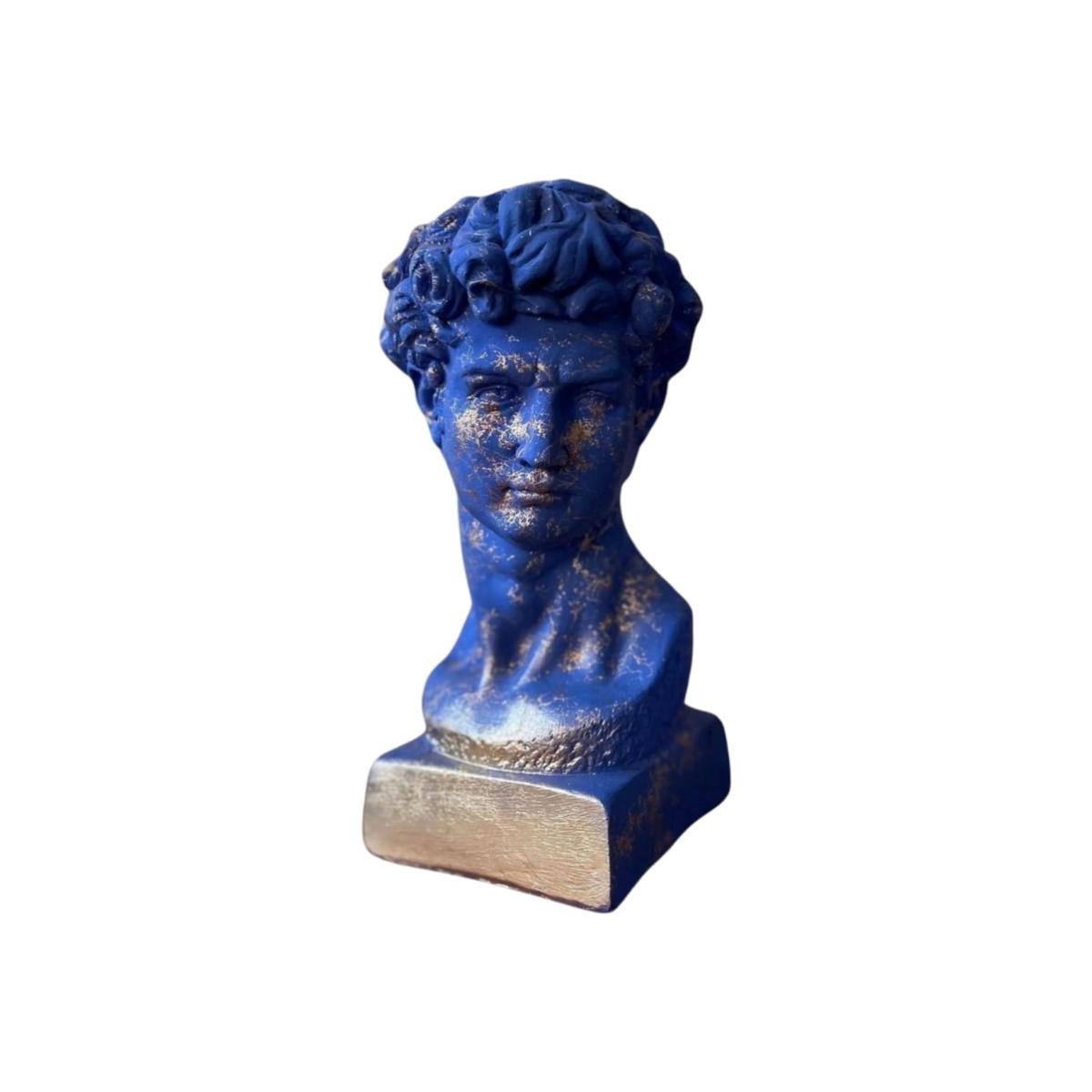 Silver Vision: David Bust is a striking 34 x 24 cm sculpture that reimagines the iconic David with a contemporary flair. The bust features a white and blue design with an artistic spray of silver paint cascading from the head, symbolizing creativity and modern elegance. This bold piece fuses classical art with modern design, making it a perfect addition to contemporary spaces or art collections seeking a unique touch of sophistication.