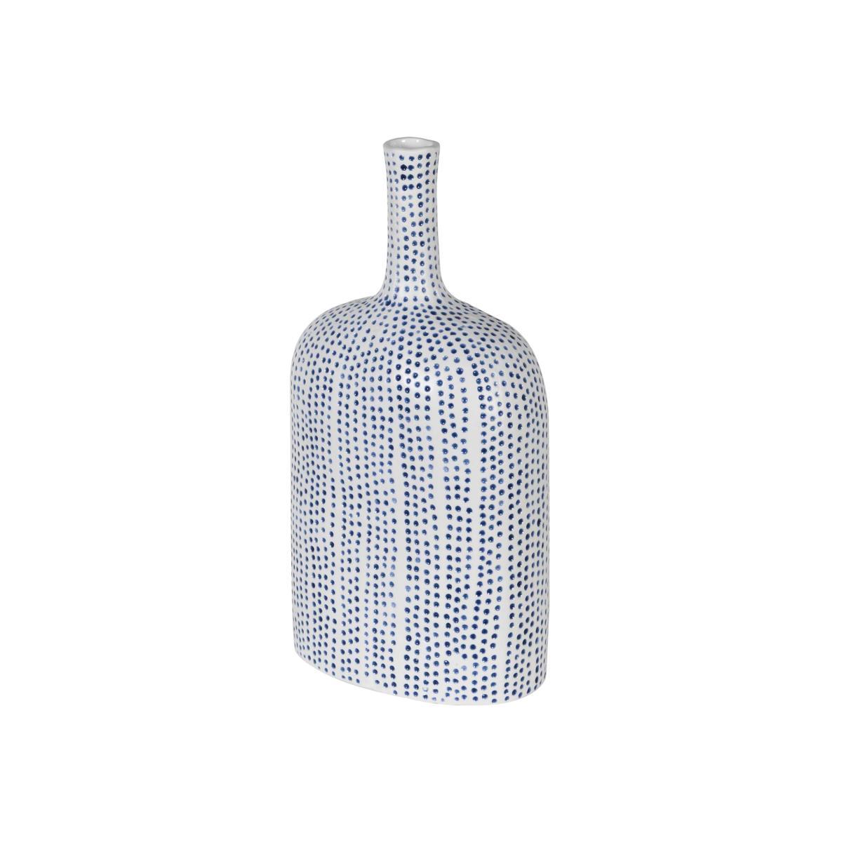 Design. The blue spot vase showcases a delicate dotty design in an array of blue hues, set upon a white background, and giving a nod to aboriginal inspired pattern and design. The blue spot vase is sure to dress up any windowsill or sideboard, adding a subtle dash of colour and offering the perfect place to hold a single flower.