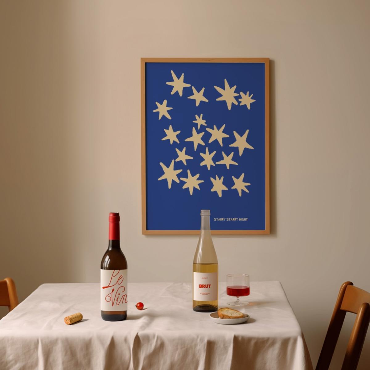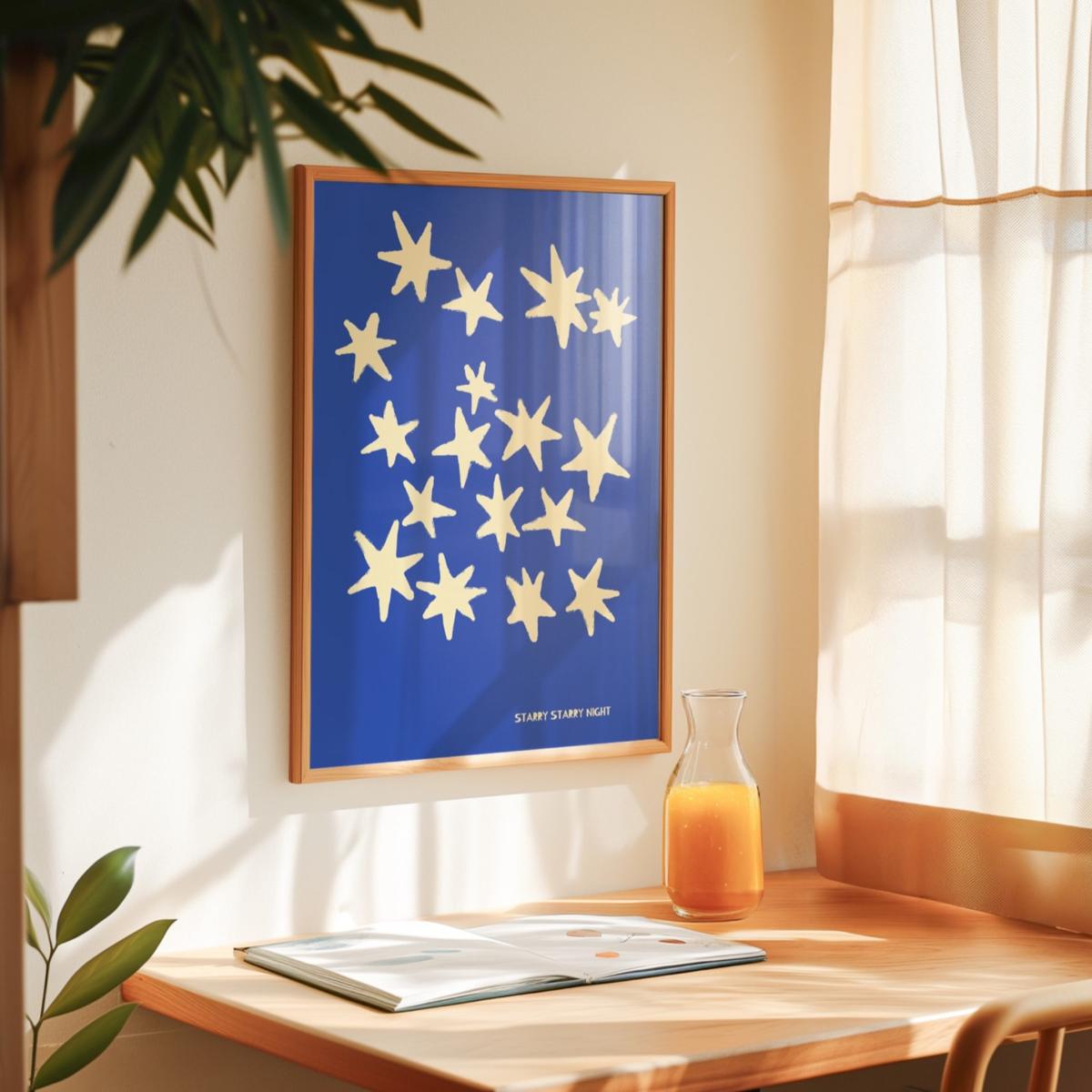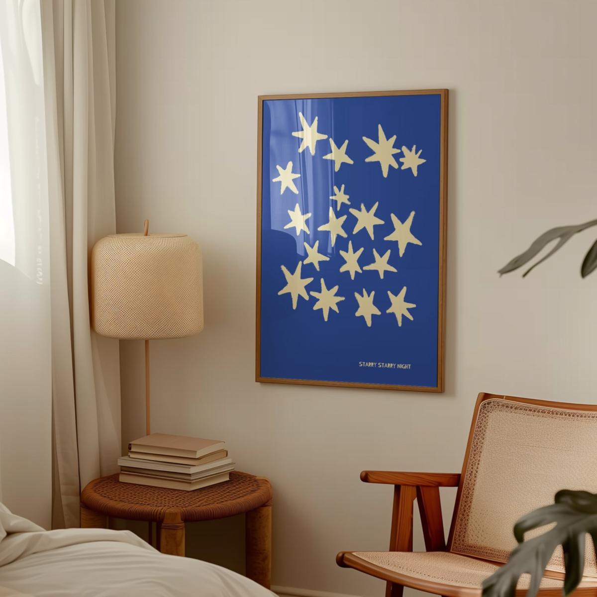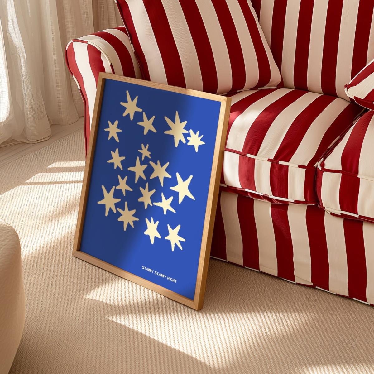 I love the Blue Starry Starry Night print for its bold, graphic quality and its nostalgic nod to retro aesthetics. It works well in contemporary interiors, especially in spaces with a mix of modern and vintage pieces, adding colour and visual interest without overwhelming the room. To style this print effectively, consider placing it above a neutral sofa or bed to serve as a focal point, or use it in a gallery wall alongside other curated artworks for a curated, eclectic look. Pair it with minimal framing and keep surrounding decor simple to let the design shine, making it a versatile statement piece for living rooms or bedrooms.