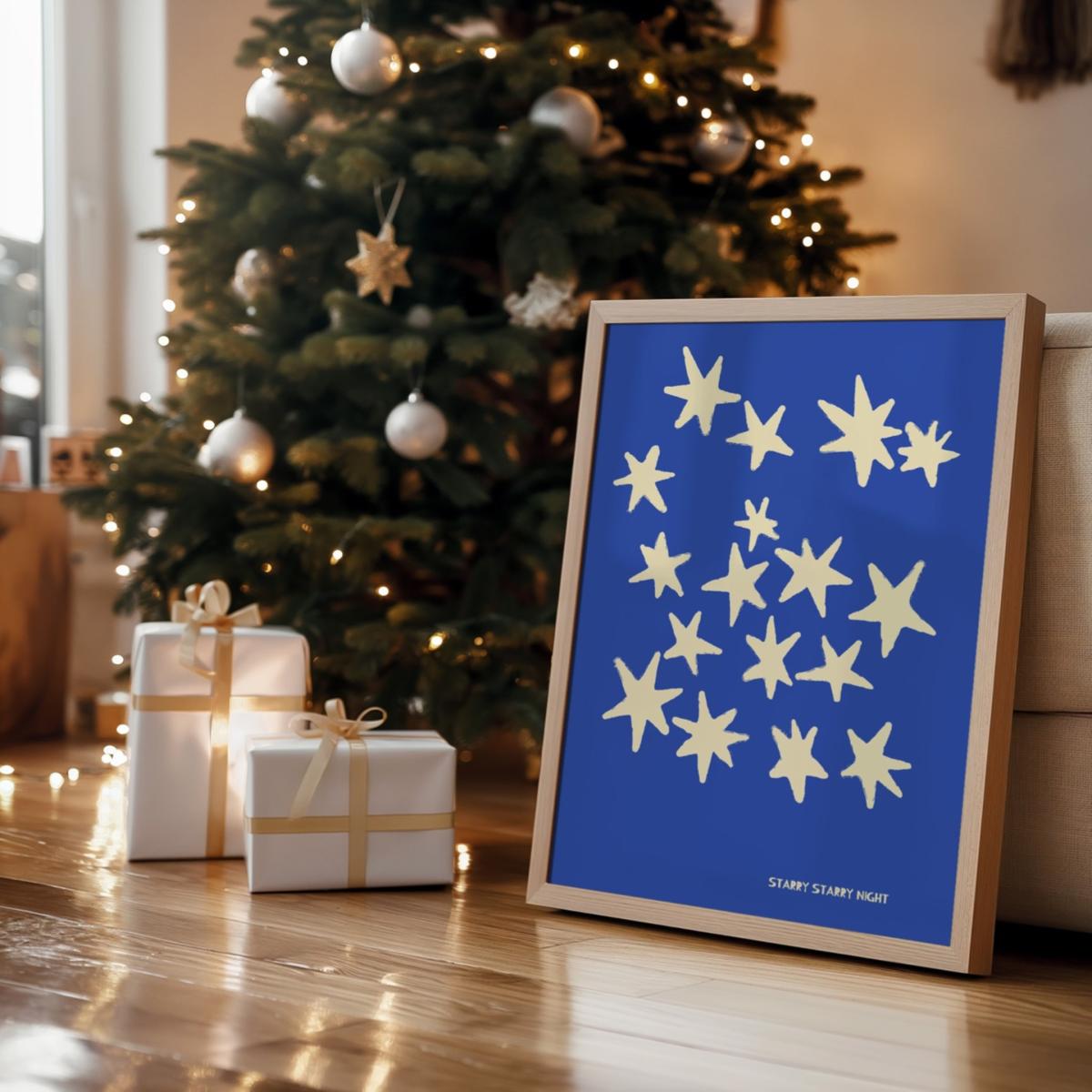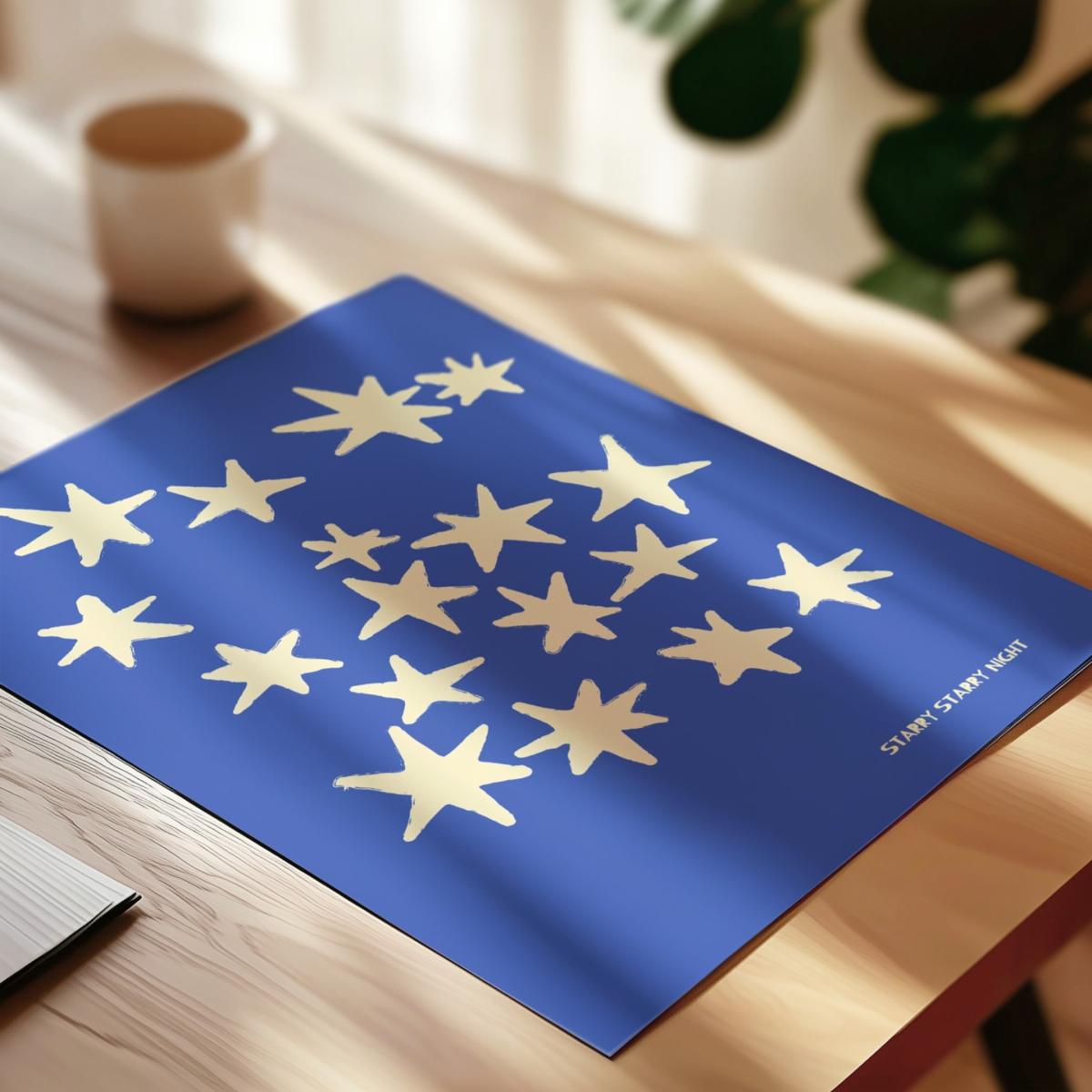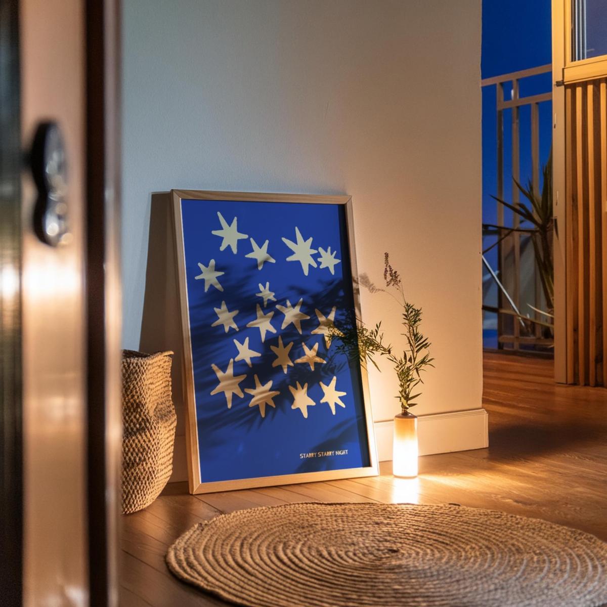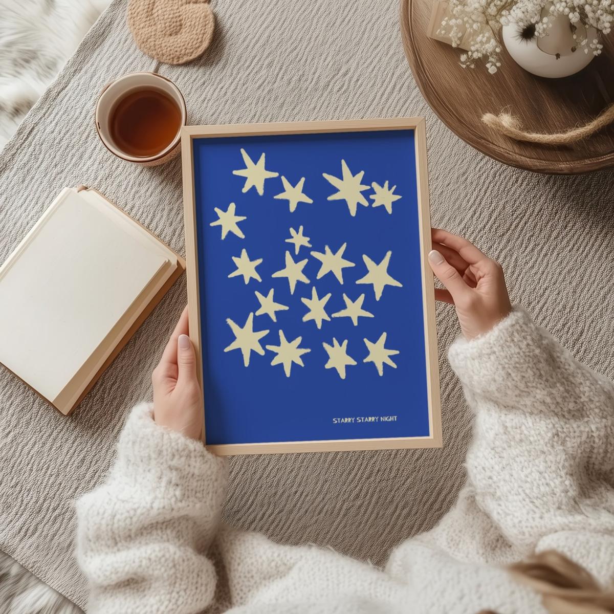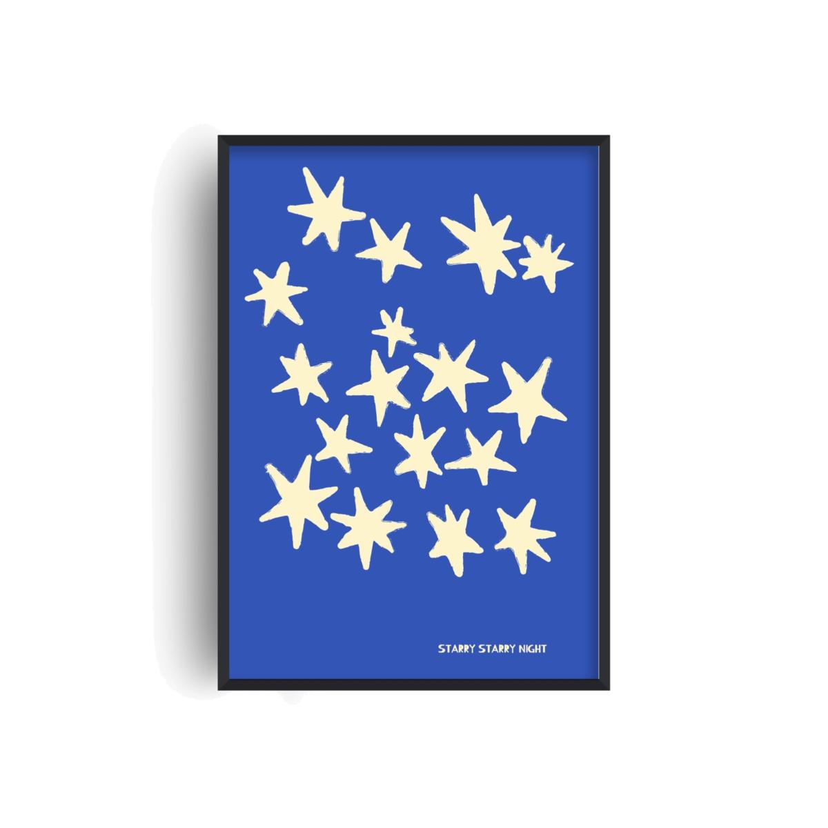 I love the Blue Starry Starry Night print for its bold, graphic quality and its nostalgic nod to retro aesthetics. It works well in contemporary interiors, especially in spaces with a mix of modern and vintage pieces, adding colour and visual interest without overwhelming the room. To style this print effectively, consider placing it above a neutral sofa or bed to serve as a focal point, or use it in a gallery wall alongside other curated artworks for a curated, eclectic look. Pair it with minimal framing and keep surrounding decor simple to let the design shine, making it a versatile statement piece for living rooms or bedrooms.