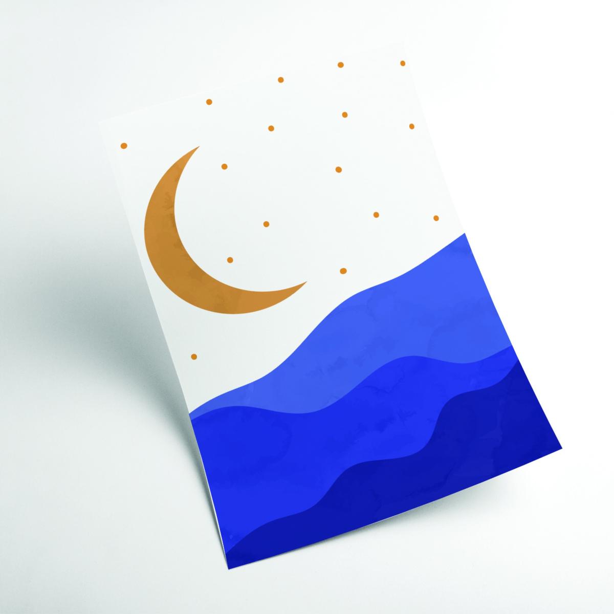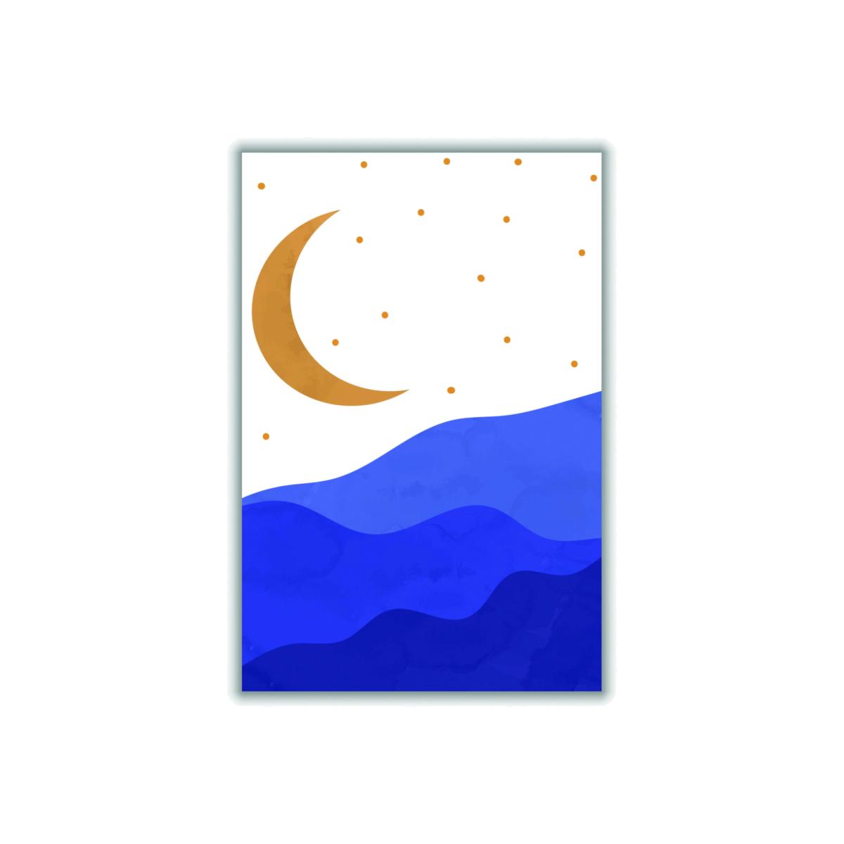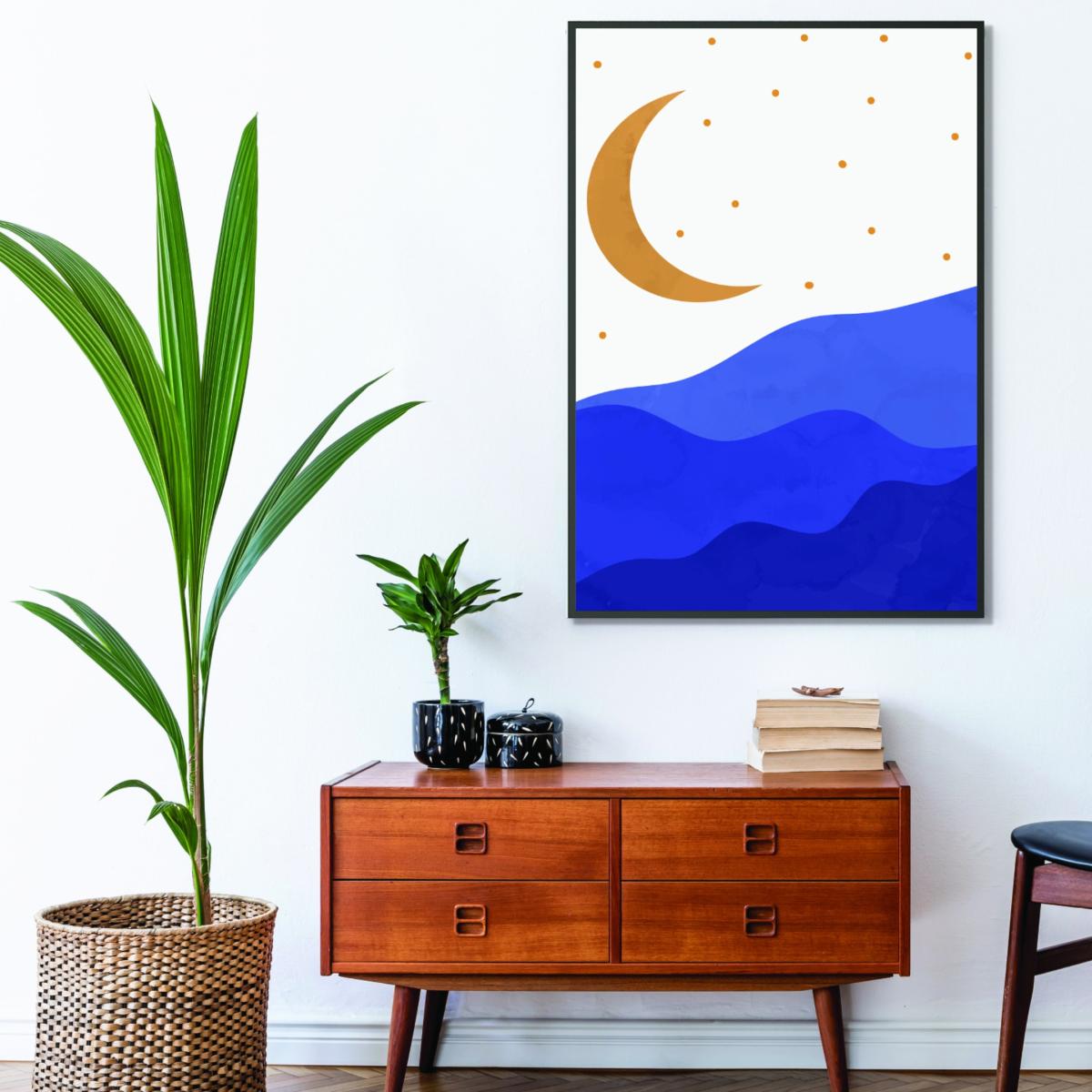 This print is a striking piece that combines bold colour blocking with minimalistic celestial elements, making it ideal for adding a modern, uplifting touch to contemporary interiors. I love how the deep blue waves and golden moon create a sense of calm and balance, perfect for living rooms, bedrooms, or even creative spaces. To style it effectively, consider pairing with neutral or monochrome furnishings to let the artwork stand out, or contrast with warm metallic accessories for a cohesive look. It works particularly well in spaces with clean lines and minimal clutter, acting as a statement piece that elevates the overall aesthetic. Practical framing choices like a sleek black or white frame will keep the focus on the artwork while ensuring versatility across different decor themes.