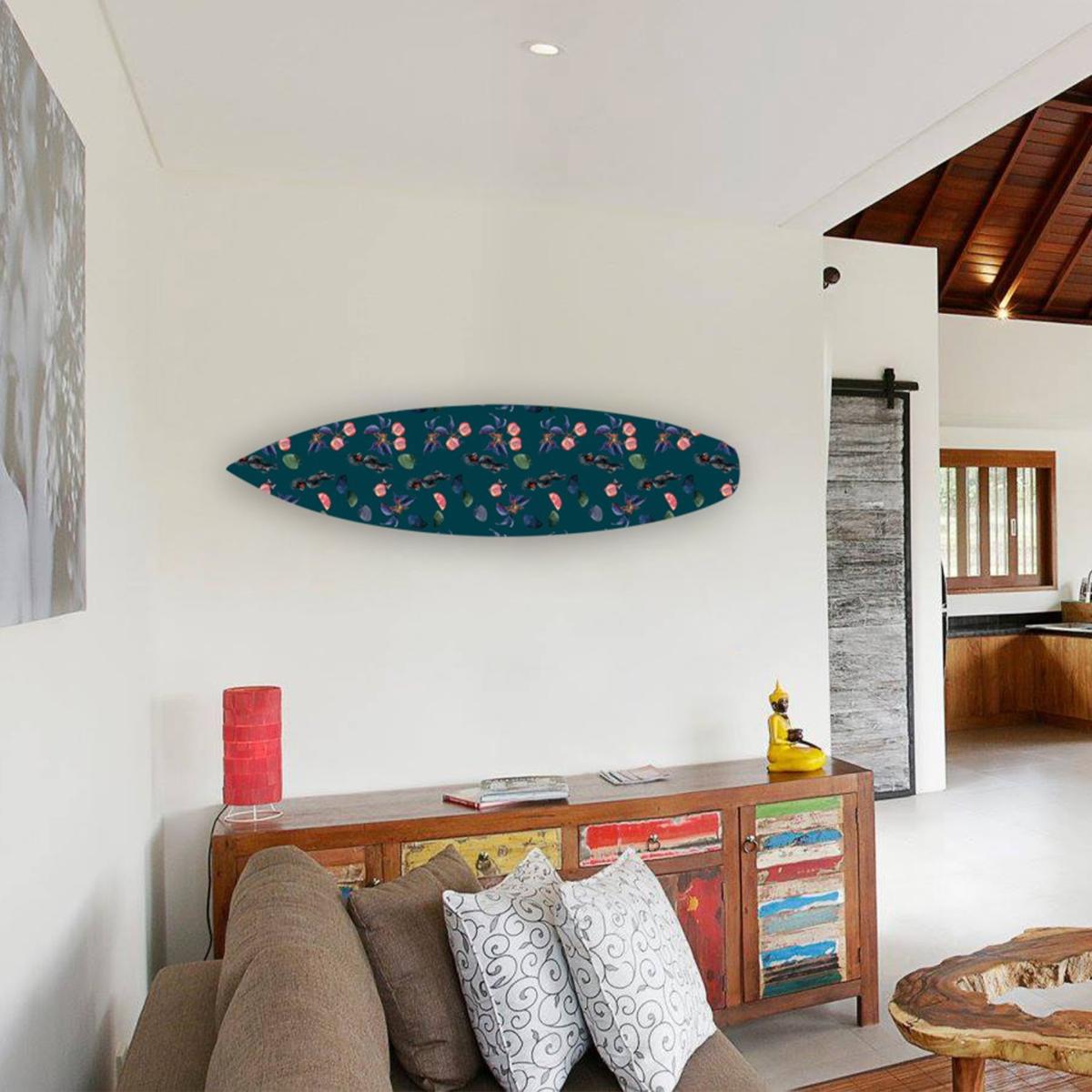 This decorative surfboard with pomegranates and leaves has an elegant and playful look. This wall surfboard is a statement piece in any room. The wall decor surfboards are handmade of sustainable poplar wood in our creative manufacturing studio in The Hague, Netherlands. After the wall surfboard is ready, it will be provided with an original hand-painted art print from artist Femke Zwaan. Each artfully decorated design is first hand-painted by owner and designer Femke Zwaan and then meticulously translated into an art print to preserve the unique look of hand painting and fresh brush strokes. Catchii Homeware products enliven rooms and brighten up every interior.