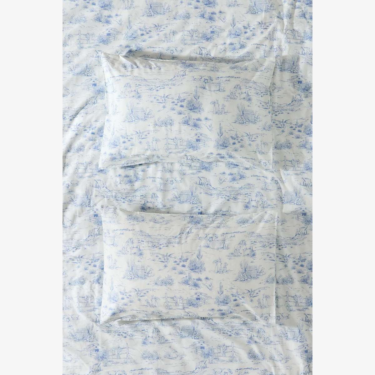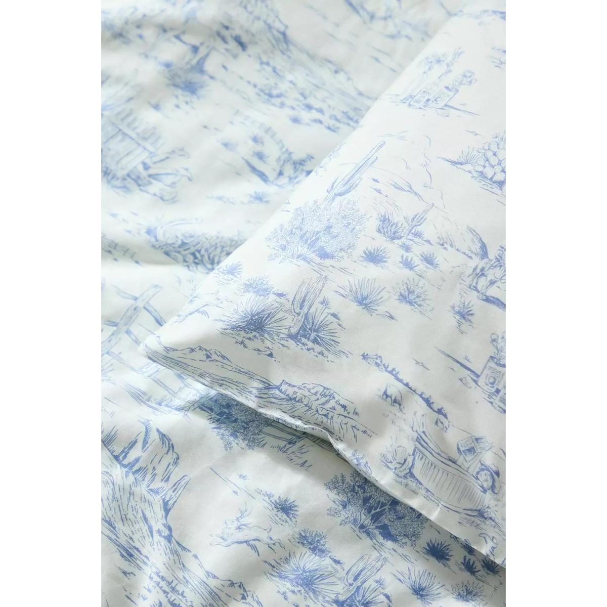Refresh your bedroom with this pretty bedding. Crafted from cotton, it features a Western-inspired toile print in blue. Duvet cover and matching pillowcases included. **About Better Cotton** \- By choosing our cotton products, you’re supporting our investment in Better Cotton’s mission \- This product is sourced via a system of mass balance and therefore may not contain Better Cotton \- Bettercotton.org/massbalance **Content + Care** \- 100% Cotton \- Machine wash **Size** \- Single (includes 1 pillowcase): 135cm (W) x 200cm (H) \- Double (includes 2 pillowcases): 200cm (W) x 200cm (H) \- King (includes 2 pillowcases): 230cm (W) x 220cm (H) \- Pillowcase: 75cm x 50cm