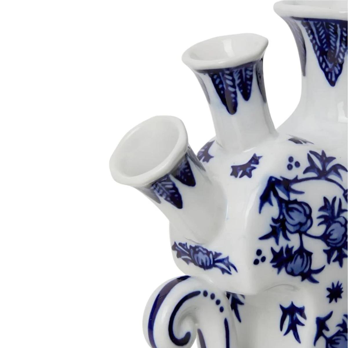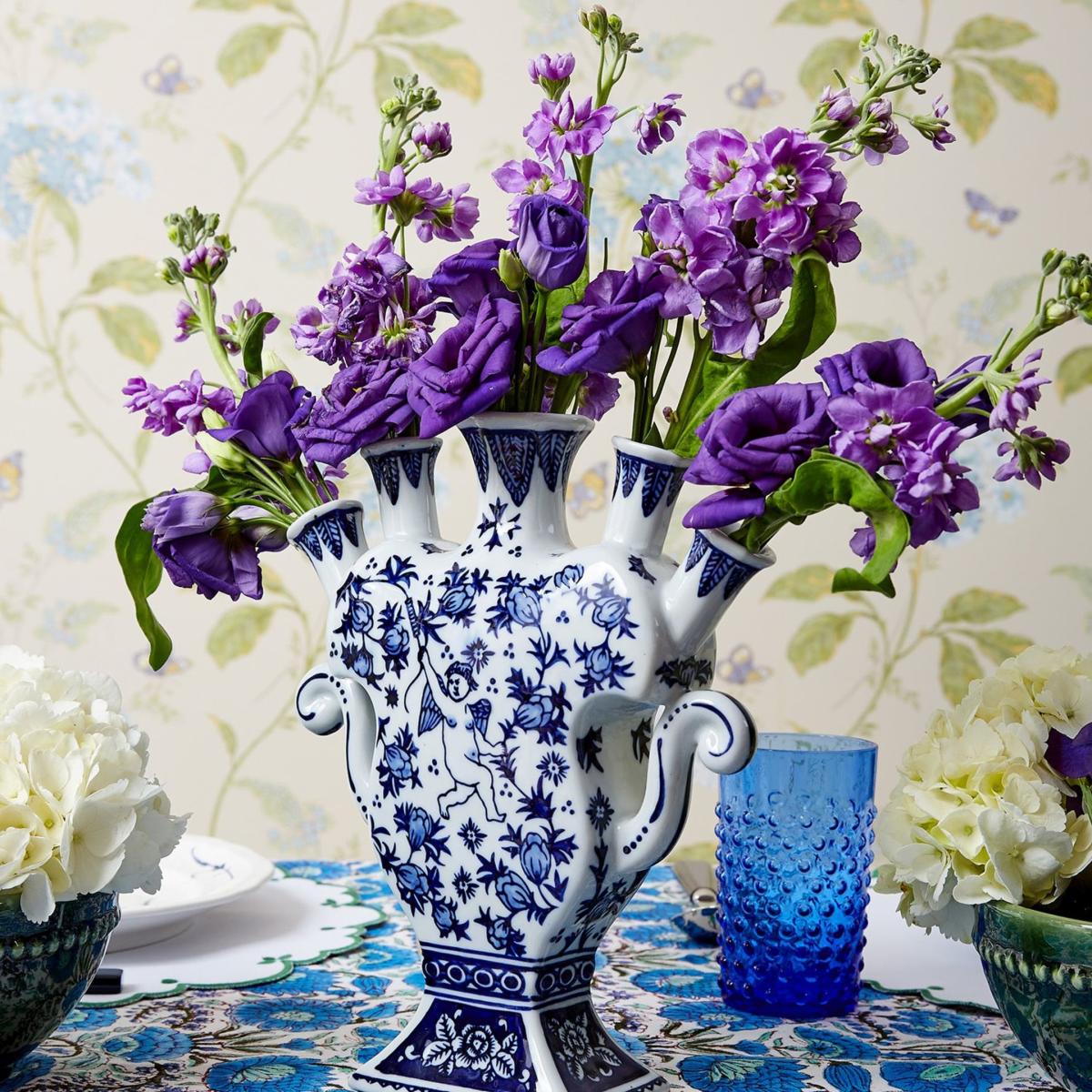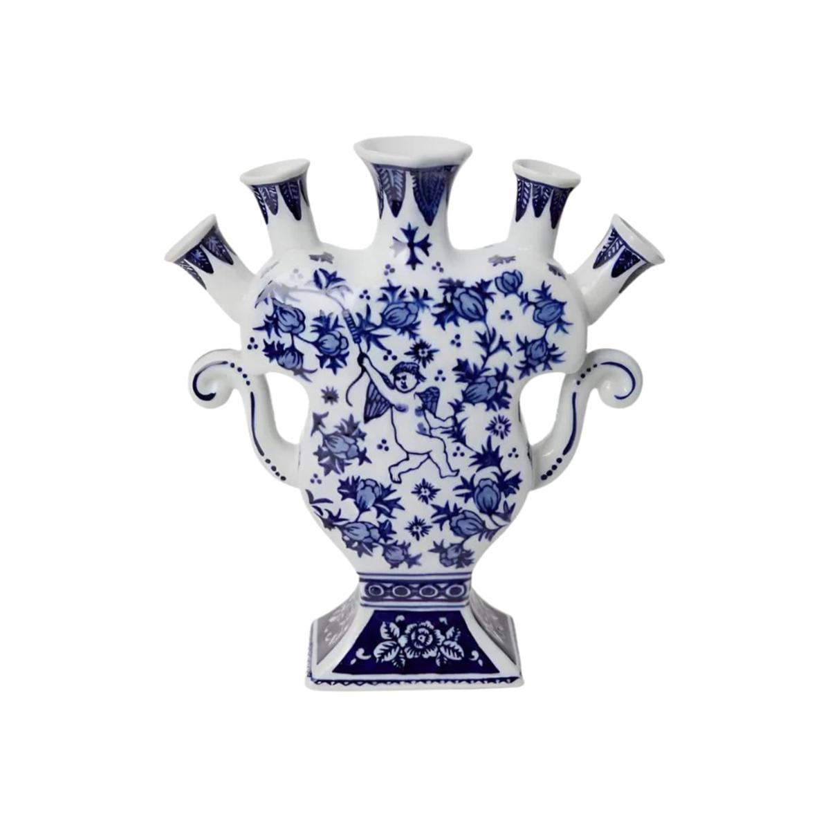 A tulipierie intending to impress, the earthenware material is covered with sprawling patterns. At the centre is a cherub, as the day they were born, floating around a sprawl of flowers. It is a depiction of the divine colliding with the natural - of bountiful angels and blooming roses. The design is a tribute to the Delftware shown at the Rijksmuseum - the majestical height of art in Holland.