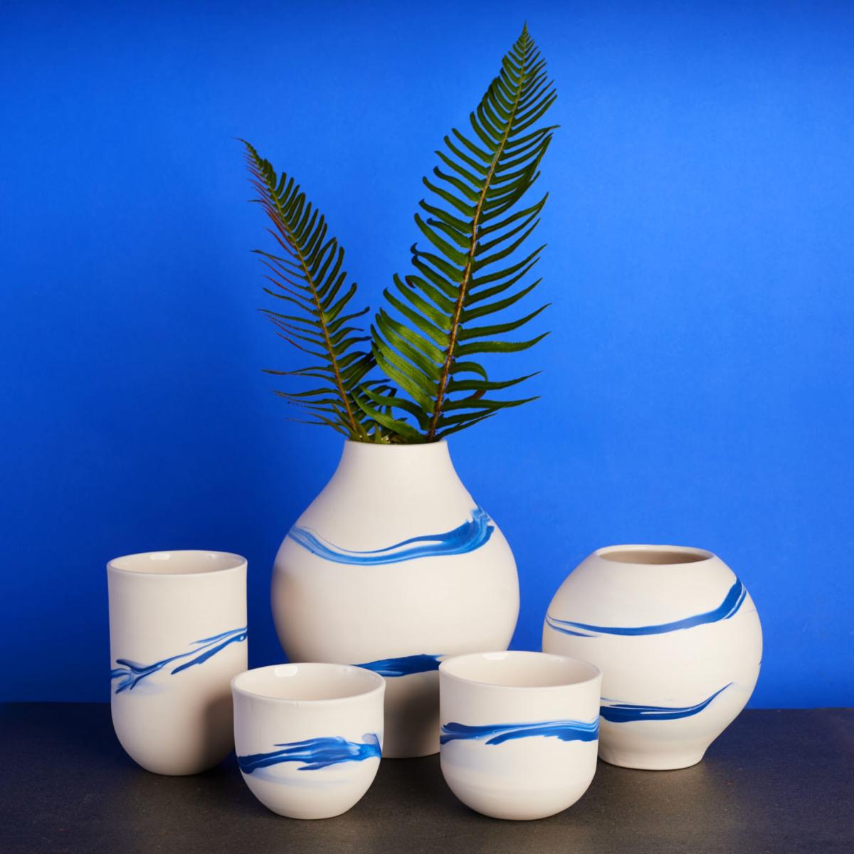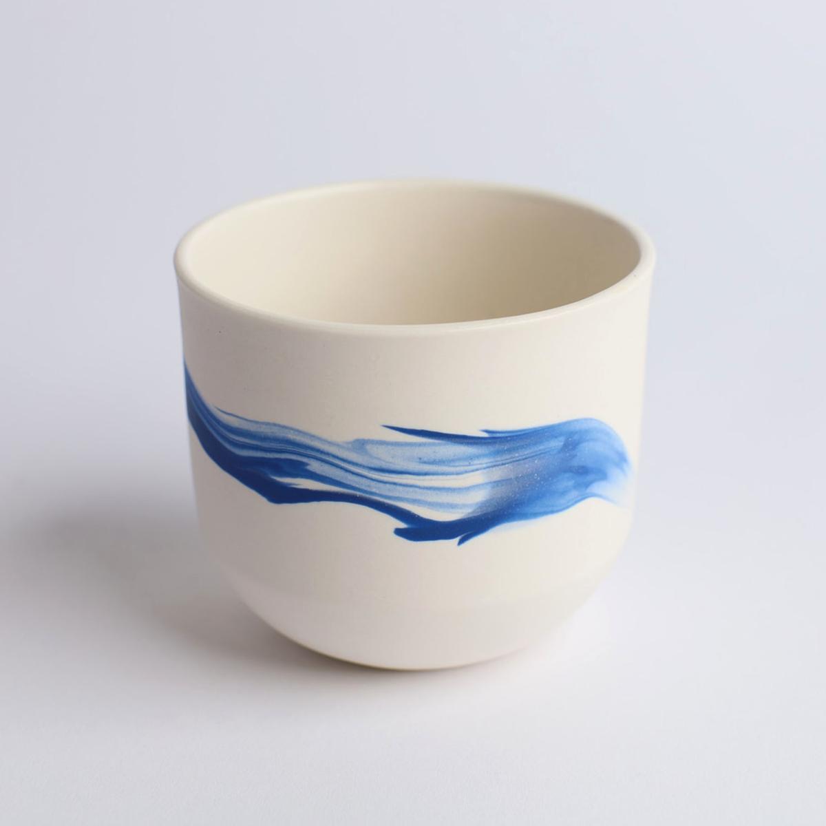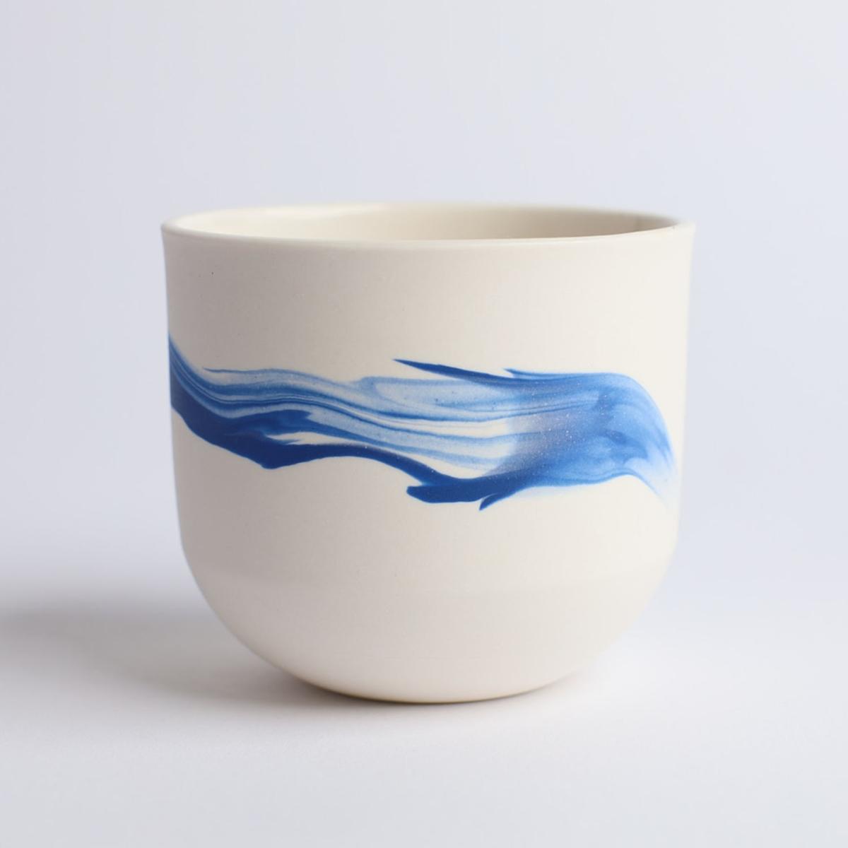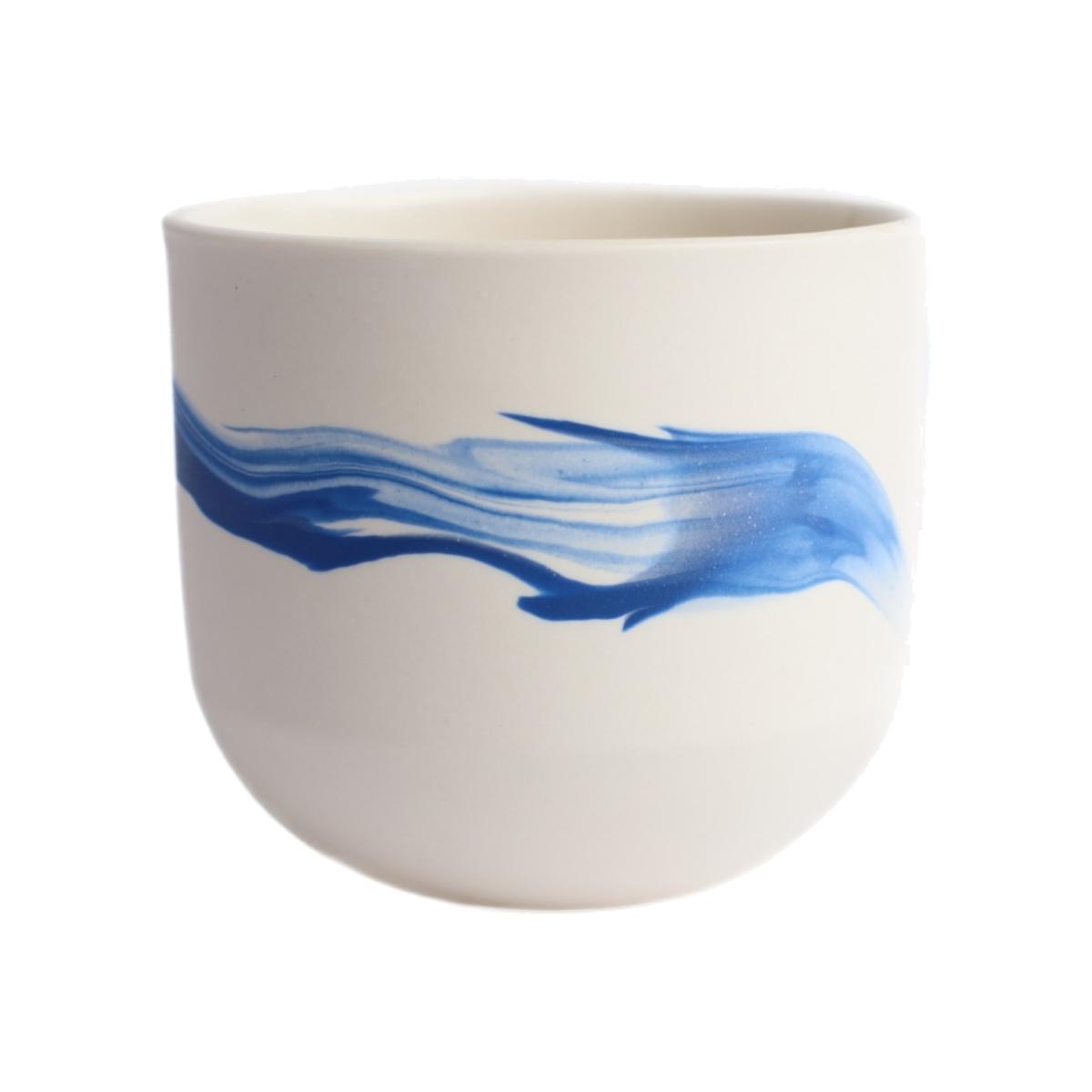 Marbled porcelain vessel / candle holder. Approximately 5 inches tall — beautiful complement to other pieces. Can also be used as a small vase, planter, candle holder, or decorative bowl. Its flexible role is part of its charm. Clear glazed interior, lusciously smooth hand-sanded exterior. Dishwasher safe. Due to their handmade nature, the swirl designs will vary, and tops may be slightly oval (not perfectly round).