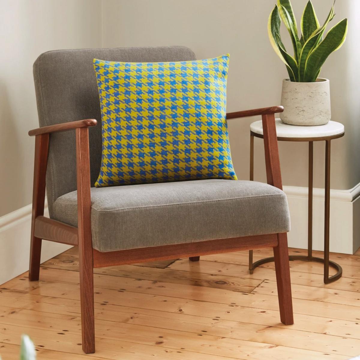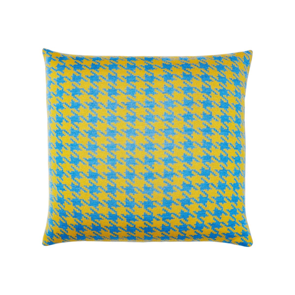 An elegant double layered fabric created from extra fine merino wool. This cushion displays a small houndstooth pattern stretching all over the surface on both front and back. A soft lightweight cushion perfect for your living room sofa, bedroom or office meeting room. Our cushions are all produced in London, with respect for people, the dignity of work and protection of our environment. Comes with a removable plump cotton cover insert with a polyester hollow-fibre & recycled merino filling. There is an invisible zip closure.