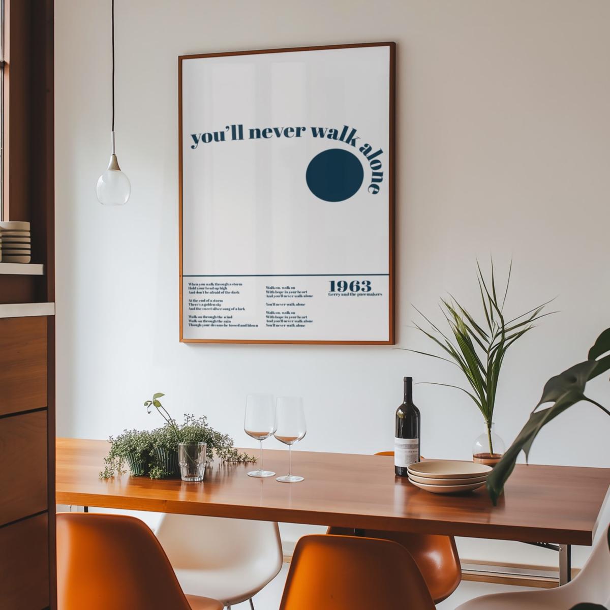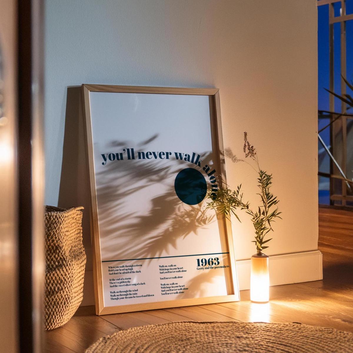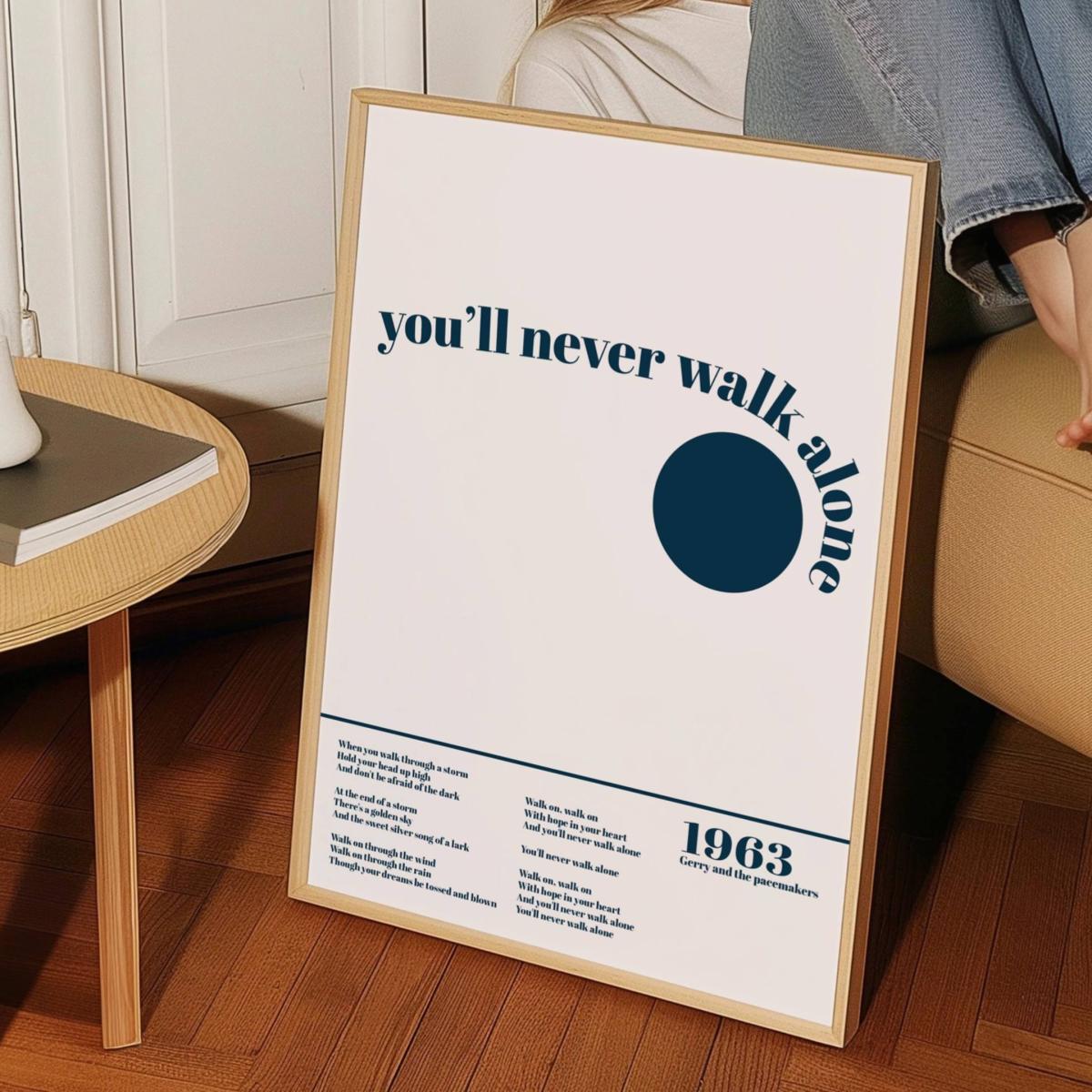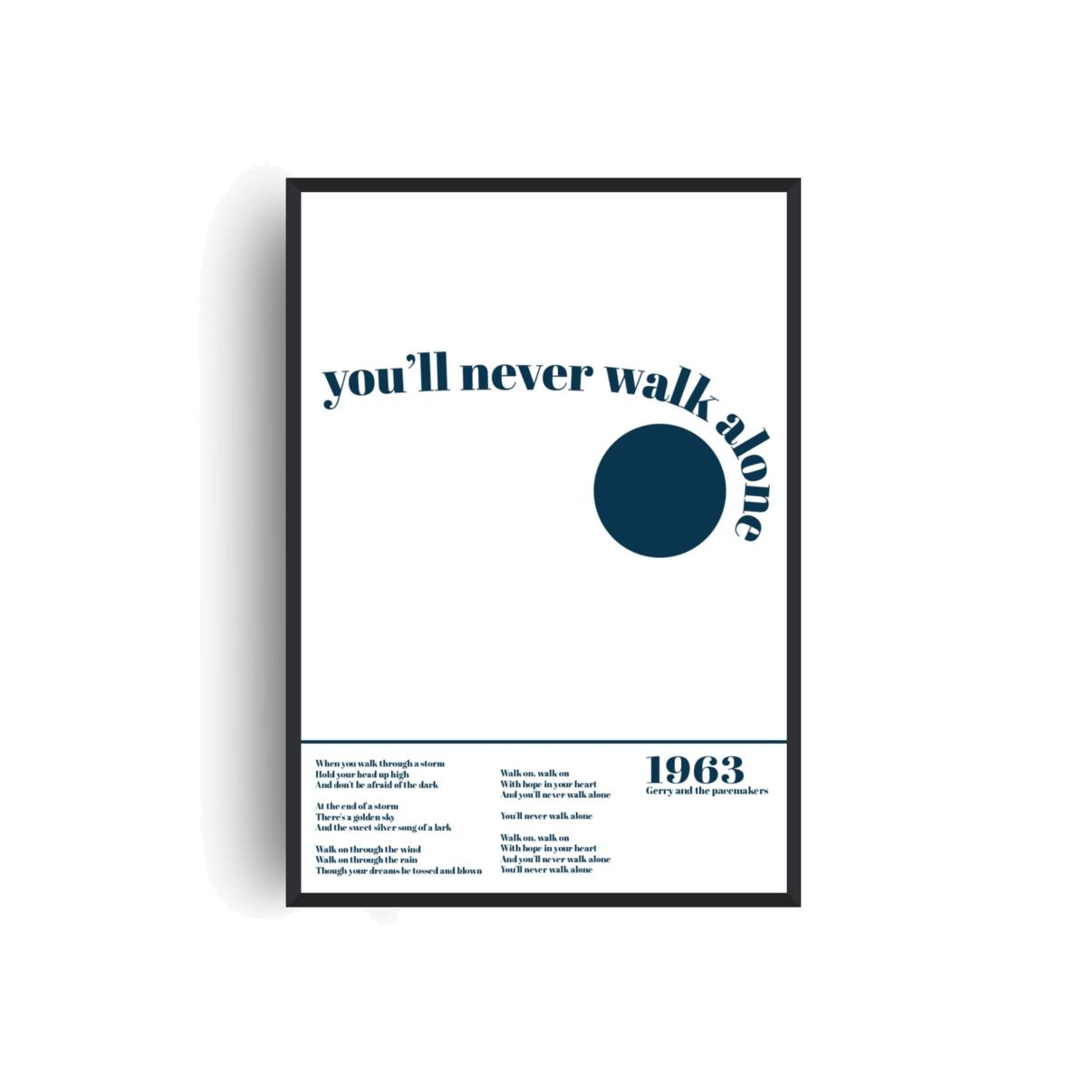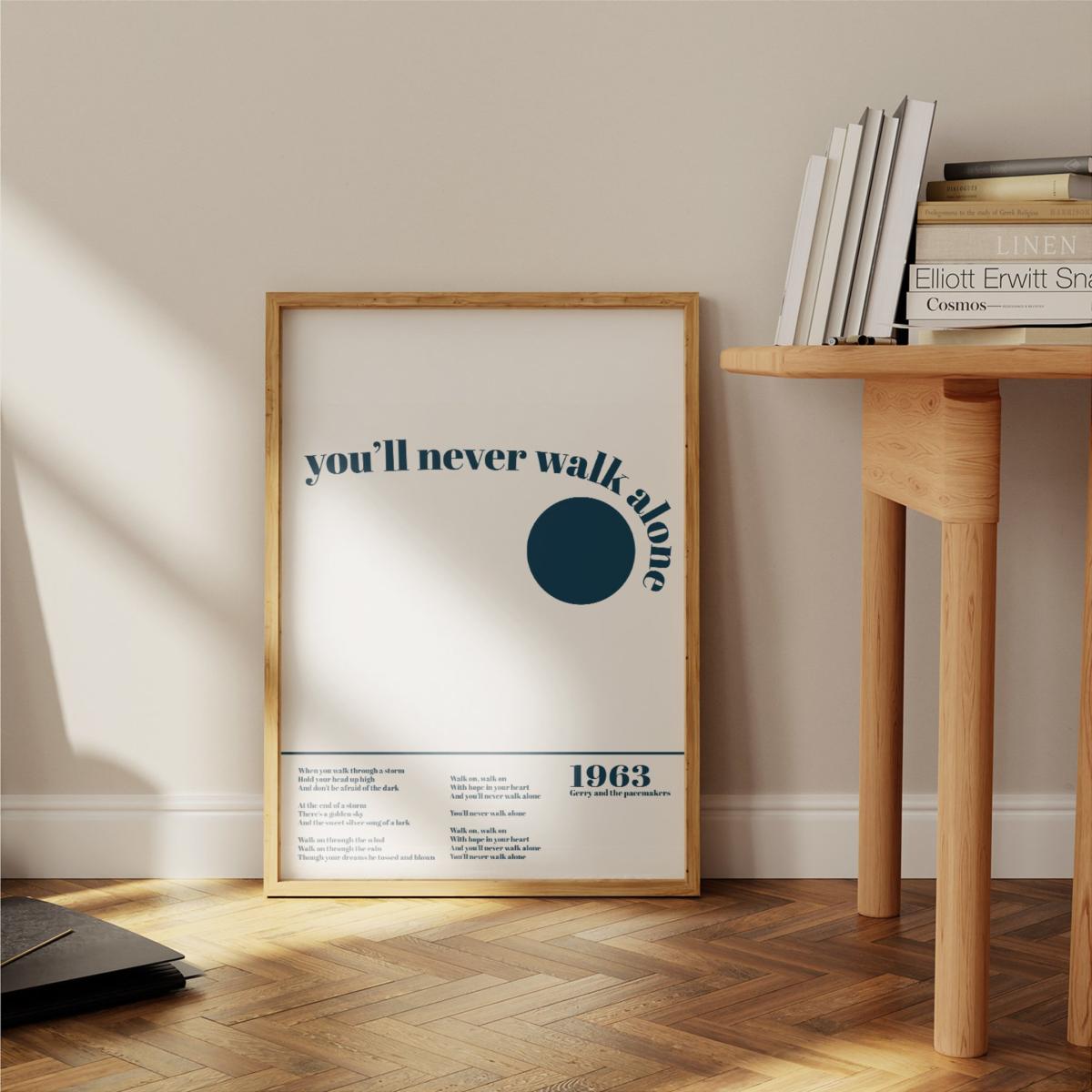 You'll never walk alone Giclée Art print, an anthem in its own right, this emotional song is the perfect addition to any house. A simplistic design with a 60s graphic feel. Add to a gallery wall or pair with a spider plants and sideboards for the perfect mid century inspired space. Sold without frame Giclée printed on Munken pure smooth cream paper which is certified by the Rainforest Alliance Program for FSC® Standards.