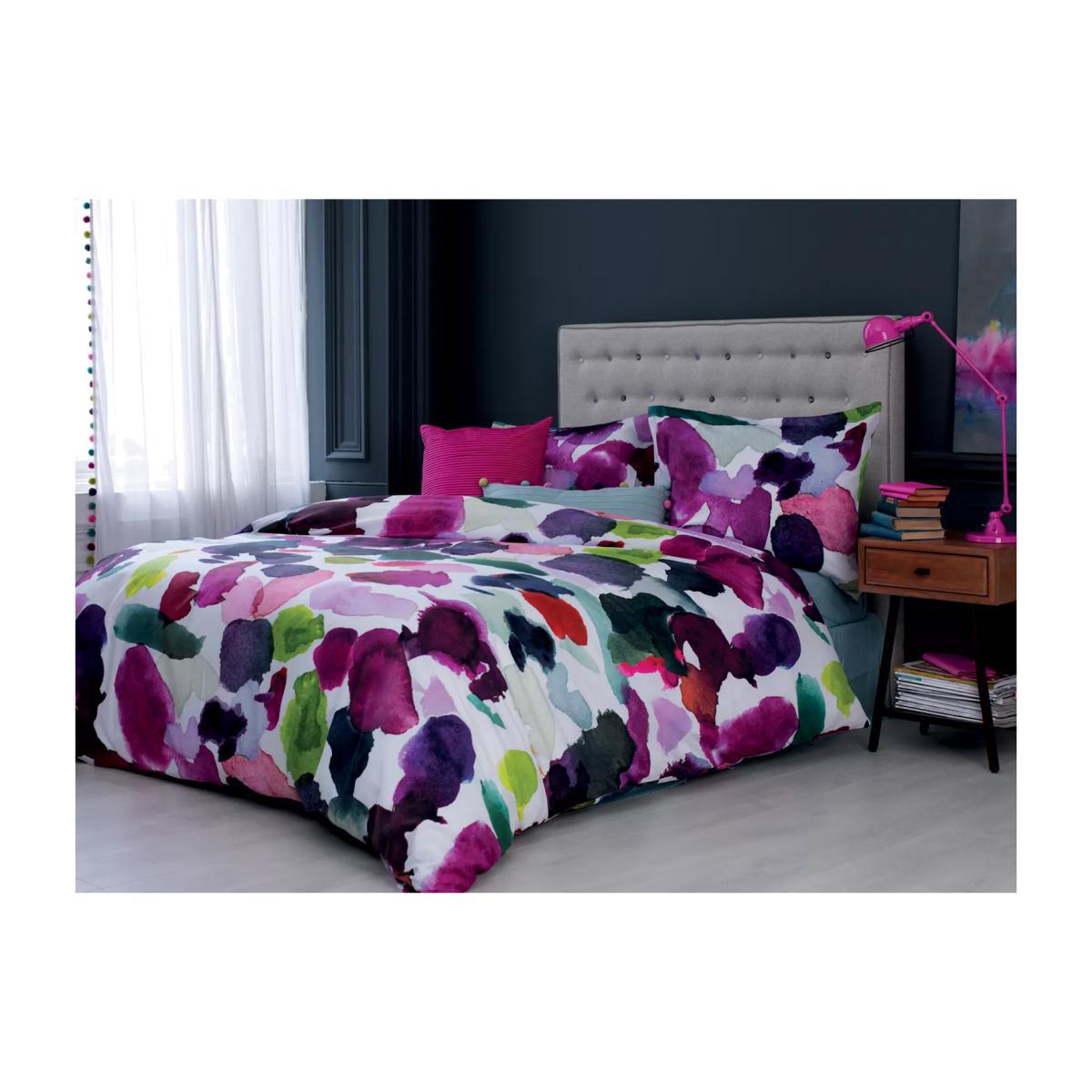 This stunning duvet cover is luxurious and high quality with a directional abstract print. The unique and vibrant design features organic watercolour marks, as well as a unique colour palette, which perfectly balances brights and neutrals. The ultimate style statement, this Abstract printed duvet cover from bluebellgray will add a welcome pop of colour to a cool-coloured bedroom, or complete a bright colour scheme. It is woven from high quality cotton at a thread count of 220 for a soft, luxurious feel against your skin. Made from pure cotton for a cool, breathable feel, which will aid temperature regulation and help wick away moisture lost during sleep. Designed in Scotland bluebellgray is a celebration of vibrant colour and all things floral, recreated with love and care for your home. Each bluebellgray design is handpainted in the boutique brand's Scottish studio, before being transformed into gorgeous linens and textiles. The single set comes with one standard pillowcase, while the double, king and super king sets come with two standard pillowcases. Additional individual standard pillowcases are available to purchase separately. Have you thought about sheeting? Shop here. Size guide Bedding size To fit duvet/pillow size (cm) Standard pillowcase L75 x W50cm Single duvet cover L200 x W135cm Double duvet cover L200 x W200cm King duvet cover L220 x W225cm Super king duvet cover L220 x W260 cm
