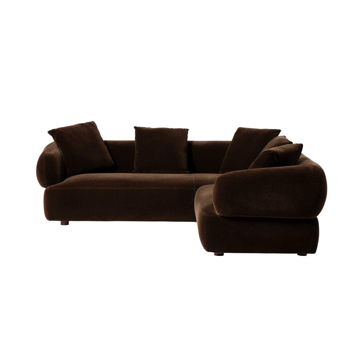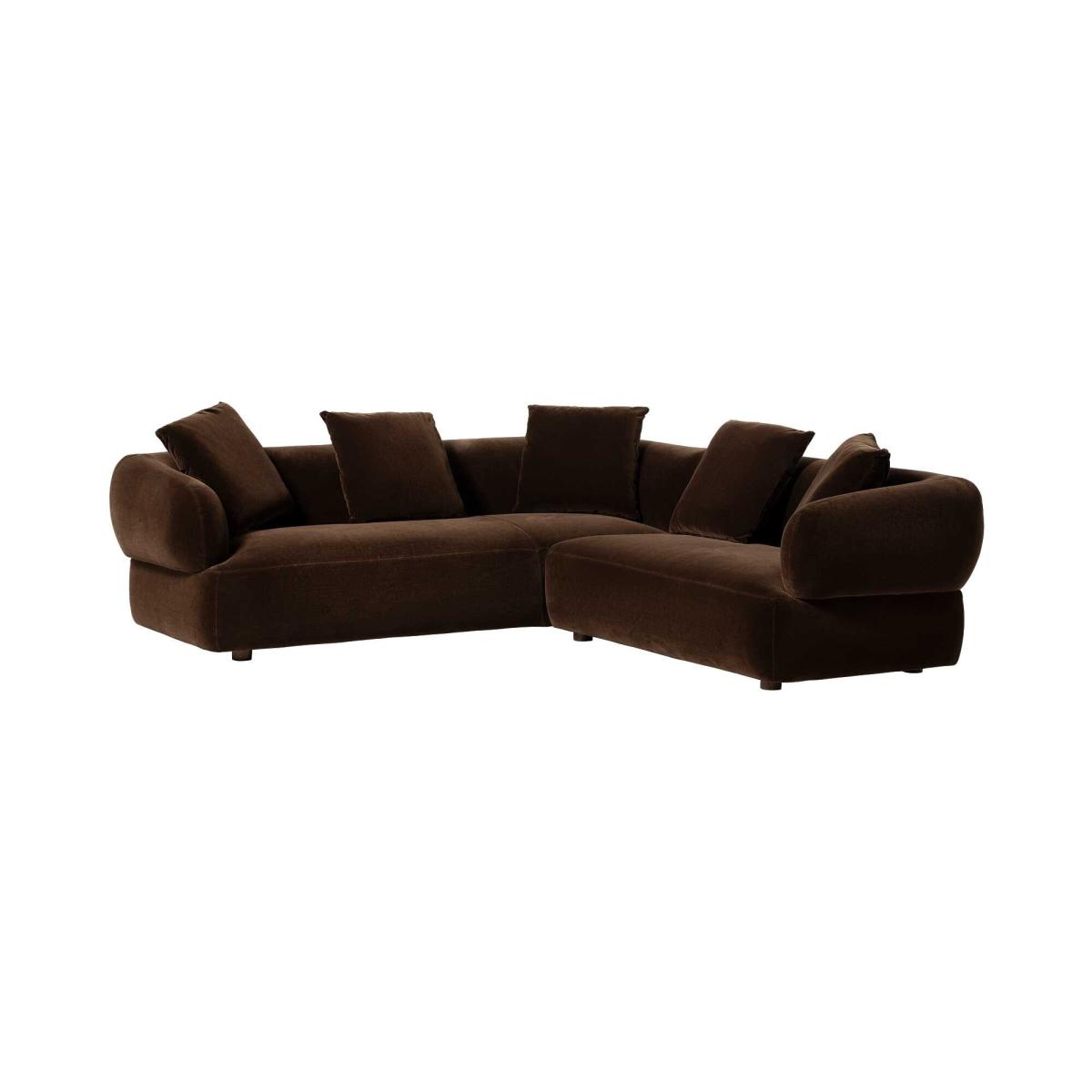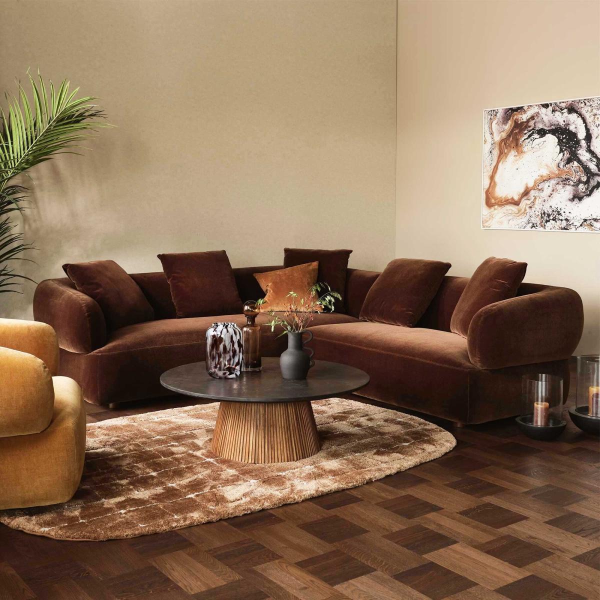 I’d refer to this as the Blume corner sofa - it’s a smart choice if you’re after generous seating without a rigid, boxy feel. The deep brown upholstery feels grounding in both contemporary and more traditional schemes, and its low, curving arms give a relaxed, almost modular look. In a living room with soft neutrals or muted terracotta walls, it really comes into its own. For styling, keep cushions in varied textures - think a wool lumbar pillow or a linen square in a contrasting shade - then layer a chunky knit throw over the chaise end to signal where you’ll lounge. A natural-wood coffee table or an open-weave jute rug helps to lighten the palette, while a slim console behind the sofa can double as a display ledge and offer balance if the back faces into an open-plan space. Regularly rotate the scatter cushions and vacuum in those deep seats to maintain shape and avoid wear.