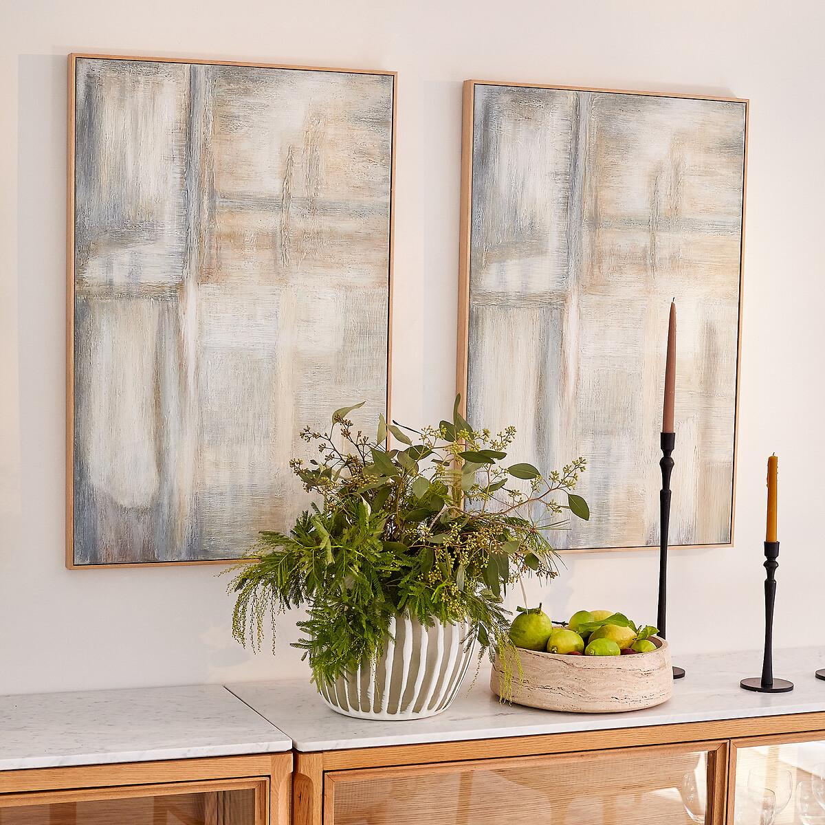 Like a transition between Impressionism and Abstract Expressionism. With its subtle mineral tones, this canvas reveals a silhouette emerging in the first light of dawn. Handcrafted, each piece is unique and reveals the painter's brushstrokes and the texture of the material. Product Details • Painting on 100% linen canvas • Hand painted: Each piece is unique • Oak frame. FSC® certified wood • Brackets for wall mounting (screws and plugs not supplied) • Horizontal or vertical hanging. Dimensions • Width: 60cm • Height: 90cm • Thickness: 2cm • WOOD FROM SUSTAINABLY MANAGED FORESTS. FSC® certified wood comes from forests that are environmentally, socially and economically well managed. Dimensions and weight of parcel • 1 parcel • W100 x H15 x D70cm. Weight 0.9kg.