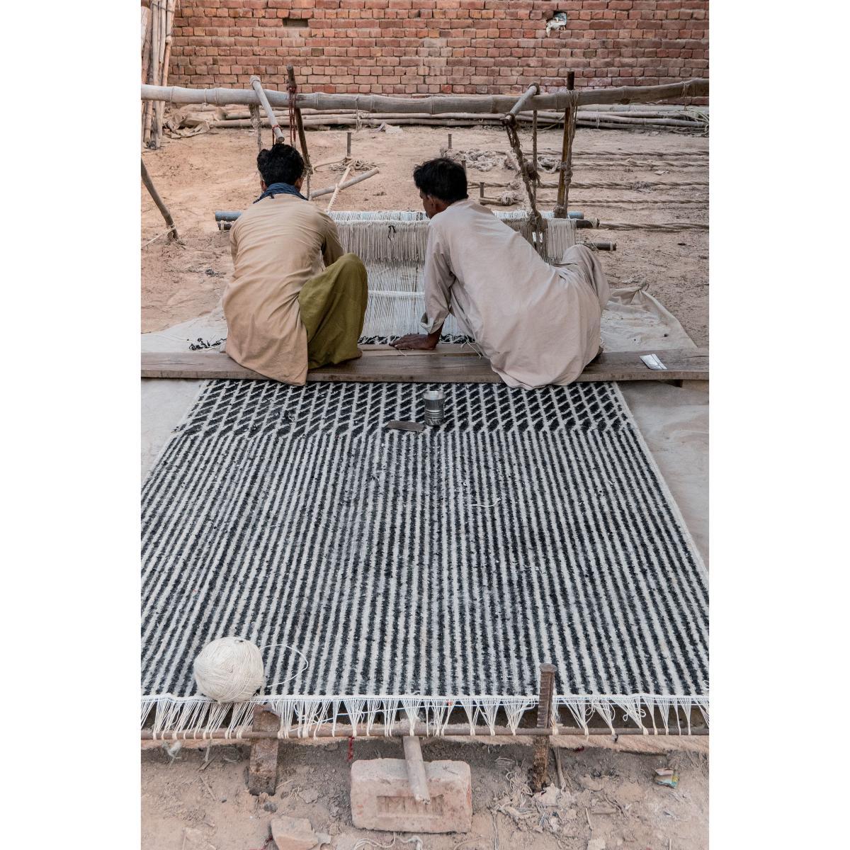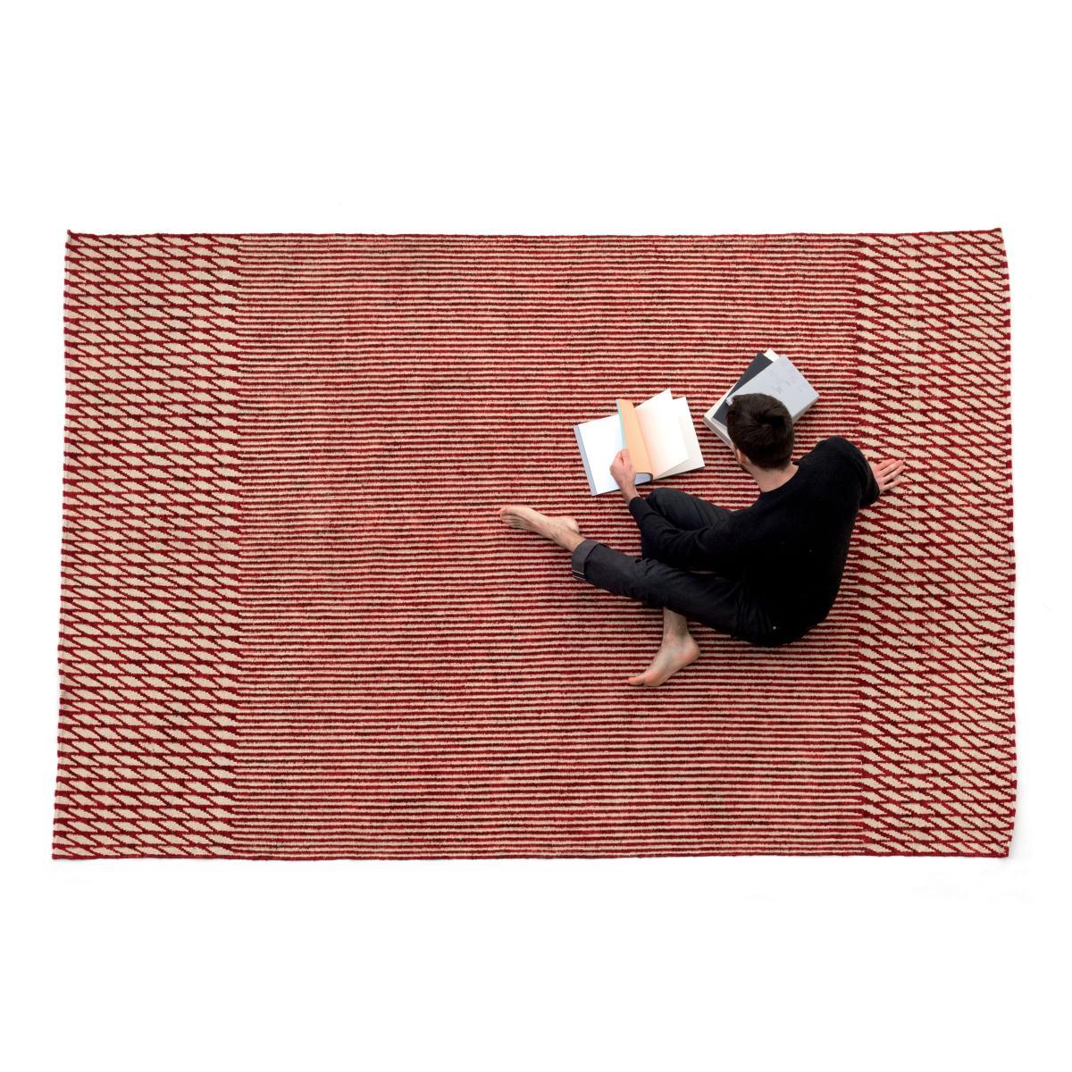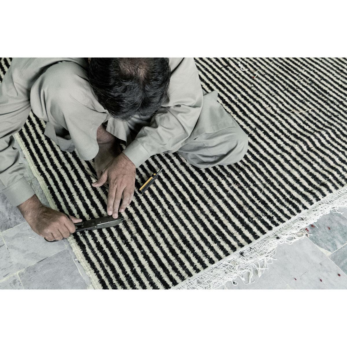 Created by the Bouroullec brothers, this collection of rugs is characterised by a unique pattern coming from a unique process! The finesse of the pattern (and its "blurred" effect when you look at it from a certain distance) is obtained by reversing the directions in which the Kilim rugs are traditionally woven. A more laborious technique than the traditional one but the result is in keeping with it: the optical effect is striking! Afghan wool is known for the quality, softness and length of its fibres. To produce each rug it has been spun by hand by Pakistani craftspeople. This makes each rug a unique piece, surprisingly soft to the touch and with colours which change significantly depending on the gradient of the fibres. Made completely by hand, this Blur rug (170 x 240 cm) is an exceptional piece, combining sophistication and technical complexity. The geometric and repetitive thread is emblematic of the Bouroullec style.