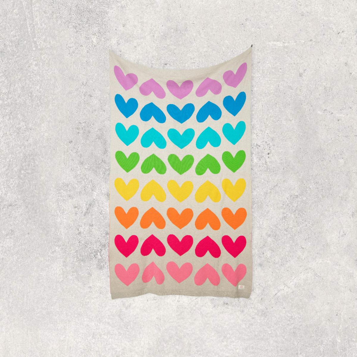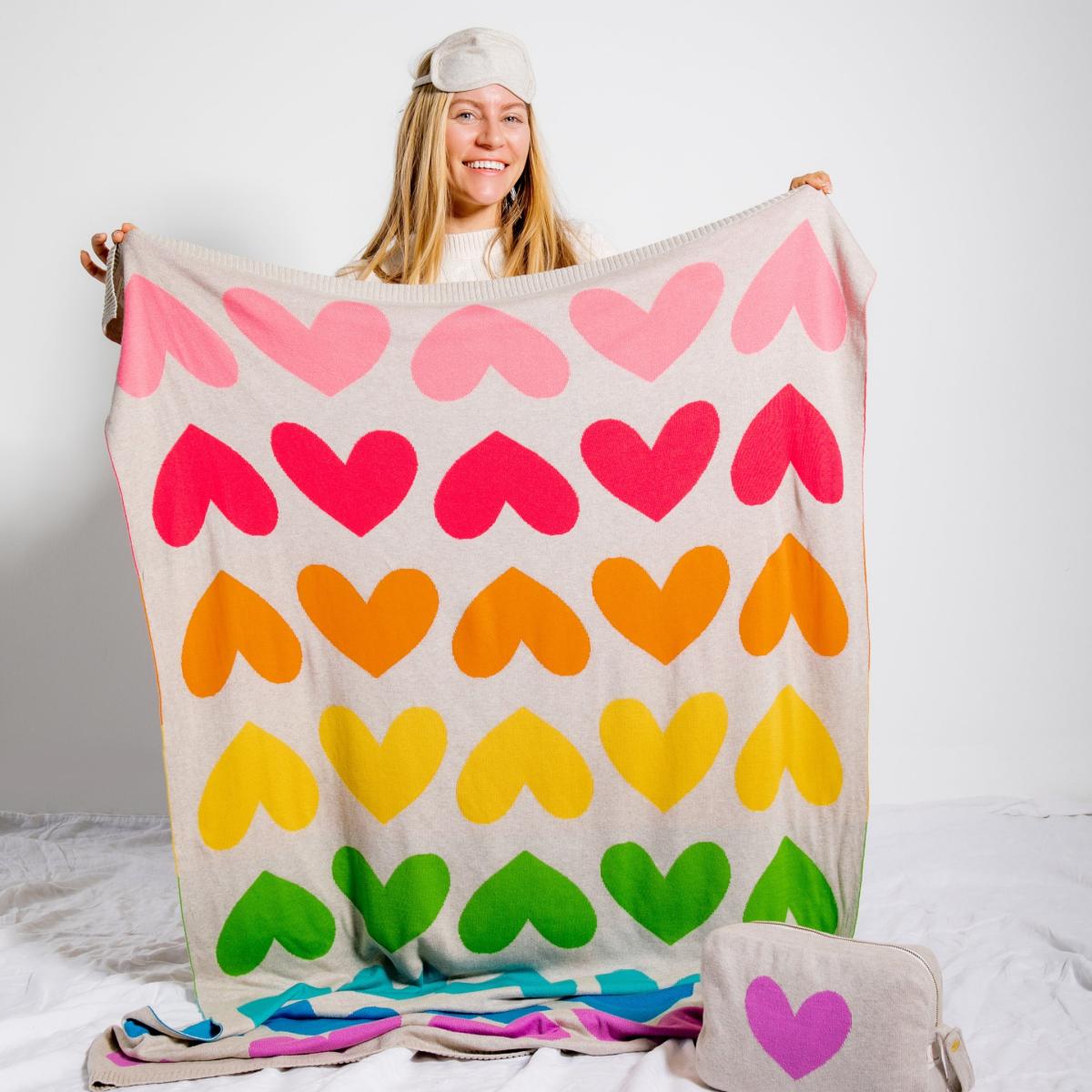 I love the pink lemonade blanket for its playful, retro feel and its bright, cheerful colour palette. It works particularly well in cosy, relaxed interiors like Scandi or eclectic schemes, where its lively hues can soften neutral tones or add a pop of colour. Practical styling tips include draping it casually over a sofa arm or layering it on a bed to introduce some warmth and character. Its fun heart details make it perfect for a family space or a child's room, but it’s versatile enough to brighten up any lounge with a touch of lighthearted charm.
