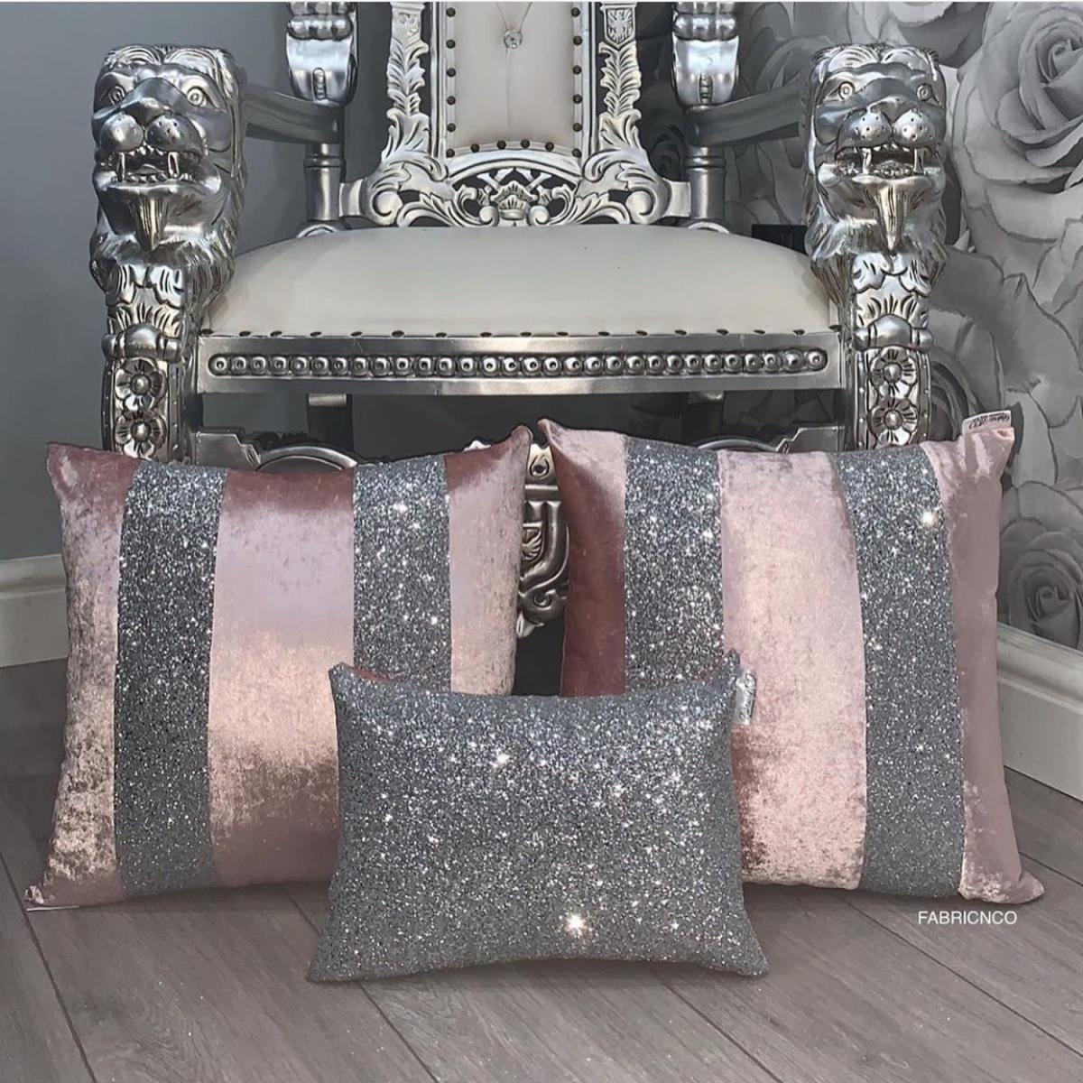 Crushed velvet set of cushion covers finished in blush pink with silver sparkle.