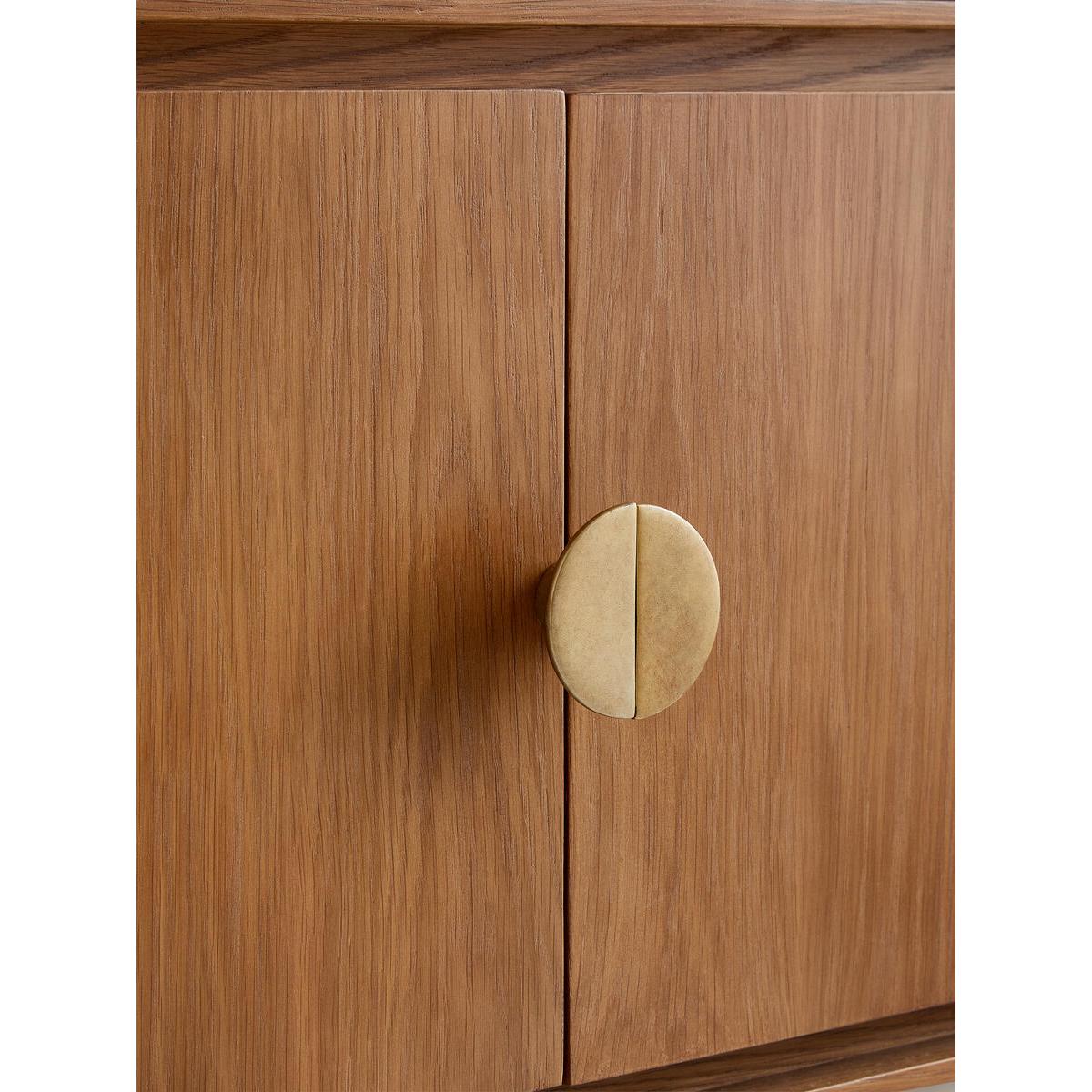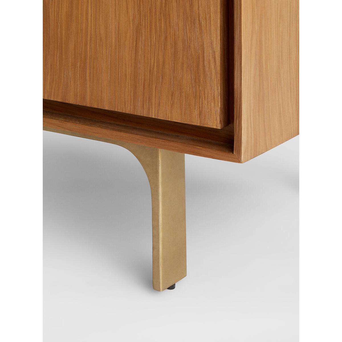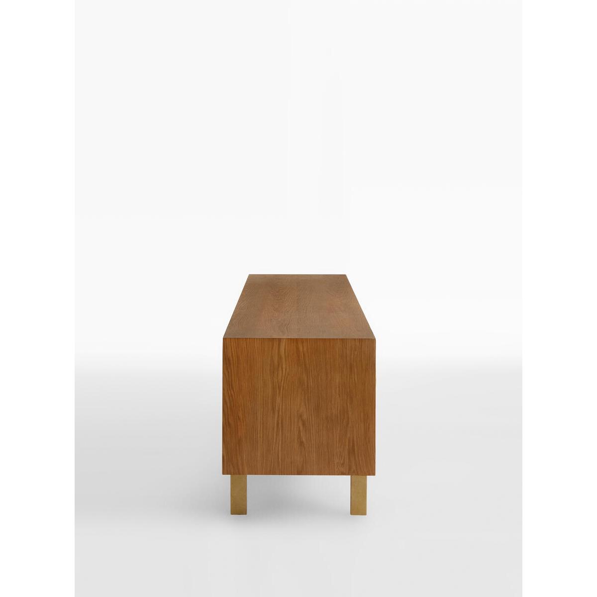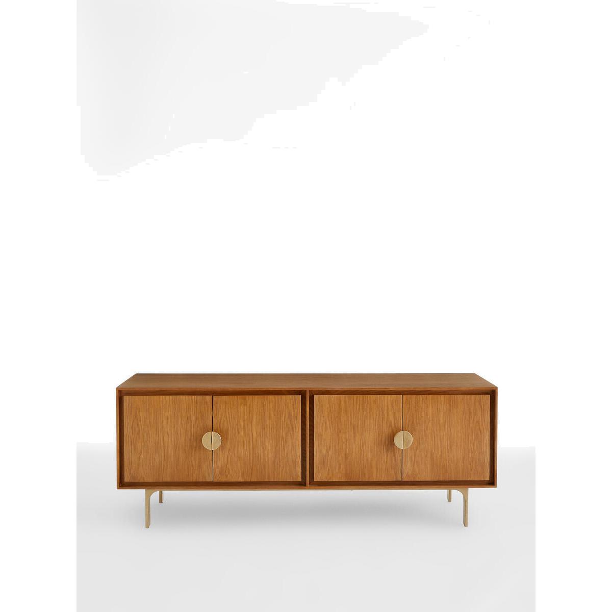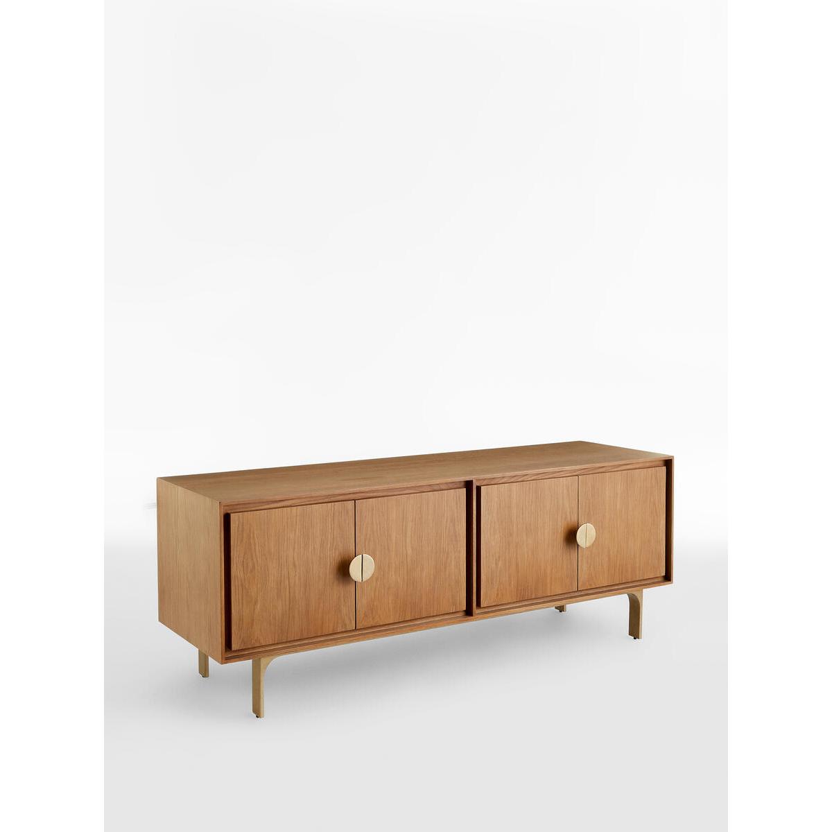 Fill out your living space with the Blythe media unit, craftedfrom solid oak and oak veneer in a mid-tone oak finish. Completewith rounded statement handles and a cast effect frame, the mediaunit has four doors with cable cut-out detail. It's a great way tobring a touch of Soho House Berlin to your home. Solid oak and oak veneer media unit. Mid-tone finish. Cast-coloured effect legs and frame. Statement handles. Channel around each door front. Four-door media unit with cable cut-out. Inspired by Soho House Berlin.