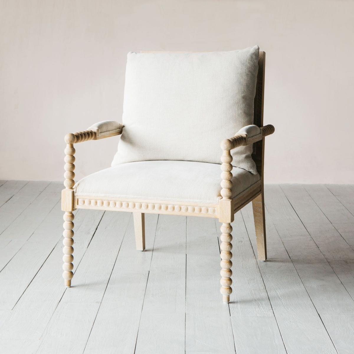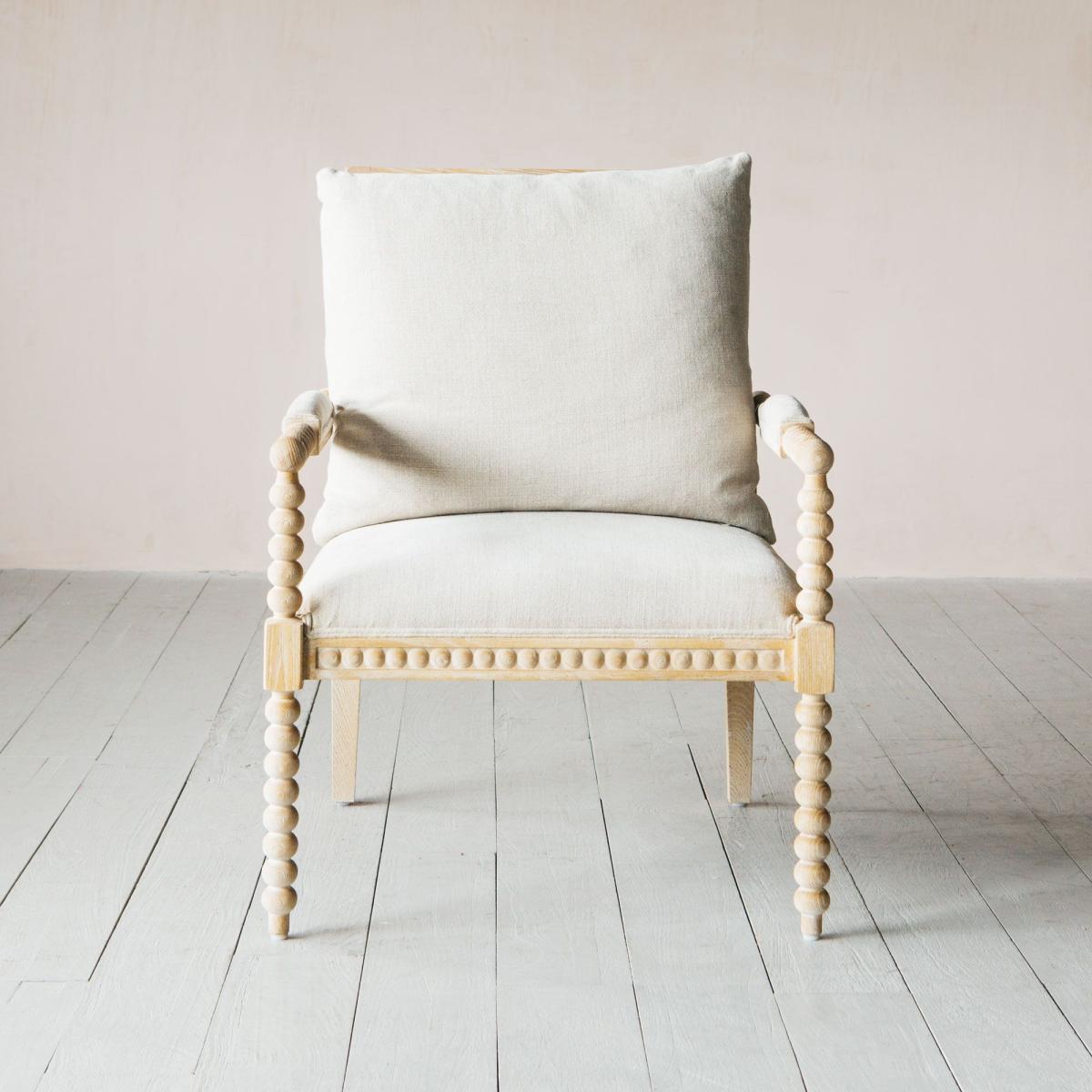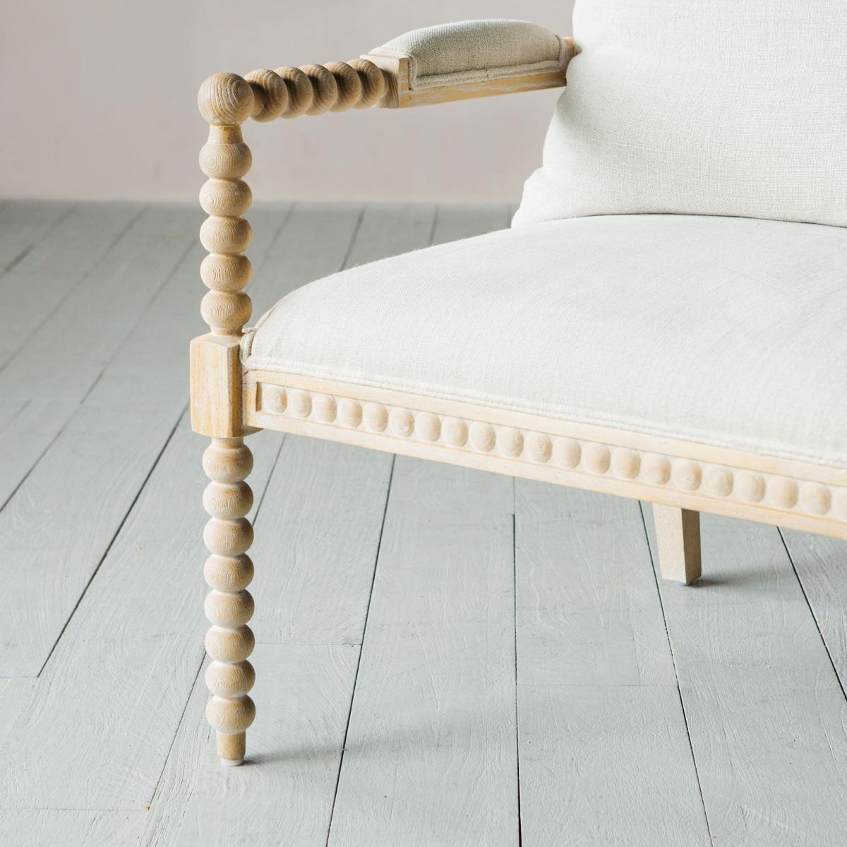 A romantic new take on an antique style, ash wood is hand turned to create a bead effect and finished in a delicate white wash to compliment the linen seating.