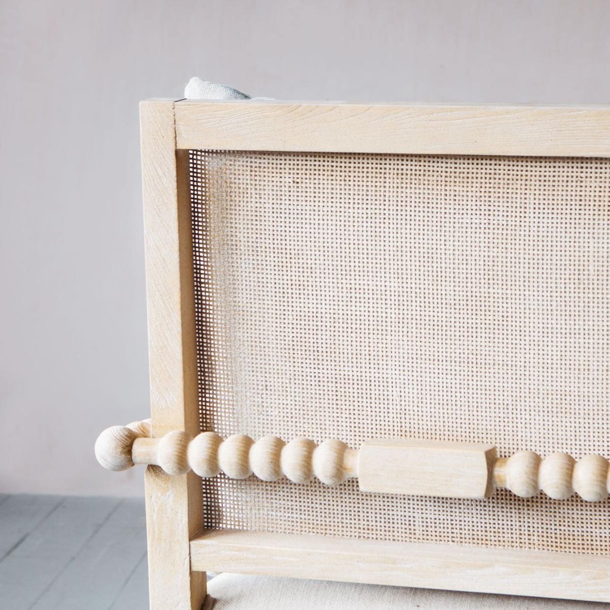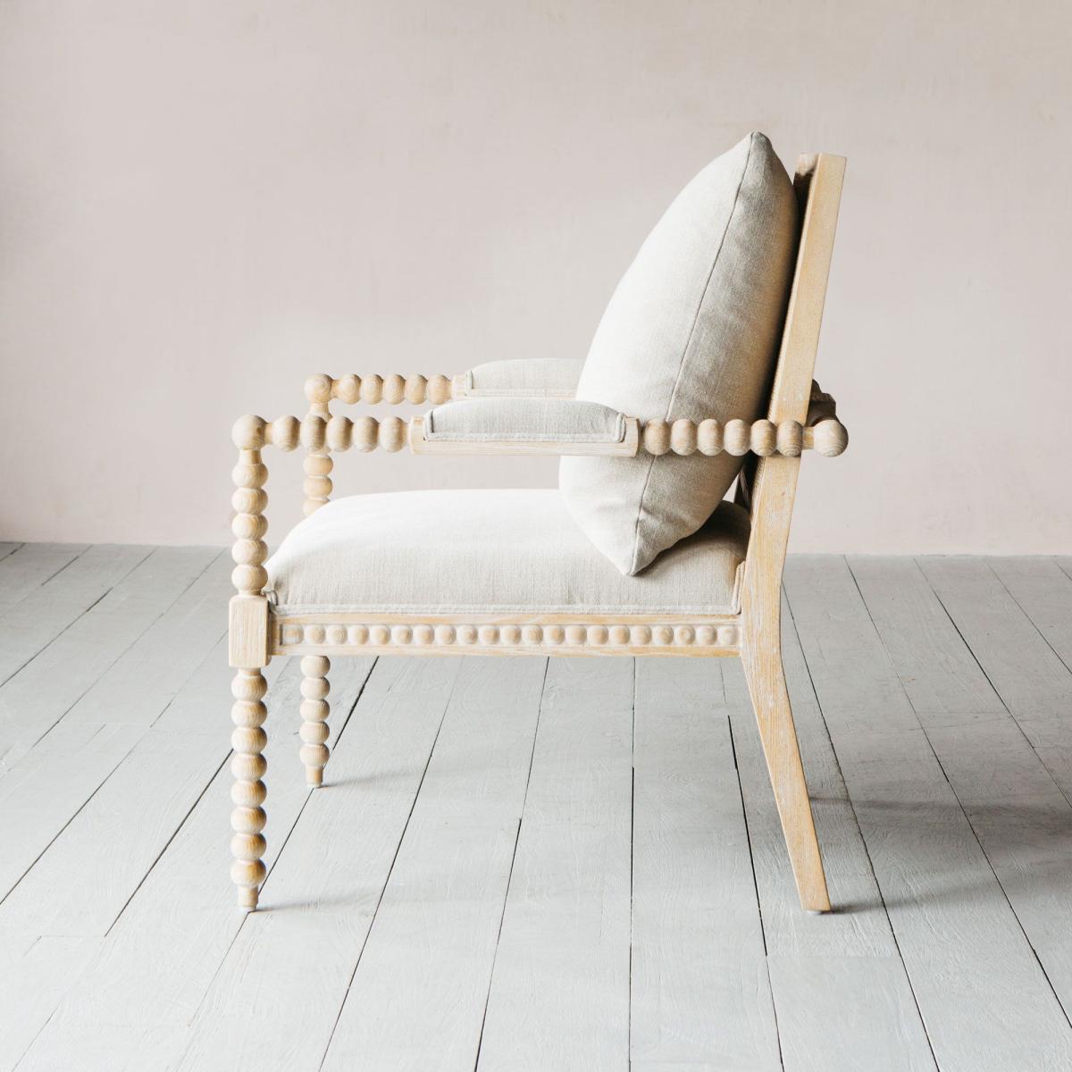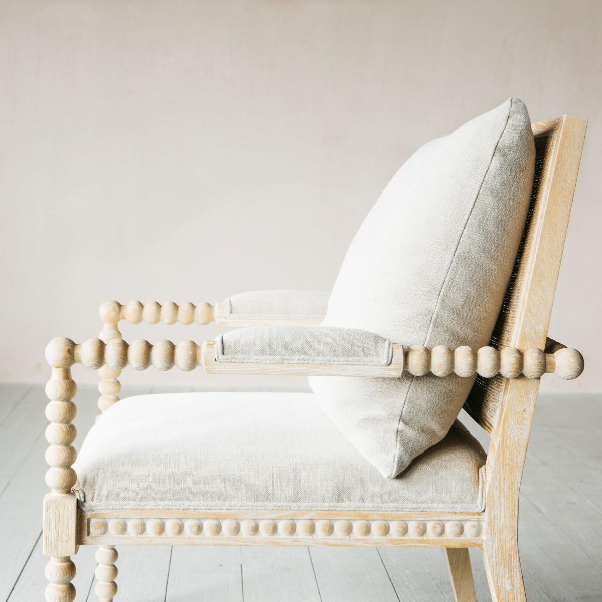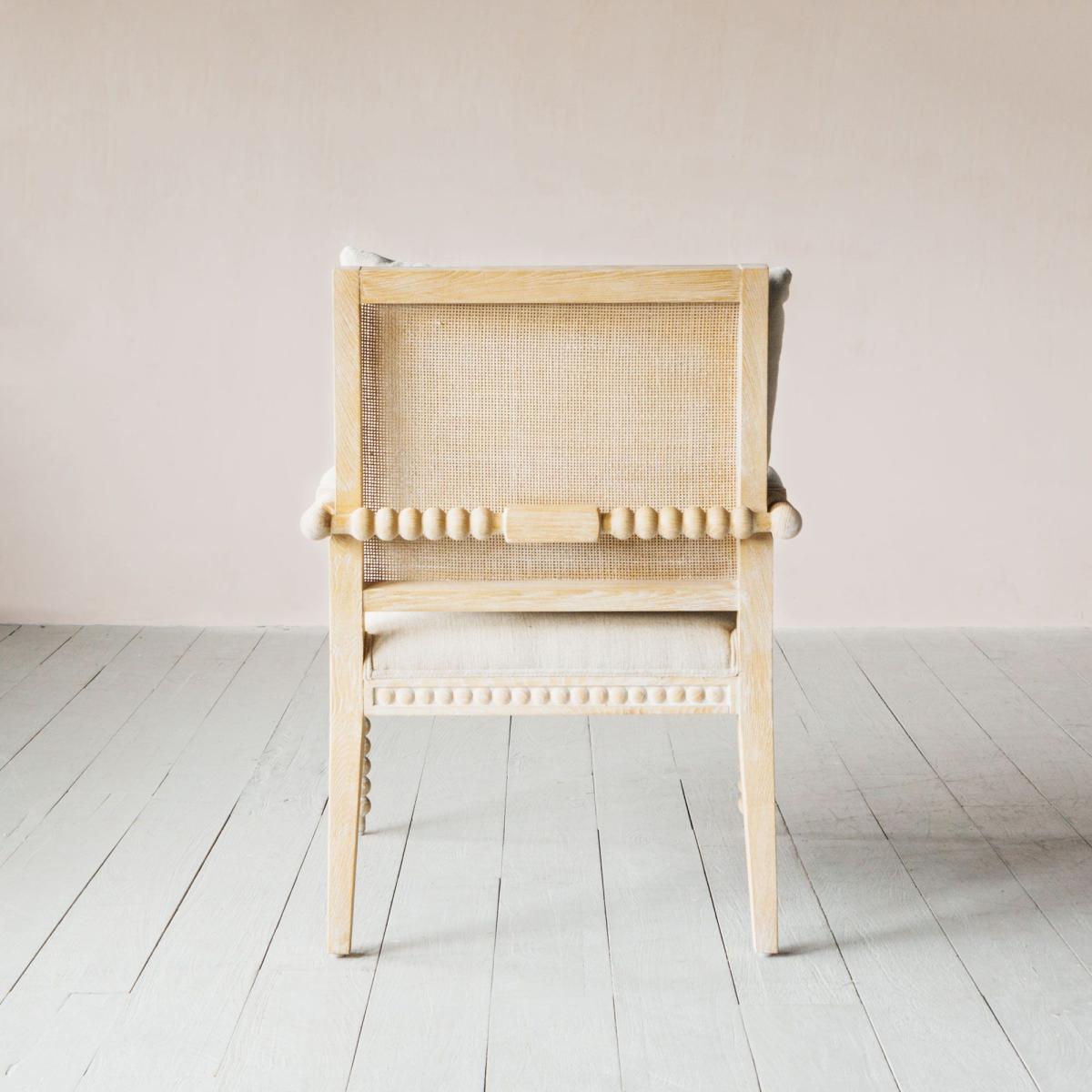 A romantic new take on an antique style, ash wood is hand turned to create a bead effect and finished in a delicate white wash to compliment the linen seating.