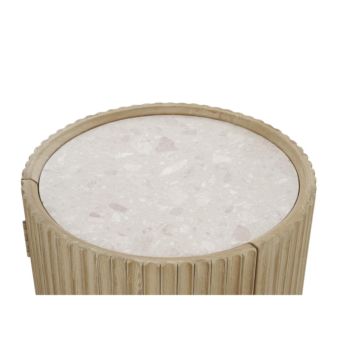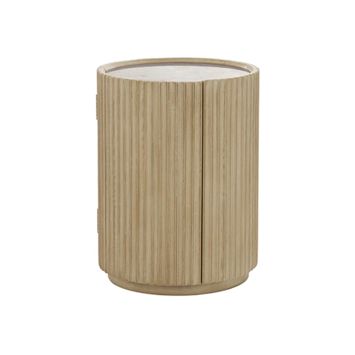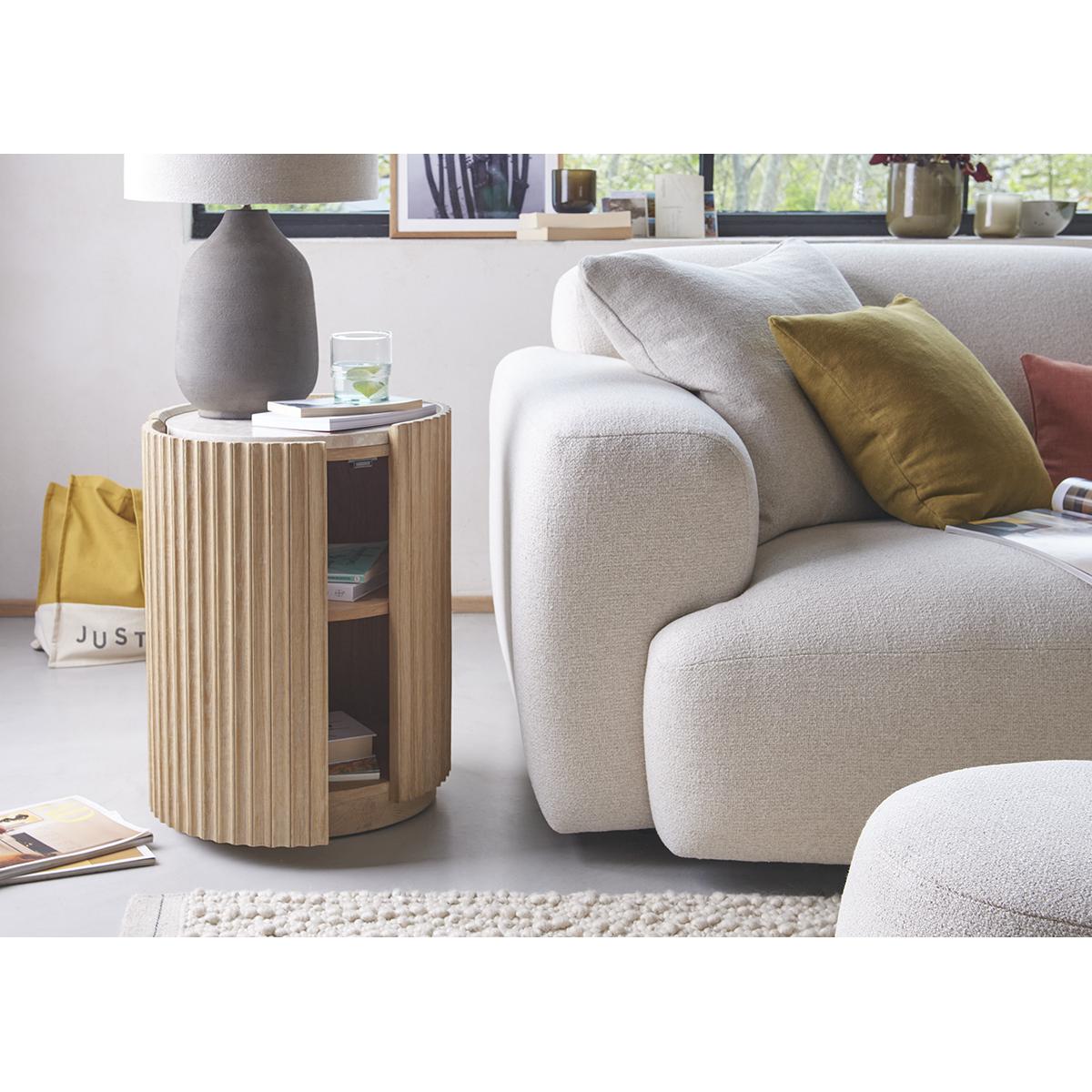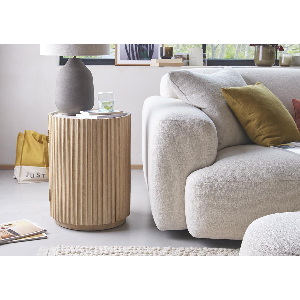 The bobbin side table is a fantastic choice for adding textured interest to both modern and more traditional interiors. I love its cylindrical shape combined with the ribbed detailing, which lends a subtle tactile quality. It works particularly well in neutral, minimalist schemes where its natural, understated material can stand out, or in eclectic spaces where it adds an interesting contrast. Practical styling tips include using it to hold a small lamp or as a bedside table, topped with a few books or a plant for a balanced, lived-in look. Its compact size makes it versatile, perfect for tight spaces or as an accent piece in a larger arrangement.