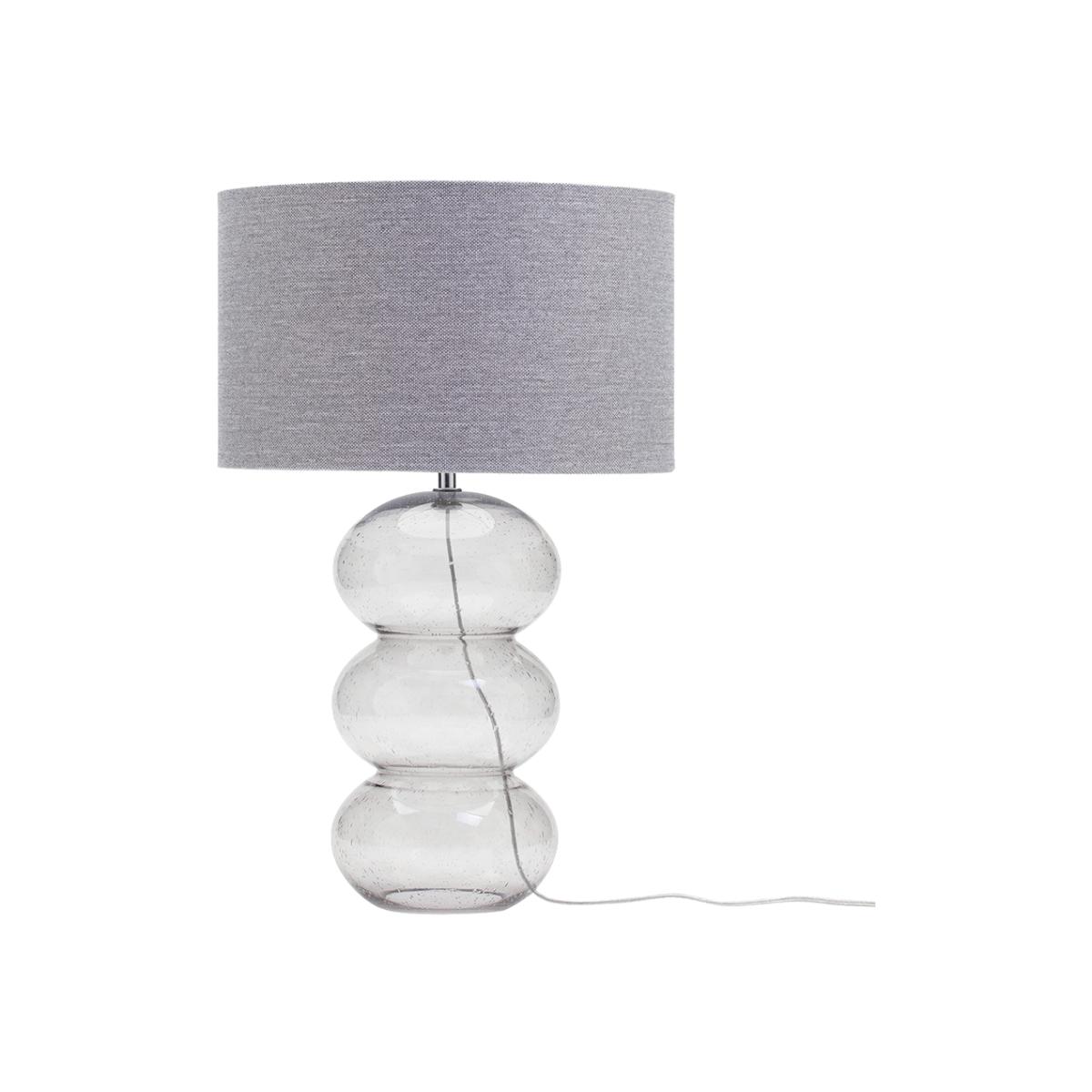 Every interior can utilise table lamps to its advantage as the versatile, manoeuvrable nature allows them to be placed on any side table or cabinet, giving soft ambient illumination to the space. Our unique Bobble table lamp has a blown glass structure, which is finished in a smoke effect for a contemporary twist. The 3 glass orbs are complemented by a grey fabric shade with a black and white slub, offering a soothing glow to the interior. smoked glass gives a sophisticated contemporary look to your home; grey textured shade diffuses light for a softer, warmer glow; perfect as a bedside lamp or on a side table.
