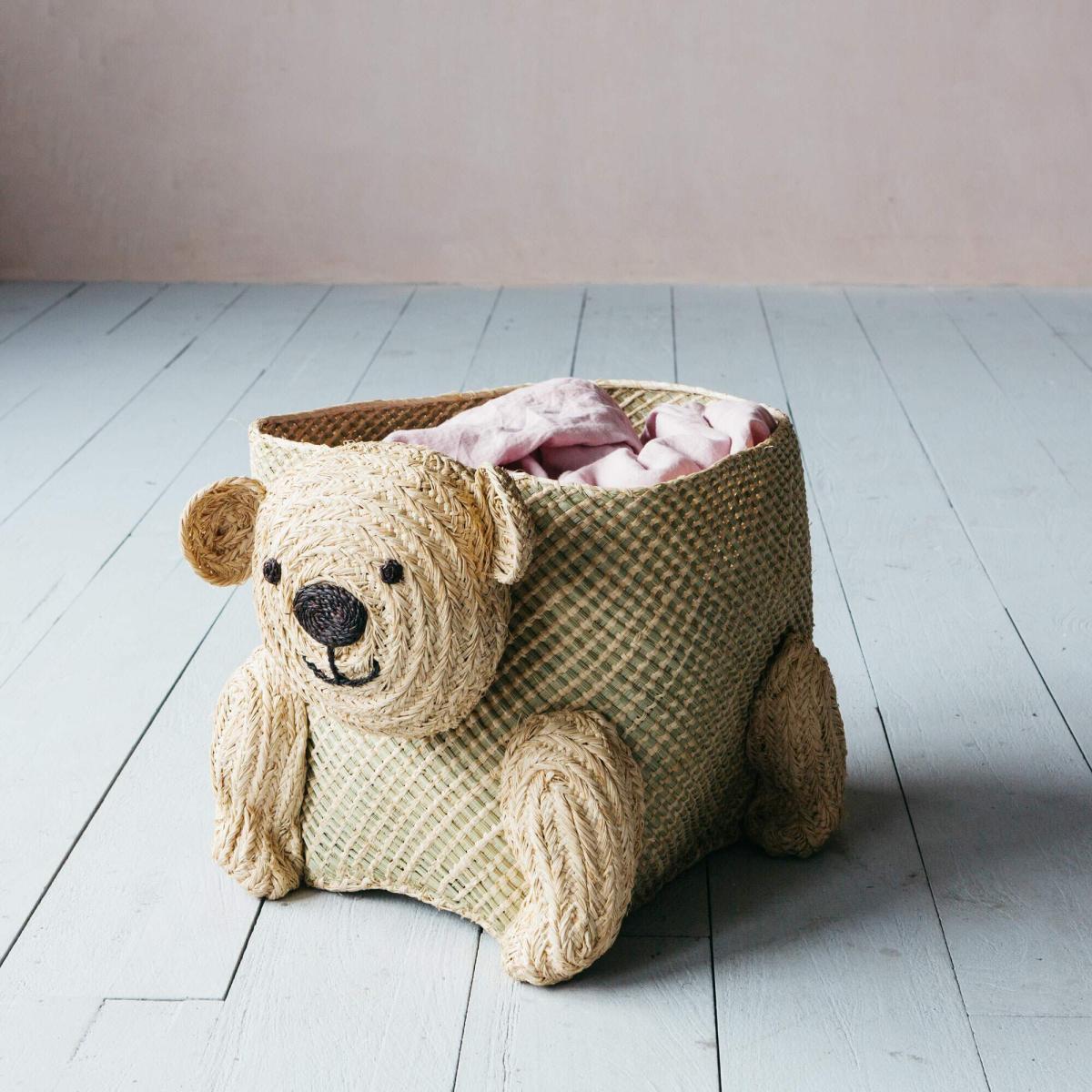 I love this bear-themed basket for its playful yet versatile appeal, making it perfect for nurseries or children's bedrooms. It works particularly well in cosy, lived-in interiors that prioritise tactile textures and soft colours. Practical styling tips include using it as a storage solution for toys or laundry, adding a touch of whimsy to the room without sacrificing functionality. Position it in a corner or by a bed to keep essentials close at hand, and consider mixing with other natural fibre baskets or storage bins for a layered, organised look. Its charming design injects personality into any space while serving a useful purpose.