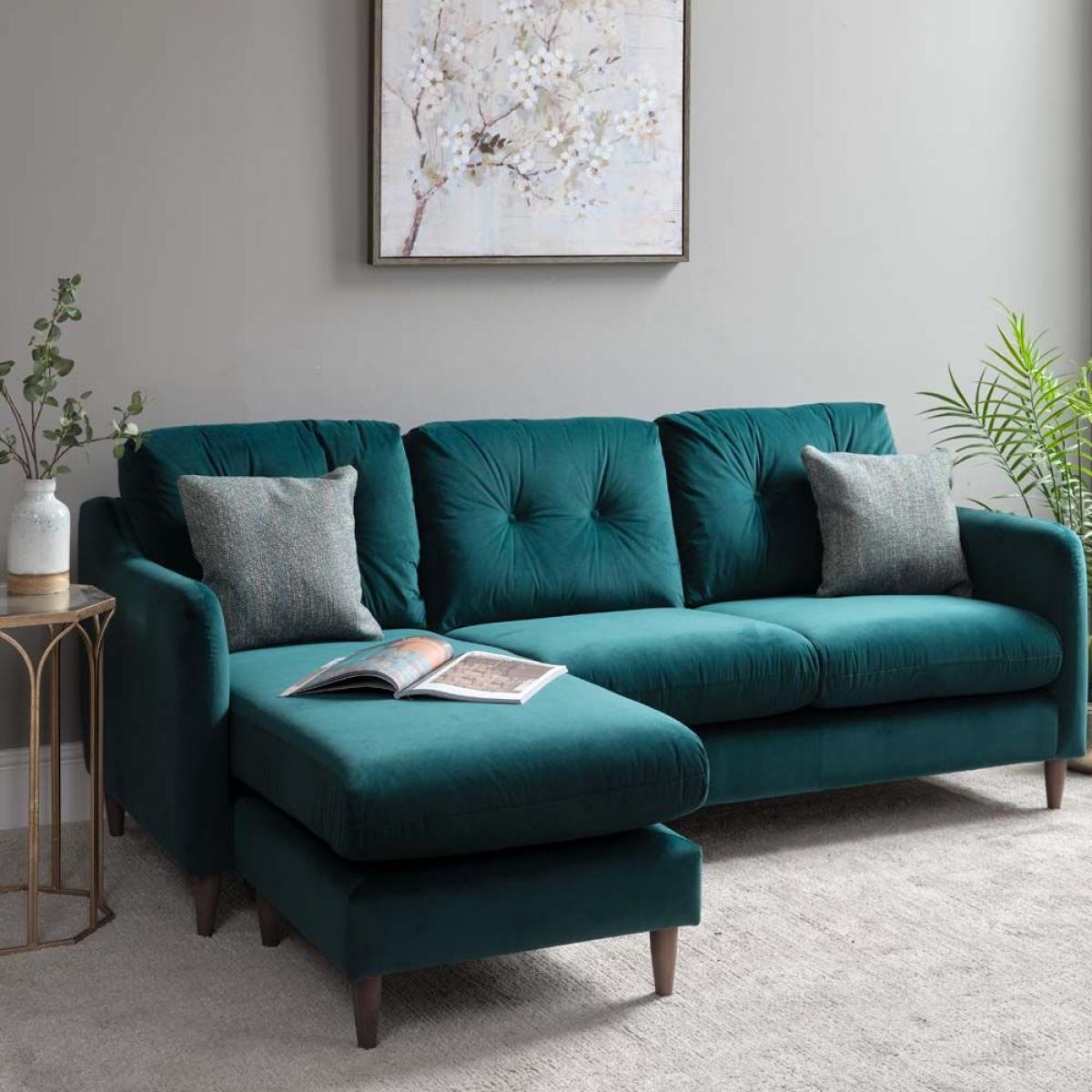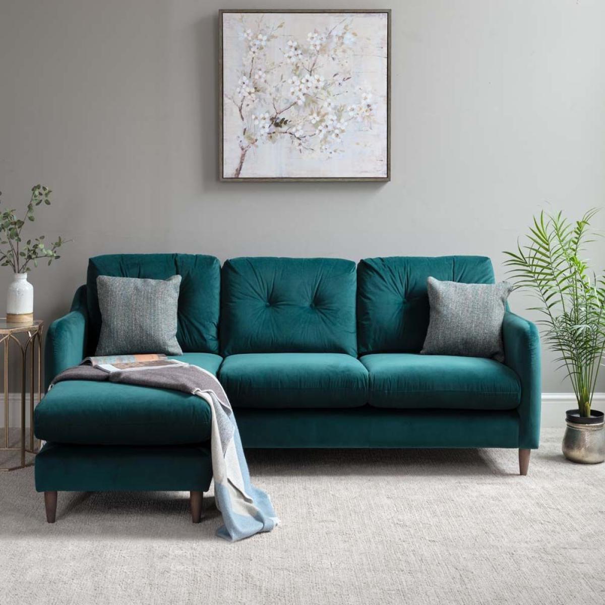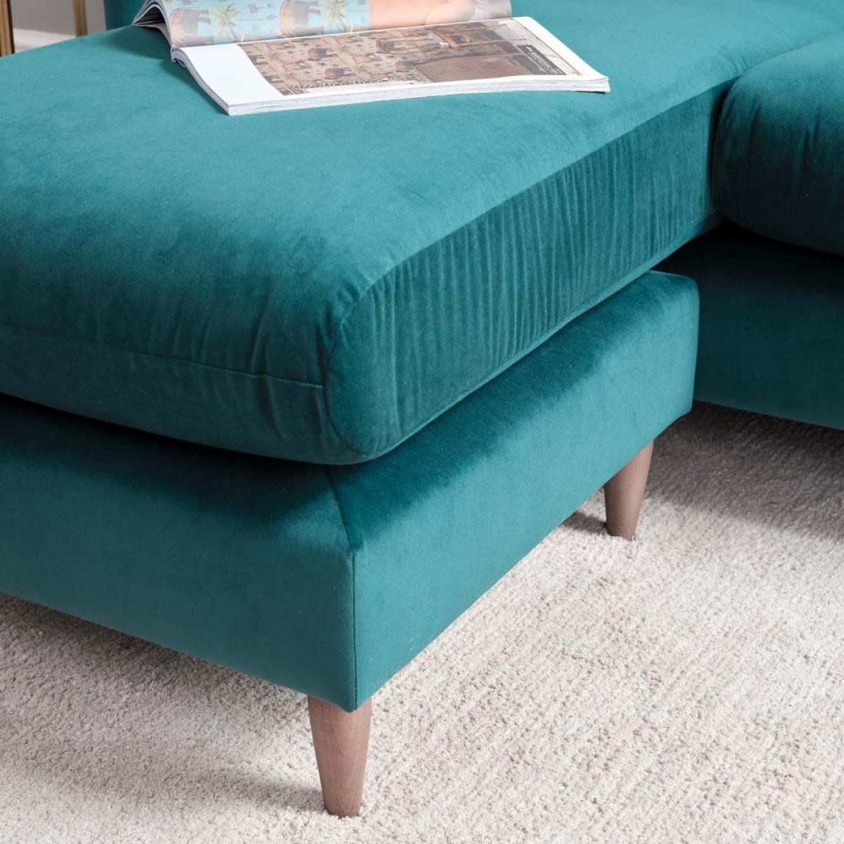 The Bobby Corner Sofa is perfect for getting cosy with your feet up and would be an excellent addition to any home. In a beautiful sumptuous velvet and with stunning curved armrests give this corner sofa a modern twist, however the button back cushion detailing offer a traditional nod to allow this sofa to suit many home styles. Dimensions: W204cm x H73cm x D86cm, Chaise Depth: 122cm, Seat height: 48cm. Detached run up stool can be easily switched to have the chaise either left or right hand side. Solid hardwood legs with a vintage stain Simple self assembly
