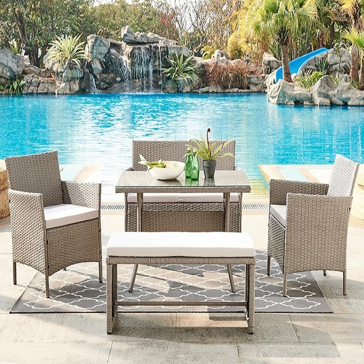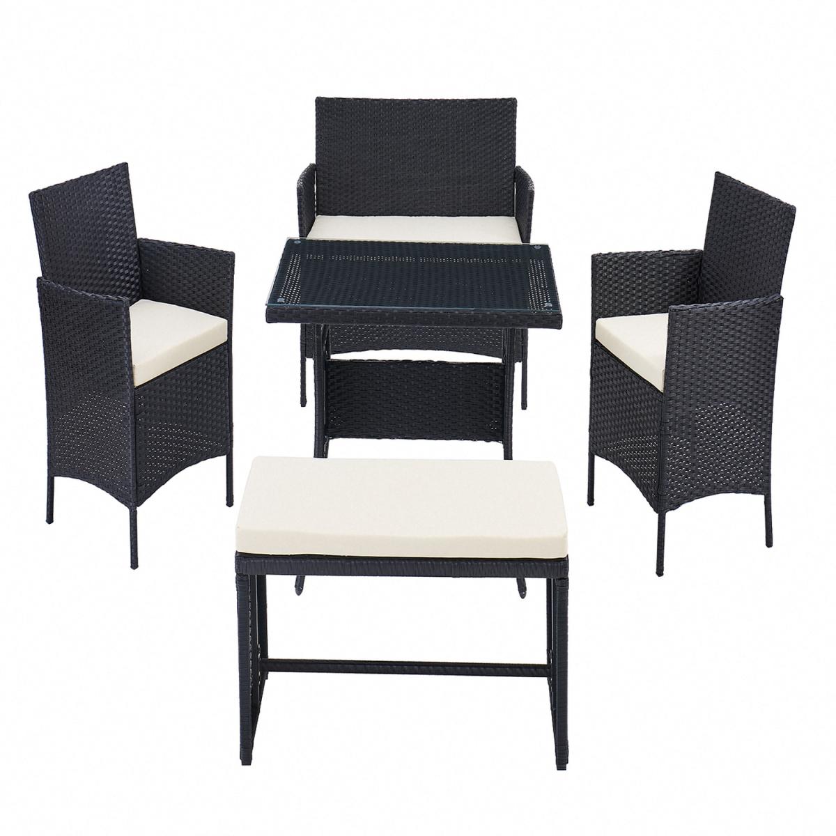 Introducing Boca five piece garden furniture set. It's is completed with a matching rattan glass dining table and foam filled polyester cushions. The cushion covers are removable and come with zips. This set would make the perfect addition to your home and your garden. It is perfect for sitting comfortably on a nice day or night. only the 5 piece option comes with the bench! This garden set is durable and for outdoor use all year round in mild to warm weather. Although the cushions are weather-proof, we do not advise leaving them out in adverse weather conditions for long periods of time. We recommend the whole set be moved indoor over the winter. While the cushions have zips, we advise against removing the covers because they are challenging to put back on. If necessary, apply upholstery shampoo and store cushions indoors while not in use.