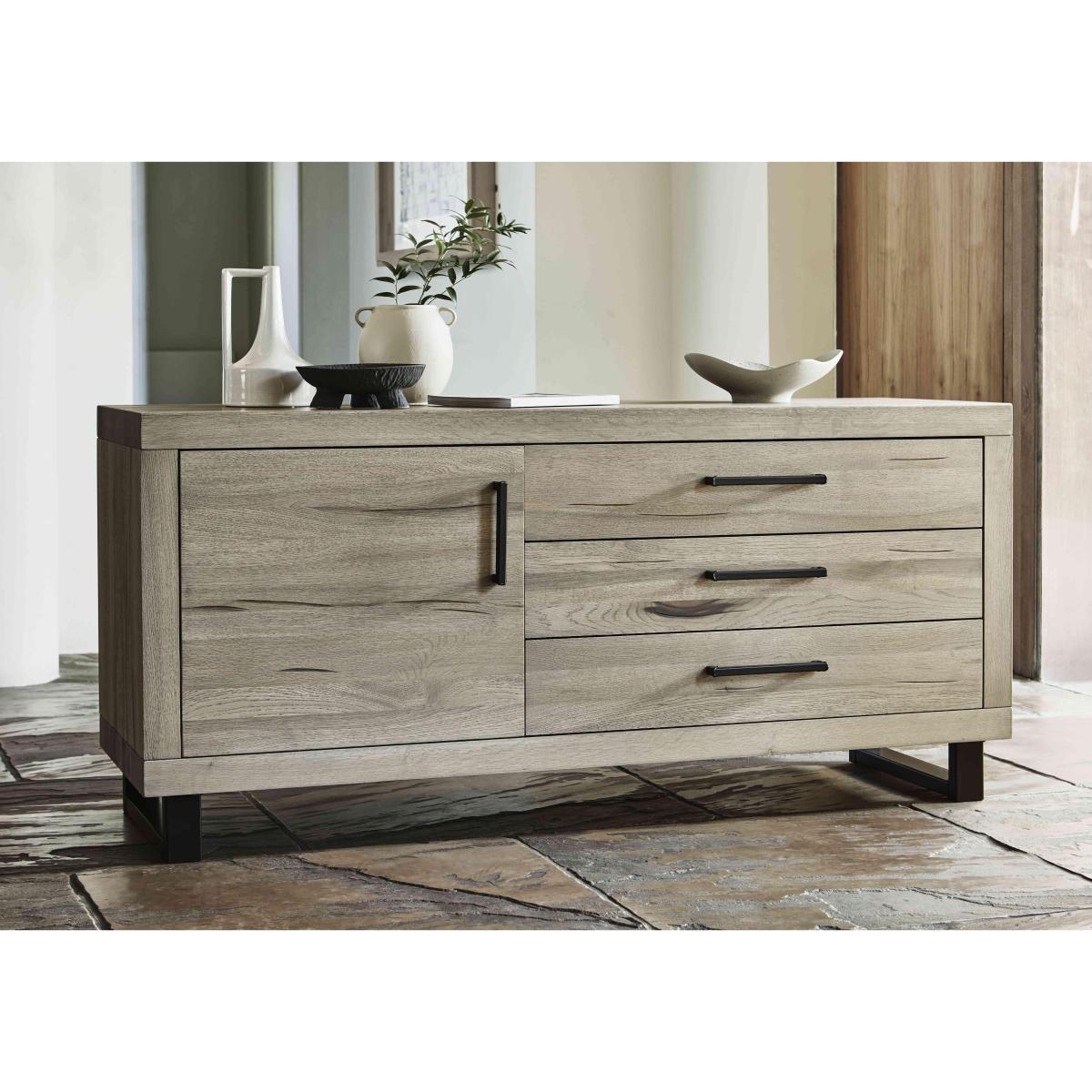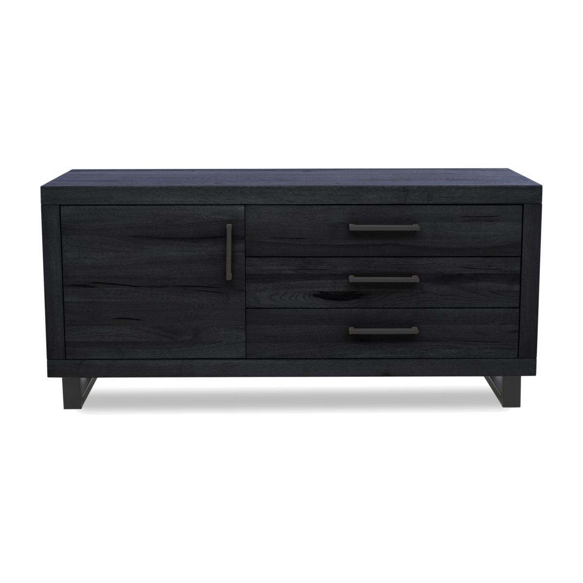 The Terra range combines the warmth of rustic style with the urban edge of industrial design – and it does it beautifully. Expertly handcrafted from solid natural oak, every piece boasts impeccable craftsmanship with knots and markings on full display. Its distinctive black metal legs and natural warmth make this a statement range for design-led interiors and relaxed dining spaces alike. And with a handcrafted padded bench or soft, faux leather cantilevered chairs, there’s plenty of comfy perches to choose from. Simply sit back, tuck in and enjoy your meal in comfort. The Terra range is fully bespoke with a wide range of options for table top edges, thickness, size and colour, alongside several striking leg options. Create your unique design today. Even if yours is a smaller dining room you can still enjoy bold industrial style with this compact 1-door 3-drawer oak sideboard. Handmade, it has a surprising amount of storage space. Why you'll love it This smaller industrial 1-door 3-drawer sideboard has plenty of roomy storage. At last – a compact version of our popular Bodahl Terra range. Handcrafted in 100% solid oak in a choice of colours and finishes. A protective matt lacquer makes this an enduring piece. Black metal U-shaped legs. Soft-closing drawers and cupboard doors. Only at Furniture Village. This 1-door 3-drawer sideboard is part of the Bodahl Compact Terra collection. What you need to know Cupboard has 2 adjustable shelves. Made of solid oak and metal. Oak top may display knots, saw marks and variations in tone and texture. Metal legs are finished by hand and may show marks. Use a clean, damp cloth to clean the oak top.