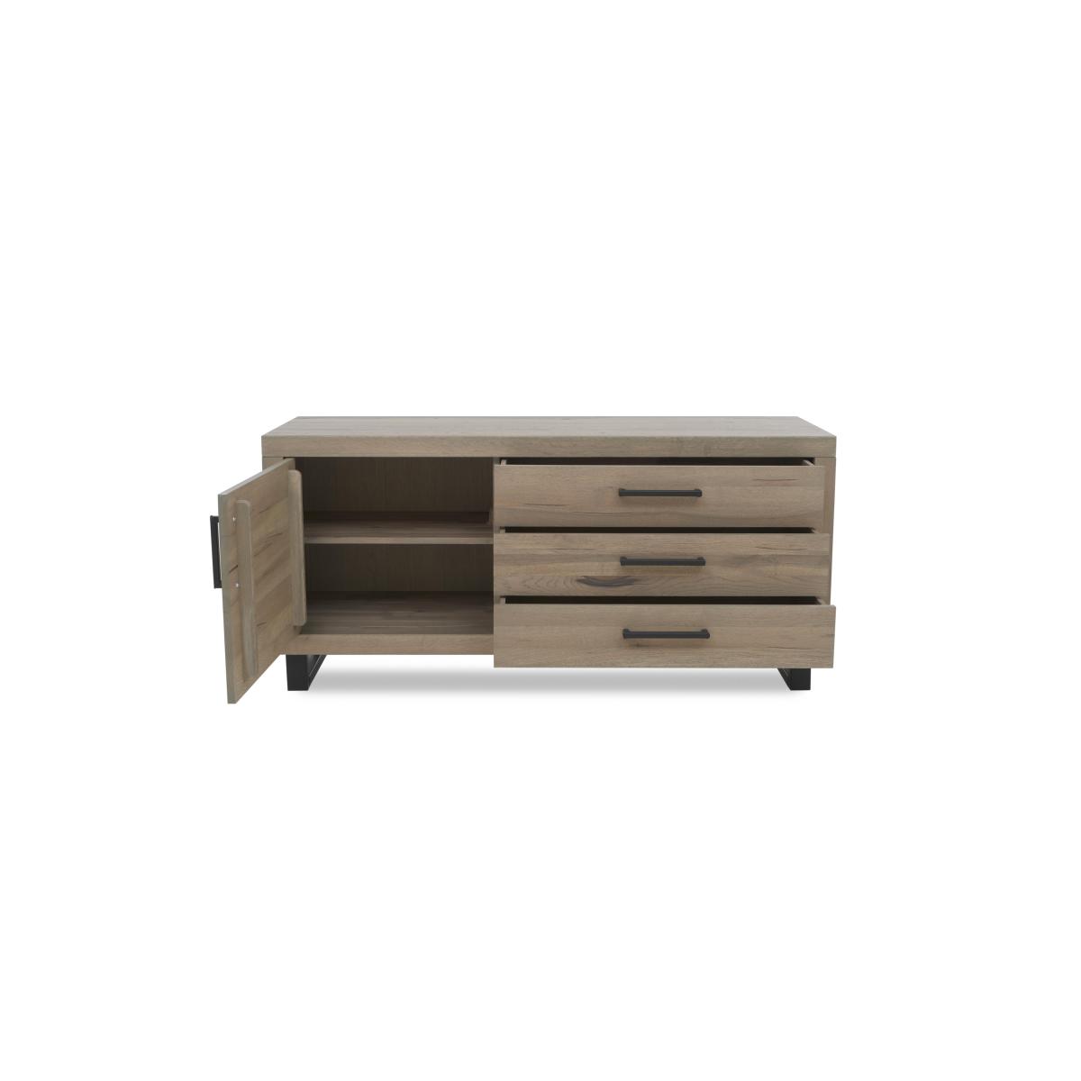 The Terra range combines the warmth of rustic style with the urban edge of industrial design – and it does it beautifully. Expertly handcrafted from solid natural oak, every piece boasts impeccable craftsmanship with knots and markings on full display. Its distinctive black metal legs and natural warmth make this a statement range for design-led interiors and relaxed dining spaces alike. And with a handcrafted padded bench or soft, faux leather cantilevered chairs, there’s plenty of comfy perches to choose from. Simply sit back, tuck in and enjoy your meal in comfort. The Terra range is fully bespoke with a wide range of options for table top edges, thickness, size and colour, alongside several striking leg options. Create your unique design today. Even if yours is a smaller dining room you can still enjoy bold industrial style with this compact 1-door 3-drawer oak sideboard. Handmade, it has a surprising amount of storage space. Why you'll love it This smaller industrial 1-door 3-drawer sideboard has plenty of roomy storage. At last – a compact version of our popular Bodahl Terra range. Handcrafted in 100% solid oak in a choice of colours and finishes. A protective matt lacquer makes this an enduring piece. Black metal U-shaped legs. Soft-closing drawers and cupboard doors. Only at Furniture Village. This 1-door 3-drawer sideboard is part of the Bodahl Compact Terra collection. What you need to know Cupboard has 2 adjustable shelves. Made of solid oak and metal. Oak top may display knots, saw marks and variations in tone and texture. Metal legs are finished by hand and may show marks. Use a clean, damp cloth to clean the oak top.