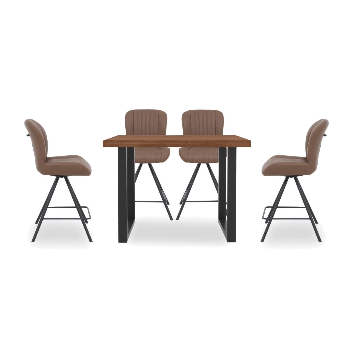 For style and versatility, this bar table set is the complete package. The oak bar table has a stunning natural raw edge – a mark of true authenticity – and the set includes four swivel bar stools. Why you'll love it Perfect size, perfect style – this industrial bar table set is designed for compact spaces. Handcrafted bar table has a solid oak top in a choice of colours and finishes. A protective matt lacquer makes this an enduring piece. Striking natural raw edges and black metal U-shaped legs. This bar table set comes with 4 luxuriously cushioned bar stools. Soft faux leather upholstery in cognac. Bar stools have swivel bases and black metal legs. Only at Furniture Village. This bar table set is part of the Bodahl Compact Terra collection. What you need to know Bar stools have metal legs and footrests. Foam cushioning. Bar table is made of solid oak and metal. This 140 cm x 80 cm bar table seats 4 to 6. Table edge depth is 6 cm. Oak top may display knots, saw marks and variations in tone and texture. Metal legs are finished by hand and may show marks. Use a clean, damp cloth to clean the oak top.