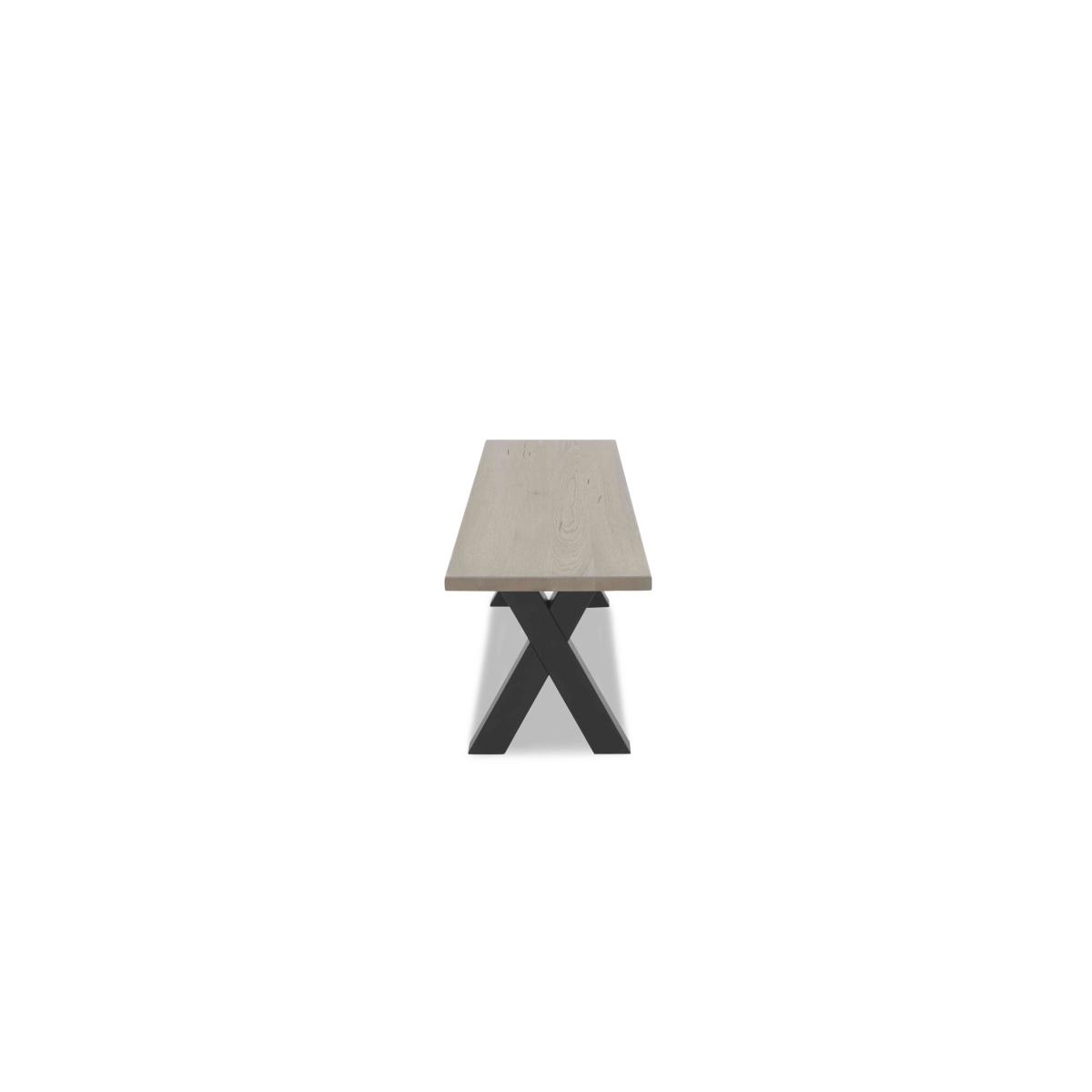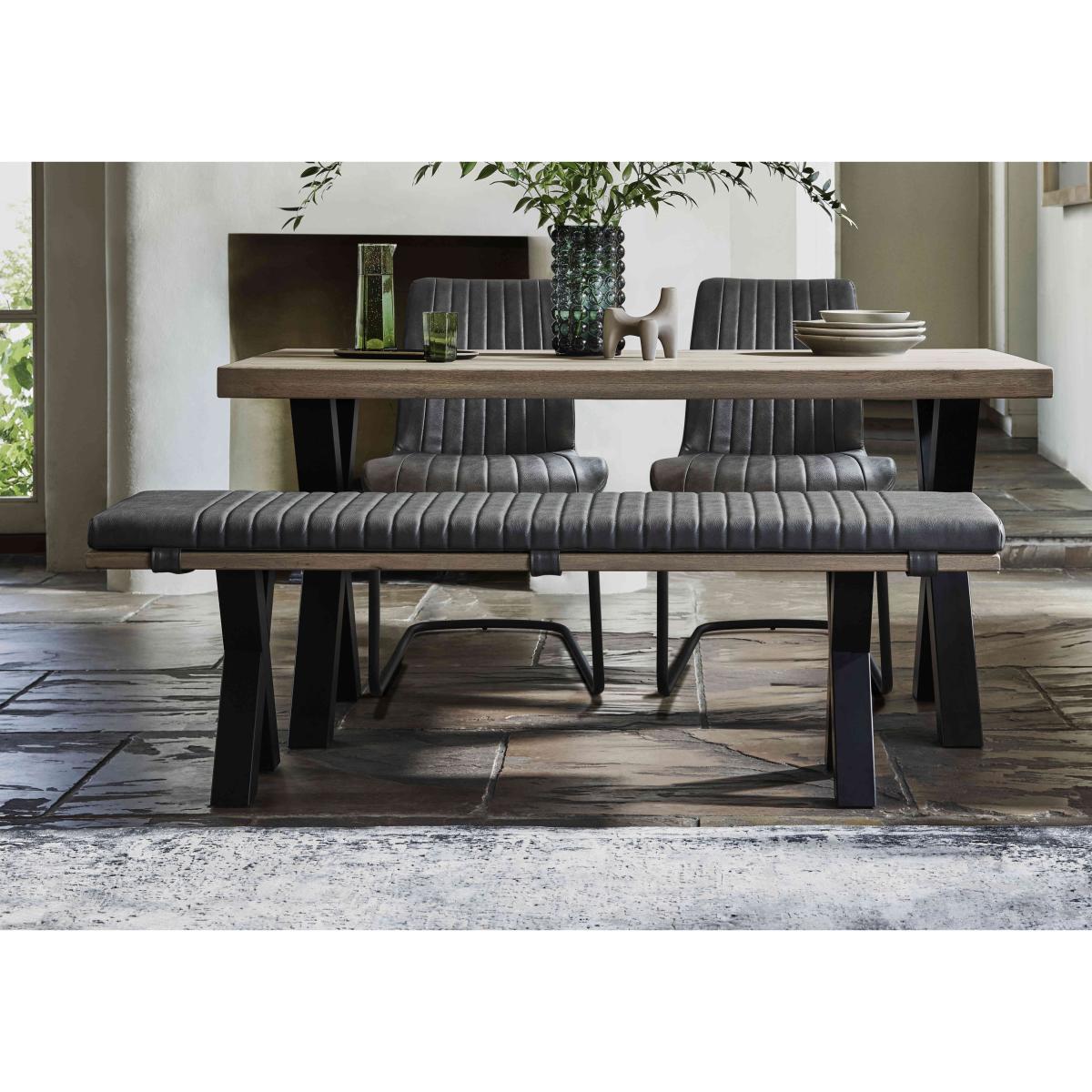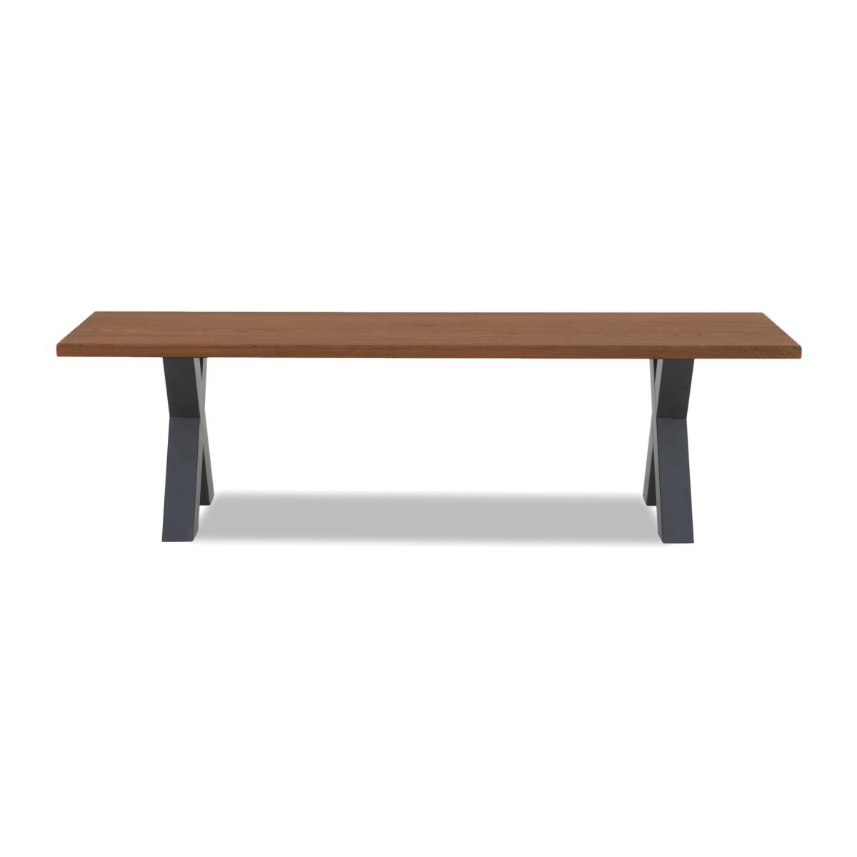 The Terra range combines the warmth of rustic style with the urban edge of industrial design – and it does it beautifully. Expertly handcrafted from solid natural oak, every piece boasts impeccable craftsmanship with knots and markings on full display. Its distinctive black metal legs and natural warmth make this a statement range for design-led interiors and relaxed dining spaces alike. And with a handcrafted padded bench or soft, faux leather cantilevered chairs, there’s plenty of comfy perches to choose from. Simply sit back, tuck in and enjoy your meal in comfort. The Terra range is fully bespoke with a wide range of options for table top edges, thickness, size and colour, alongside several striking leg options. Create your unique design today. A dining bench seats more people in less space and takes up less room in a smaller dining space. This one by Bodahl one has a solid oak top and X-shaped metal legs. Why you'll love it This versatile industrial oak dining bench fits perfectly in dining rooms of all sizes. At last – a compact version of our popular Bodahl Terra range. Handcrafted 100% solid oak top in a choice of colours and finishes. A protective matt lacquer makes this an enduring piece. Black metal X-shaped legs. Available length 160cm Make it even more stylish with a bench pad, available separately. Only at Furniture Village. This dining bench is part of the Bodahl Compact Terra collection. What you need to know Made of solid oak and metal. 160 cm bench seats 3 adults. Oak top may display knots, saw marks and variations in tone and texture. Metal legs are finished by hand and may show marks. Use a clean damp cloth to clean the oak top.