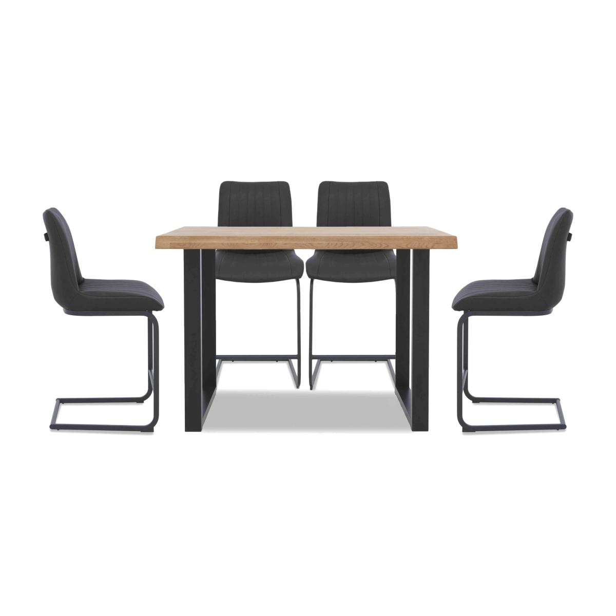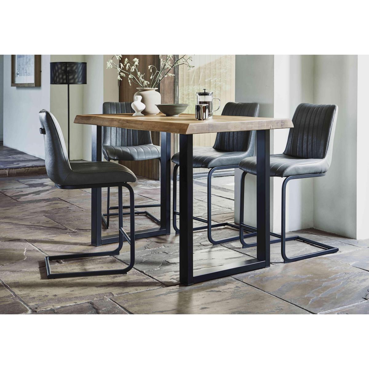 The Terra range combines the warmth of rustic style with the urban edge of industrial design – and it does it beautifully. Expertly handcrafted from solid natural oak, every piece boasts impeccable craftsmanship with knots and markings on full display. Its distinctive black metal legs and natural warmth make this a statement range for design-led interiors and relaxed dining spaces alike. And with a handcrafted padded bench or soft, faux leather cantilevered chairs, there’s plenty of comfy perches to choose from. Simply sit back, tuck in and enjoy your meal in comfort. The Terra range is fully bespoke with a wide range of options for table top edges, thickness, size and colour, alongside several striking leg options. Create your unique design today. You’ll turn heads when you turn your kitchen corner into a cool dining area with this bar dining set by Bodahl. We love the raw edge bar table and four grey bar stools. Why you'll love it The grey upholstery of the stools in this industrial bar table set works so well. At last – a compact version of our popular Bodahl Terra range. Handcrafted 100% solid oak table top in a choice of colours and finishes. A protective matt lacquer makes this an enduring piece. Striking natural raw edges and black metal U-shaped legs. Bar table is available in 2 sizes. 4 bar stools with fluted faux leather upholstery in on-trend grey. Black metal cantilever bases. Seat back handles for manoeuvrability. Only at Furniture Village. This bar table set is part of the Bodahl Compact Terra collection. What you need to know Bar stools have metal bases and foam cushioning. Bar table is made of solid oak and metal. 140 x 80 cm bar table seats 4 to 6. 160 x 90 cm bar table seats 6 to 8. Table edge depth is 6 cm. Oak top may display knots, saw marks and variations in tone and texture. Metal legs are finished by hand and may show marks. Use a clean, damp cloth to clean the oak top.