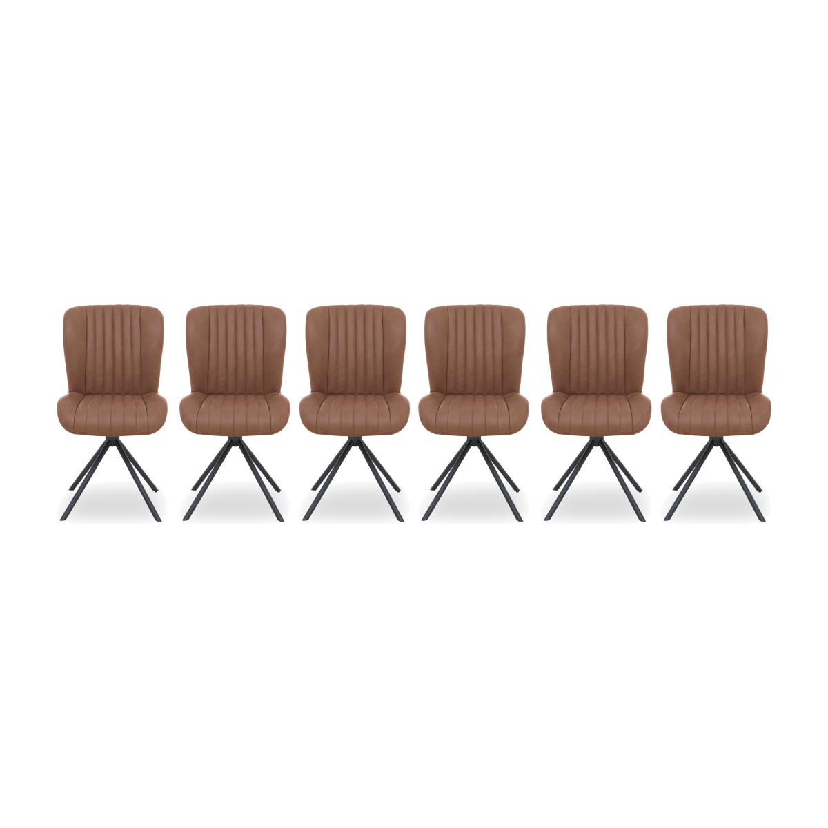 Here’s an easy way to bring well-crafted urban style to your dining room. These Bodahl swivel-base dining chairs are beautifully cushioned and upholstered. Set of six. Why you'll love it Cool industrial style for modern dining spaces. Soft faux leather upholstery in a choice of colours. Beautifully cushioned and with stylish stitching. Swivel bases with black metal legs. Also available in sets of 2 and 4 dining chairs. Only at Furniture Village. This set of 6 swivel dining chairs is part of the Bodahl Compact Terra collection. What you need to know Metal frames and legs. Foam cushioning.