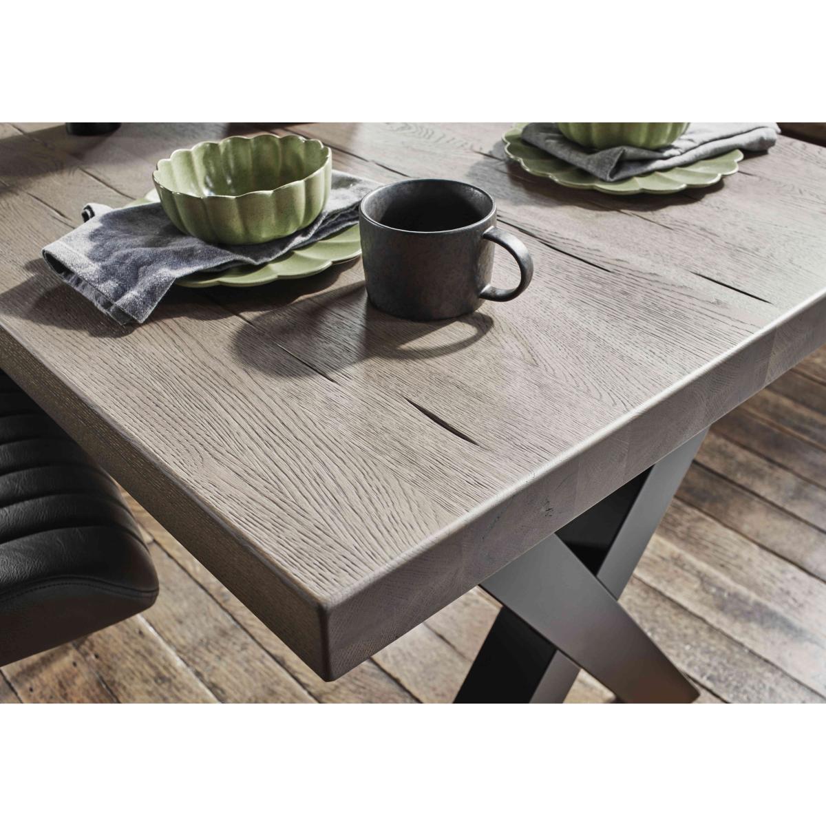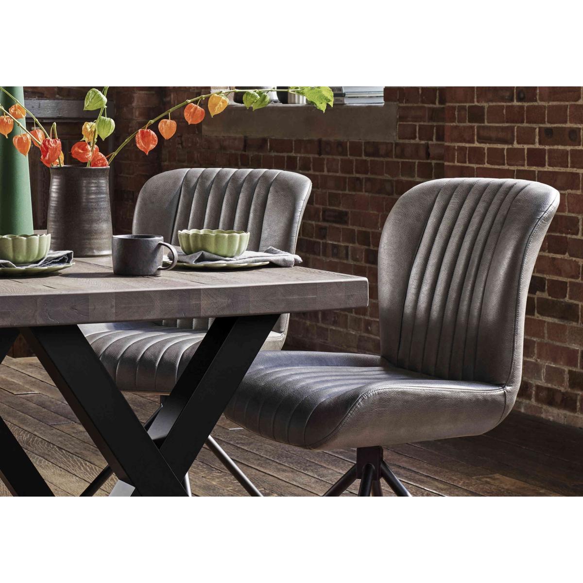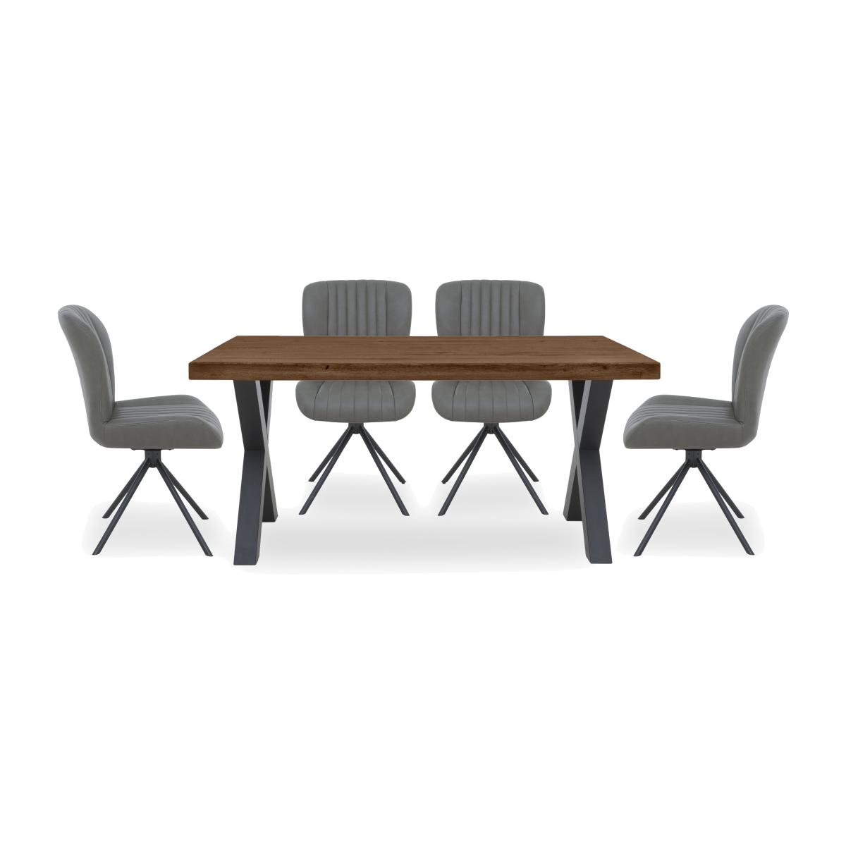 Compact yet with plenty of room to seat up to eight, this on-trend dining set comprises a solid oak dining table and four swivel dining chairs in ever-fashionable grey. Why you'll love it Perfect size, perfect style – this industrial dining set is designed for compact spaces. Handcrafted dining table has a solid oak top in a choice of colours and finishes. A protective matt lacquer makes this an enduring piece. Black metal X-shaped legs. This dining set comes with 4 luxuriously cushioned dining chairs. Soft faux leather upholstery in grey. Chairs have swivel bases and black metal legs. The dining table is extendable – extra leaves are available separately. Only at Furniture Village. This dining set is part of the Bodahl Compact Terra collection. What you need to know Dining chairs have metal frames and foam cushioning. Dining table is made of solid oak and metal. 160 x 90 cm dining table seats 6 to 8. Table edge depth is 6 cm. Table can accommodate 2 extension leaves (not included) to seat 4 more people. Oak top may display knots, saw marks and variations in tone and texture. Metal legs are finished by hand and may show marks. Use a clean, damp cloth to clean the oak top.